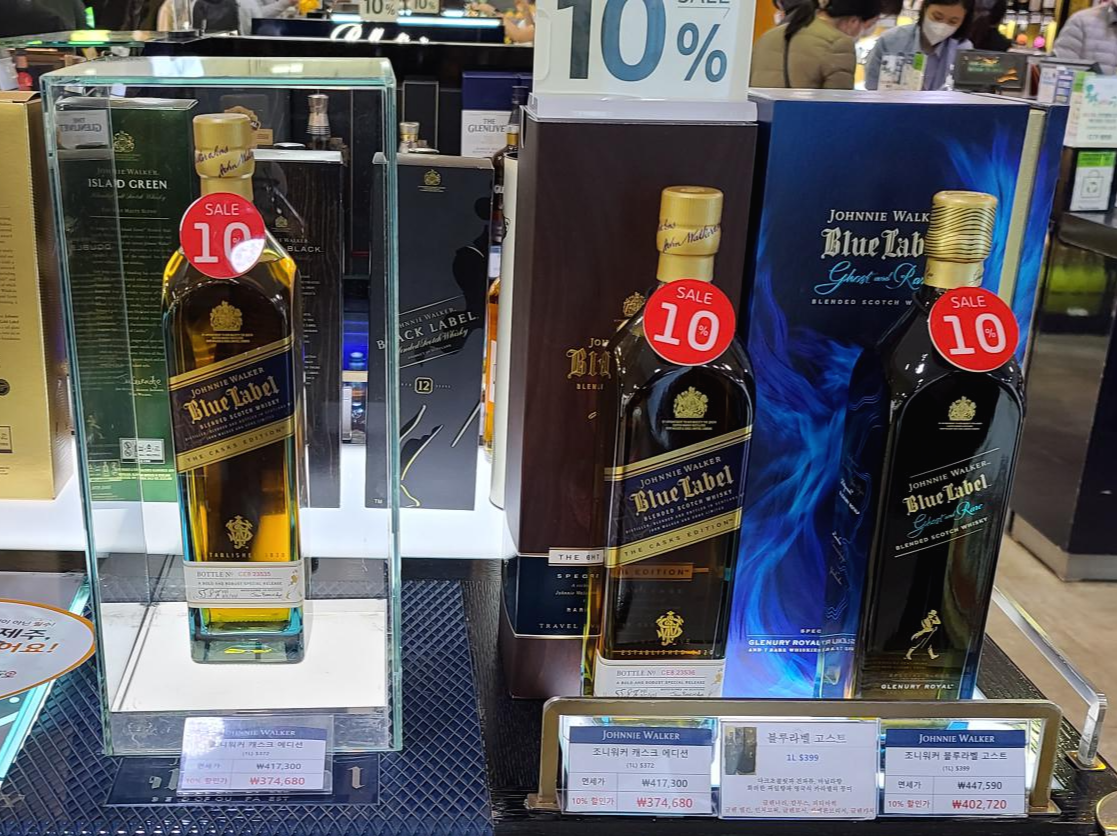 다음 진열대에는 조니워커 블루가 캐스크에디션으로 진열되어 있습니다. 높은 가격때문인지 10% 할인행사를 실시하는 모습이 보입니다.