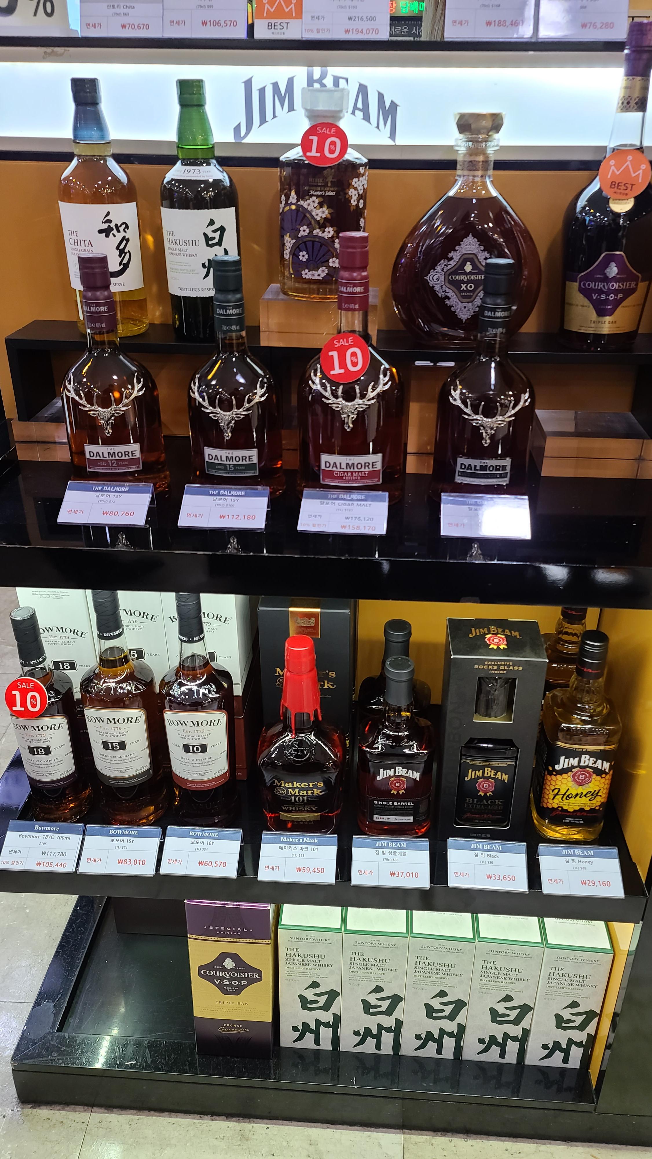 산토리 치타와 하쿠슈, 히비키, 짐빔, 메이커스마크 일본위스키 시리즈 및 킹스맨 위스키로 유명한 달모어 그리고 보모어 그리고 상단에는 꾸브와지에 꼬냑이 보입니다.