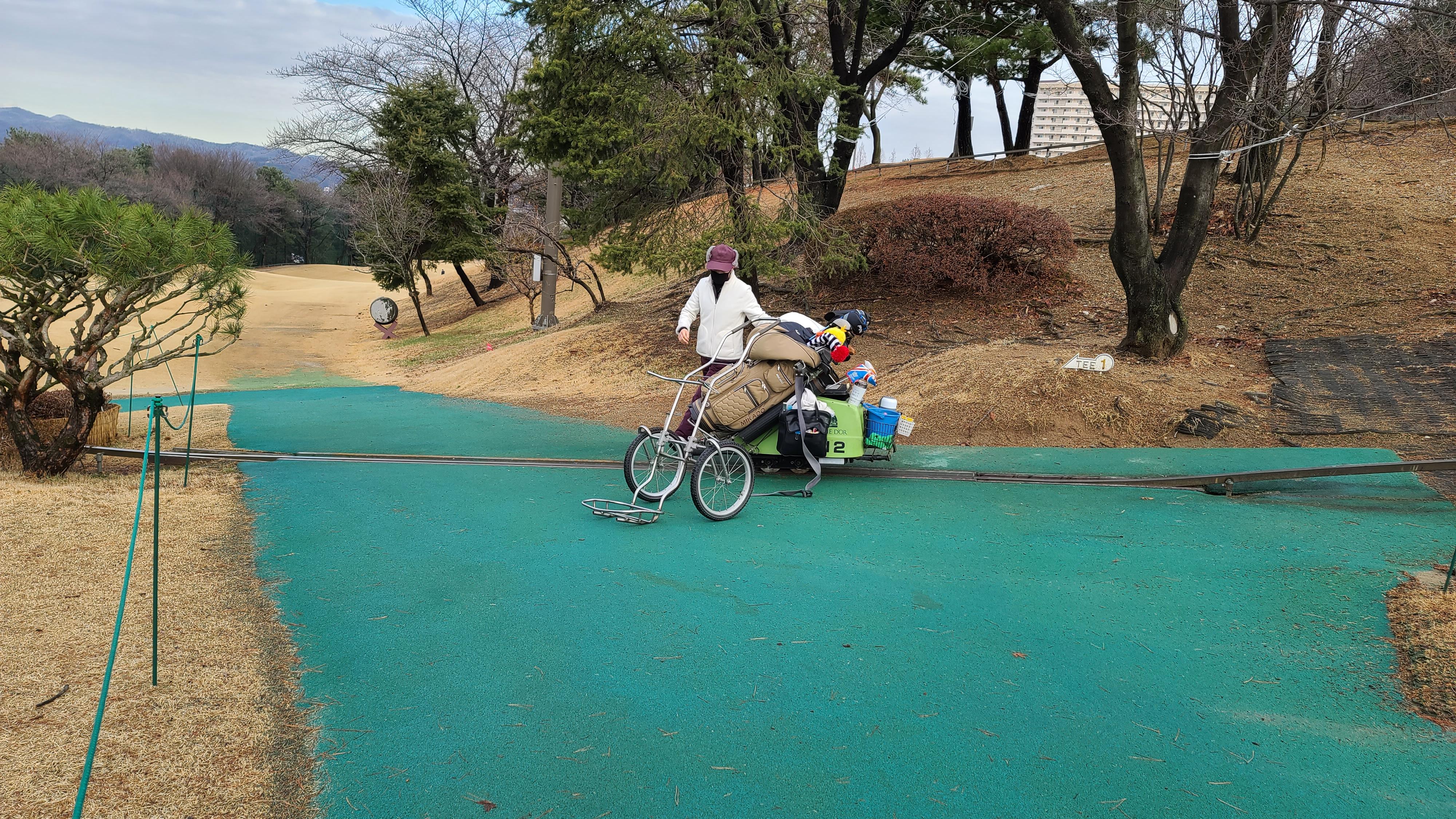 라비돌컨트리클럽은 카트가 없는 골프장입니다. 골프백은 캐리어에 실어져서 레일을 따라서 자동적으로 코스를 돌게 설계되어 있습니다. 캐디분께서 골프백을 확인하는 모습입니다.