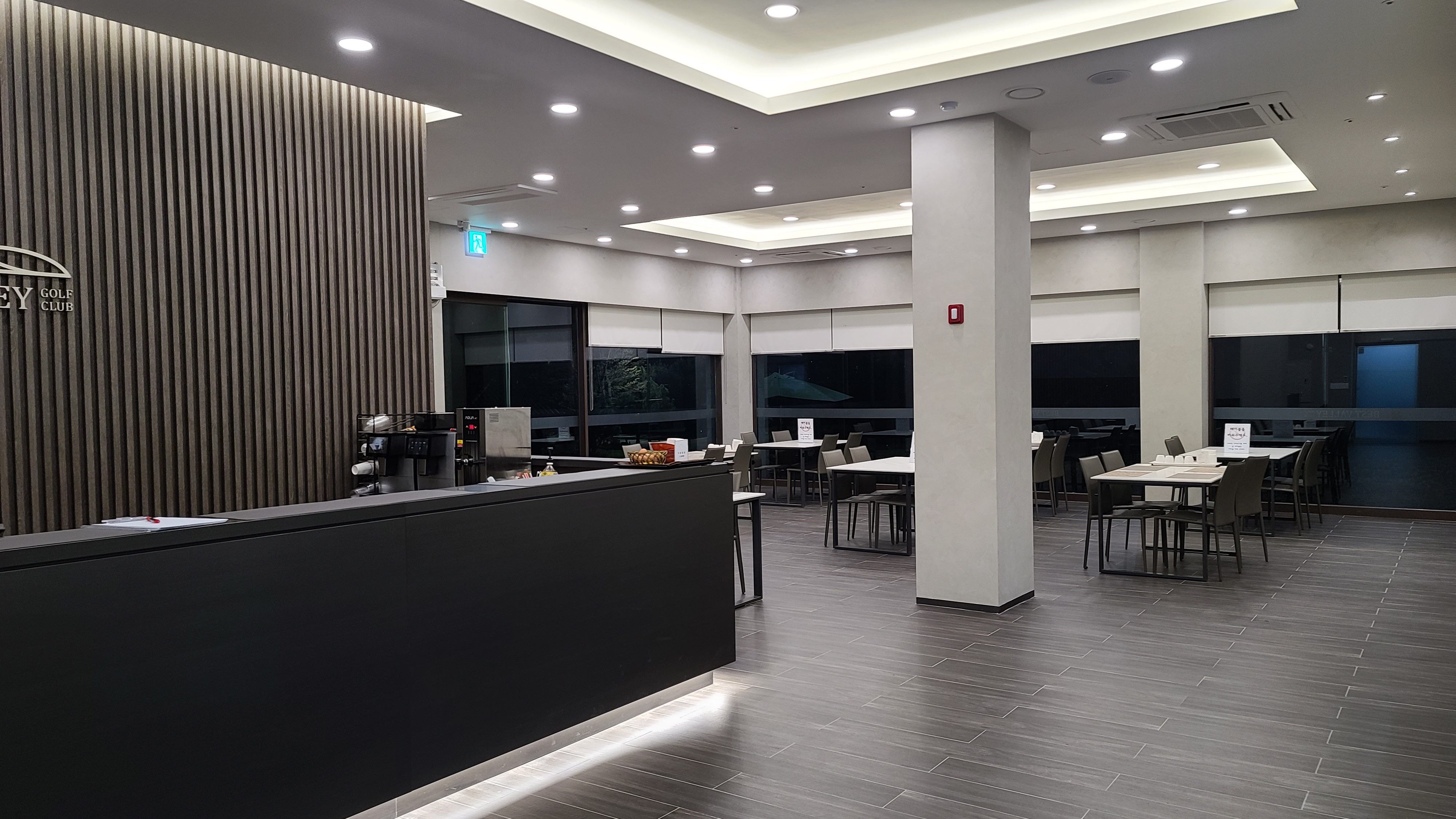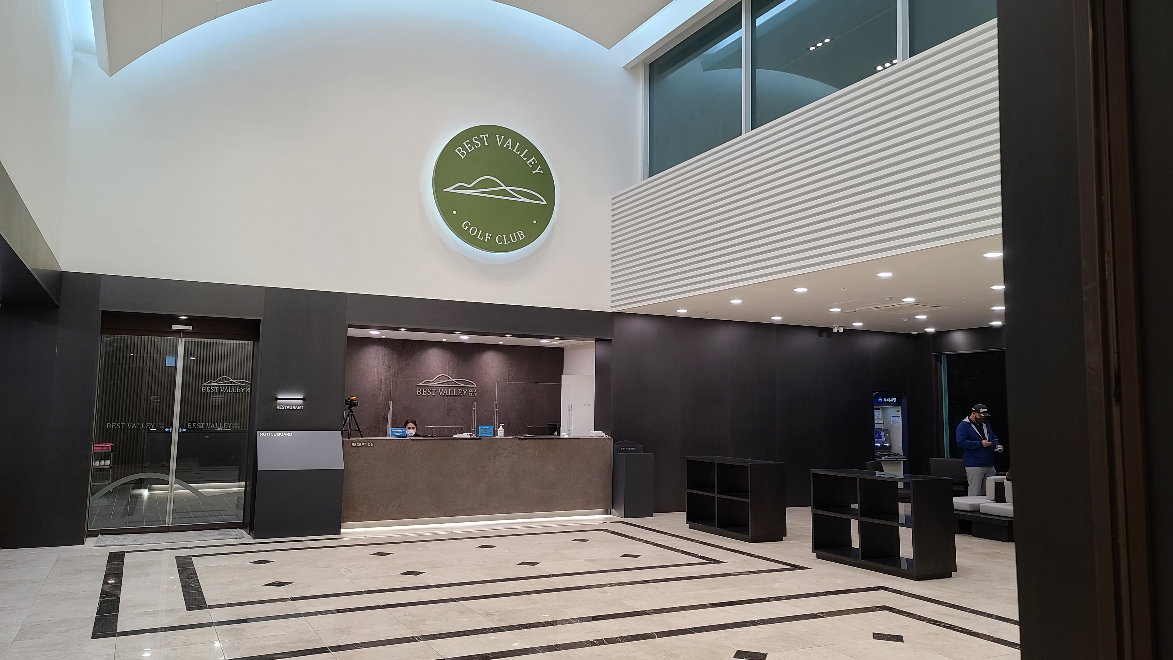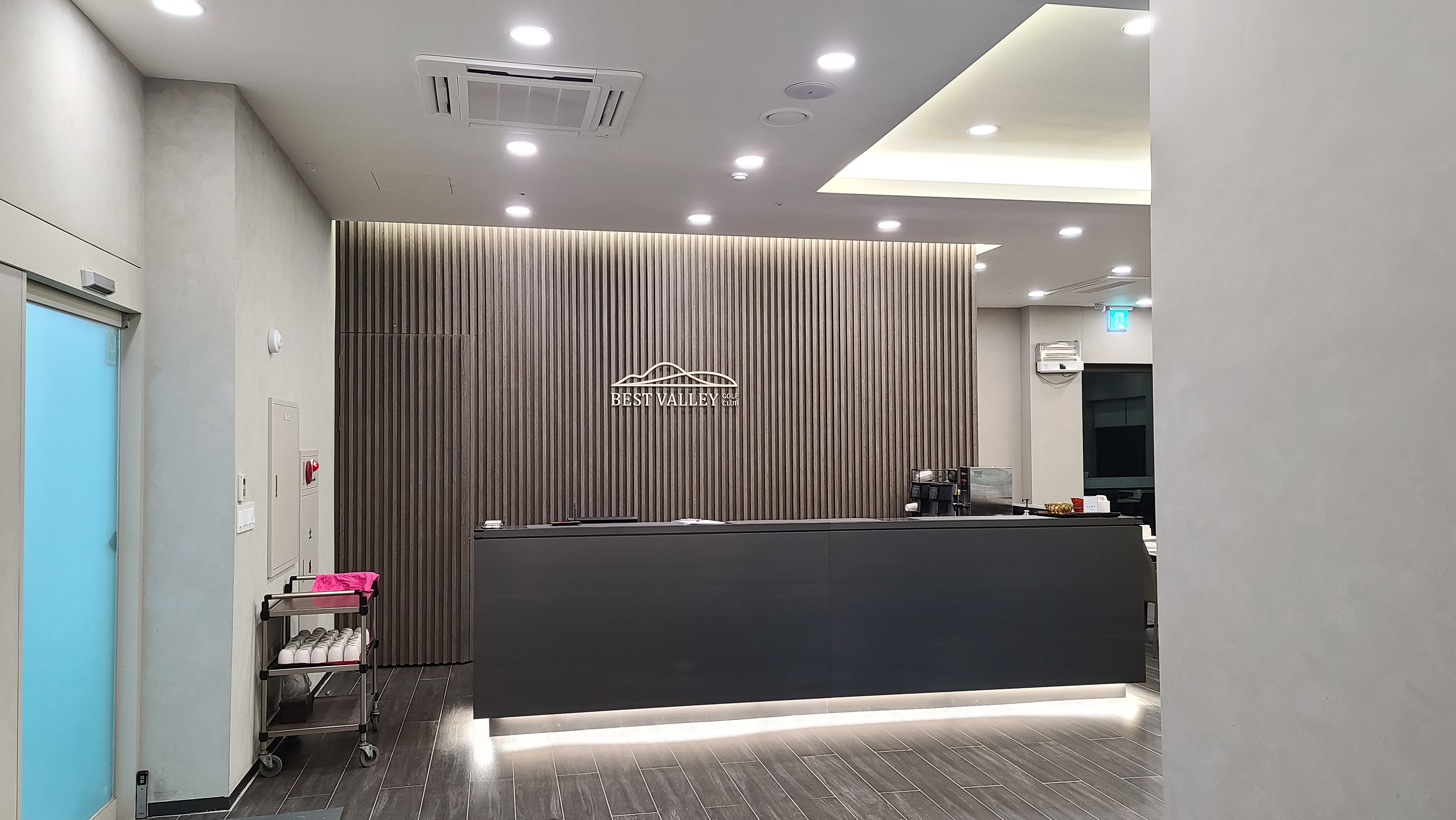 클럽하우스 정문을 지나 홀에 들어오니 대리석 바닥에 조명이 반짝거리고 있습니다. 한쪽에는 대형 스크린이 놓여져있고 베스트밸리 마크도 또한 은은하게 조명이 빛나는 것이 제법 고급스러운 분위기가 연출되고 있습니다.