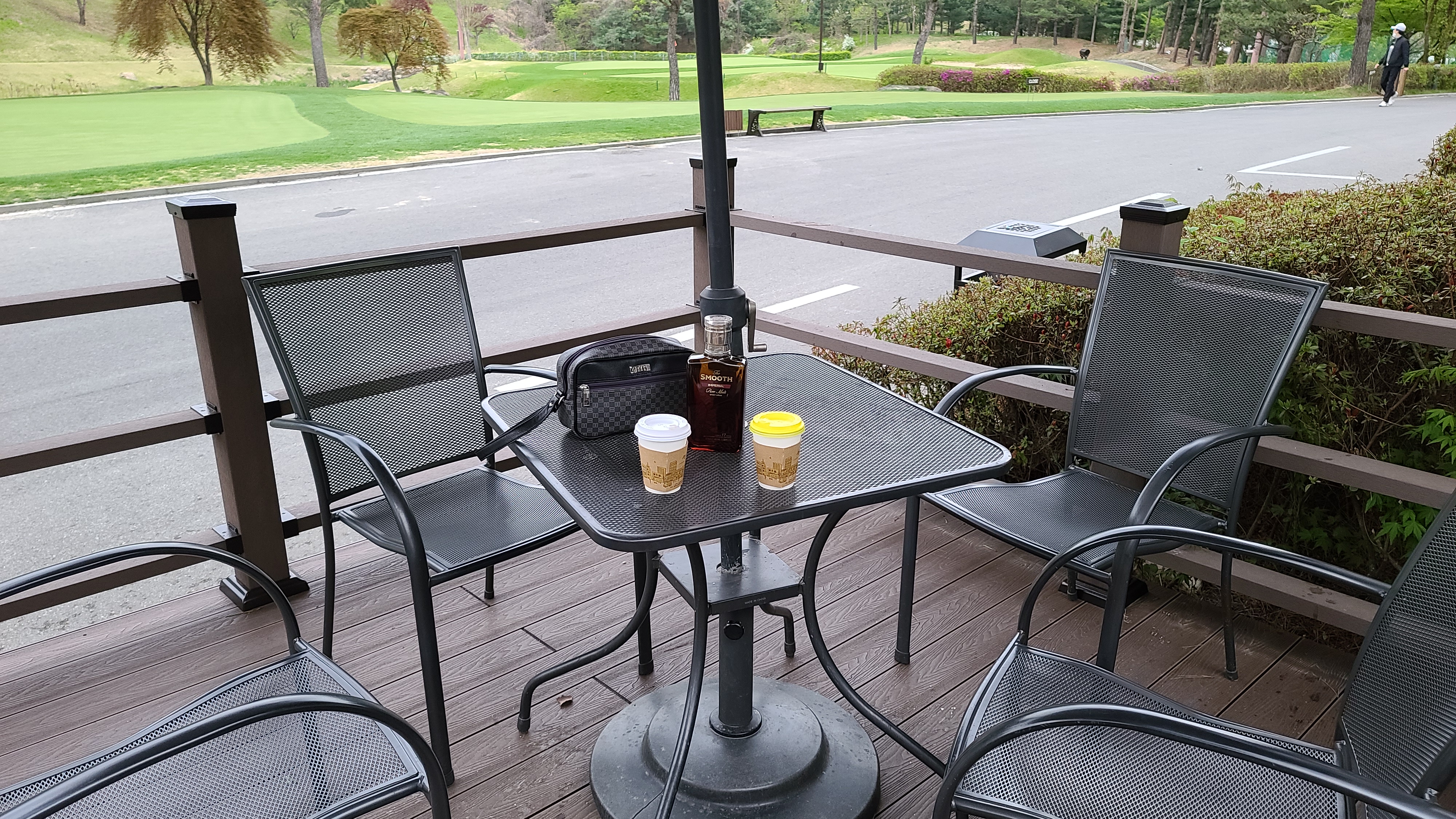 전반 9홀을 마무리하고 가볍게 커피와 협찬품을 놓고 즐거운 시간을 보냅니다. 뒤쪽으로 푸르른 그린의 모습이 참으로 보기 좋습니다.
