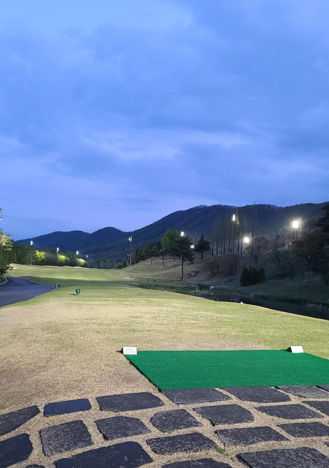클럽하우스에서 멀지않은 곳에서 바로 첫번째 티샷을 진행합니다. 첫홀부터 파5입니다. 조명도 아직 꺼지지 않은 이른시간이라 몸도 풀리지 않았는데 시작부터 힘이들어가게 만드는 코스구성입니다. 무리하지 않고 가볍게 샷을 날려주며 3온 끊어가기 전략으로 맞대응합니다.