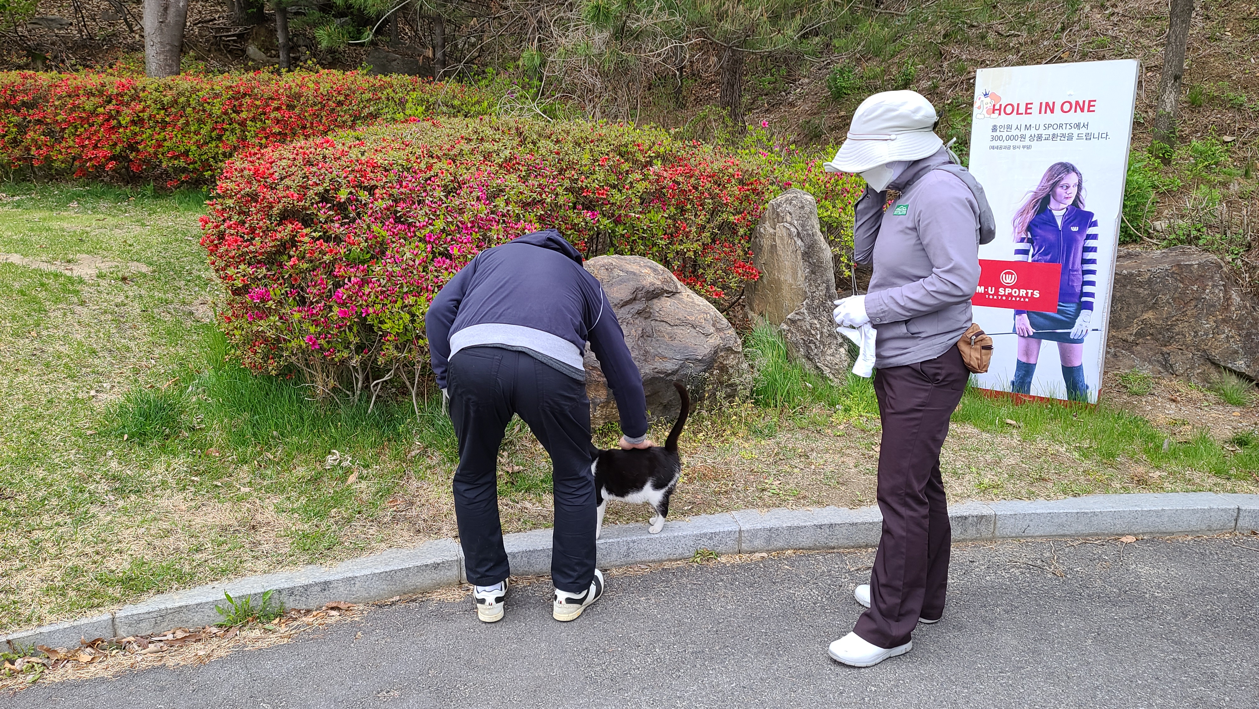 또 한번의 파3 홀인원 도전에 냐옹님께서 카트로 걸어오십니다. 냐옹신의 기운을 받아서 홀인원에 도전을 합니다만 니어핀에 만족하며 버디를 하기로 합니다.