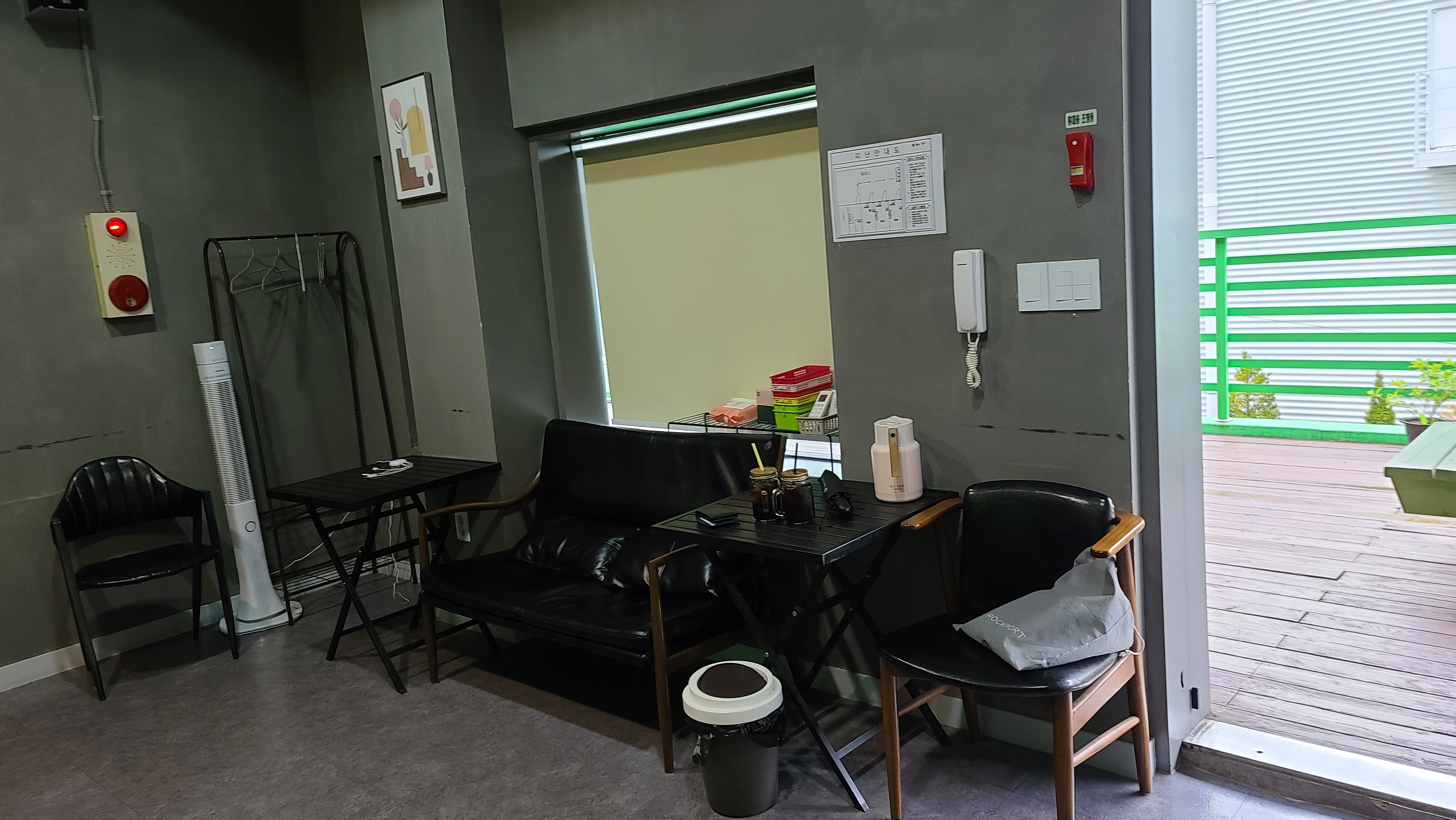 입구로 가서 방안을 살펴봅니다. 넓은 방의 모습이 눈에 들어오고 쇼파와 에어컨 그리고 충전기와 전기포트까지 편의시설이 상당히 다양하게 구비되어 있는 모습입니다.