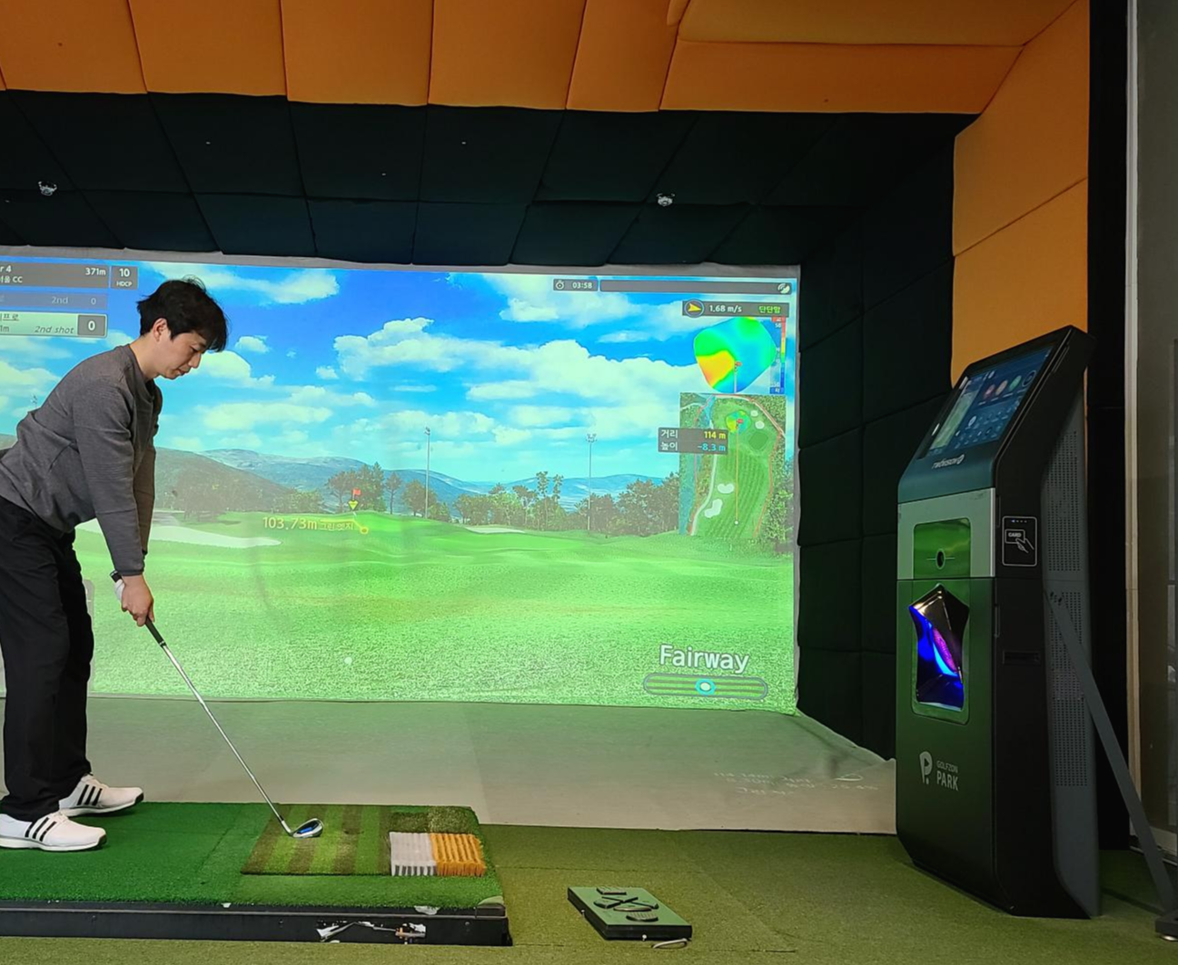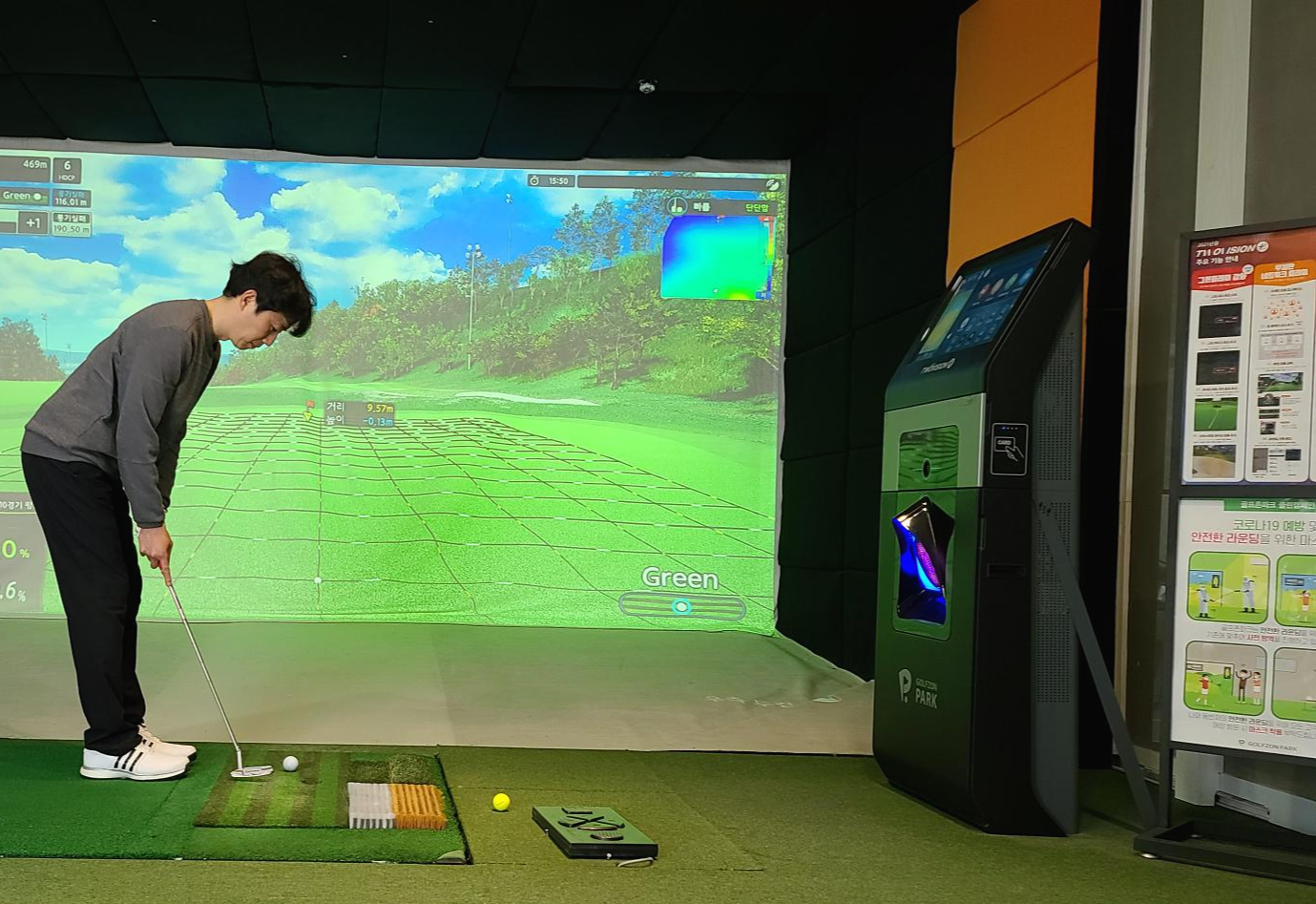 가장 중요한 타석을 살펴보니 골프존 투비전플러스 최신시스템에 와이드 스크린이 눈에 들어옵니다. 퍼블릭 골프채 또한 구비되어 있고 스크린 양쪽으로 충격흡수 매트를 꼼꼼히 붙여 놓은 모습이 매우 좋아보입니다.