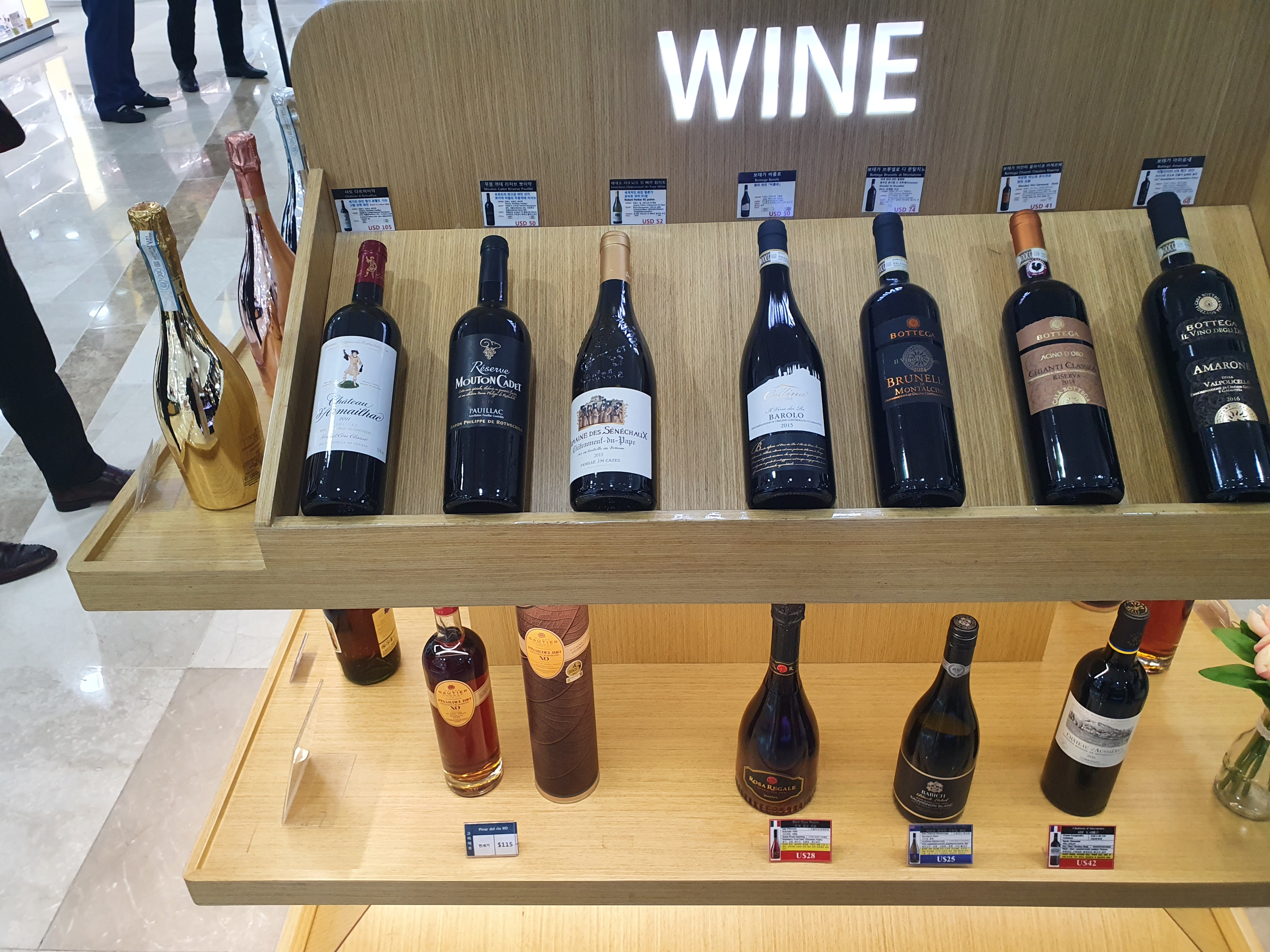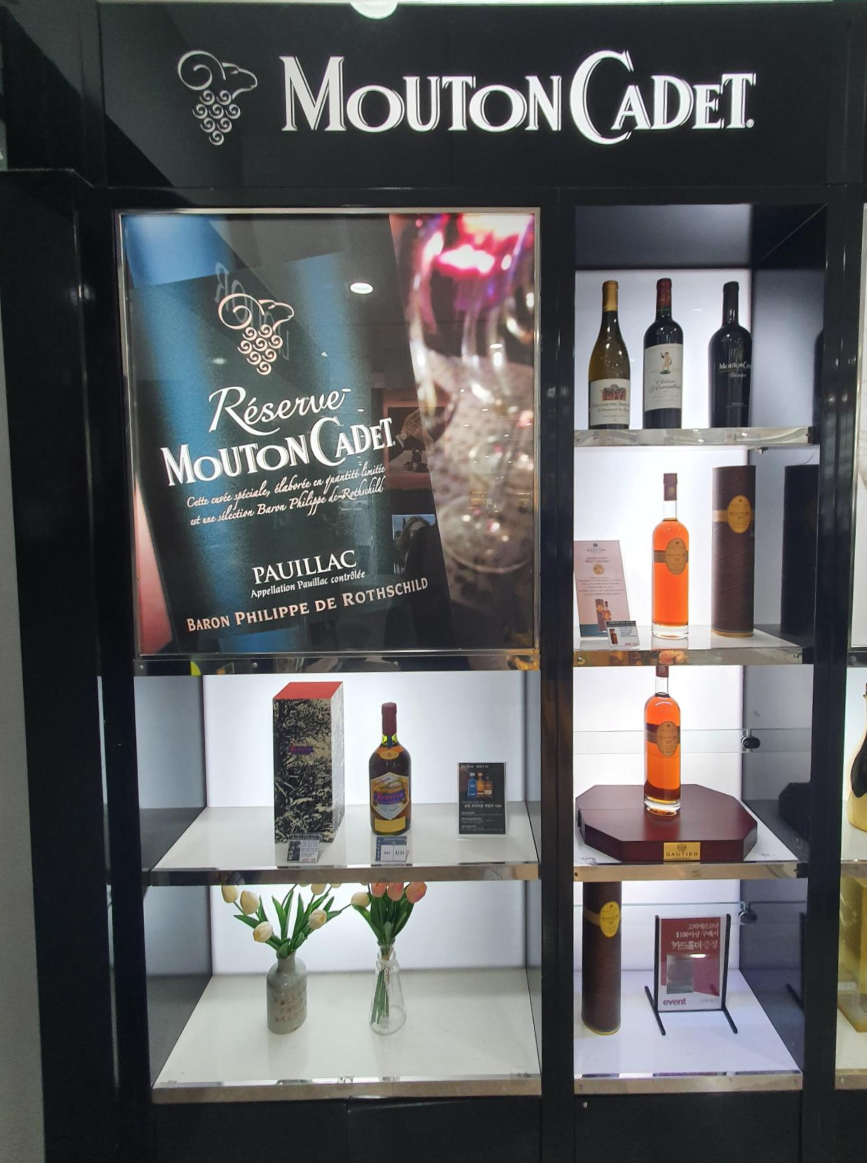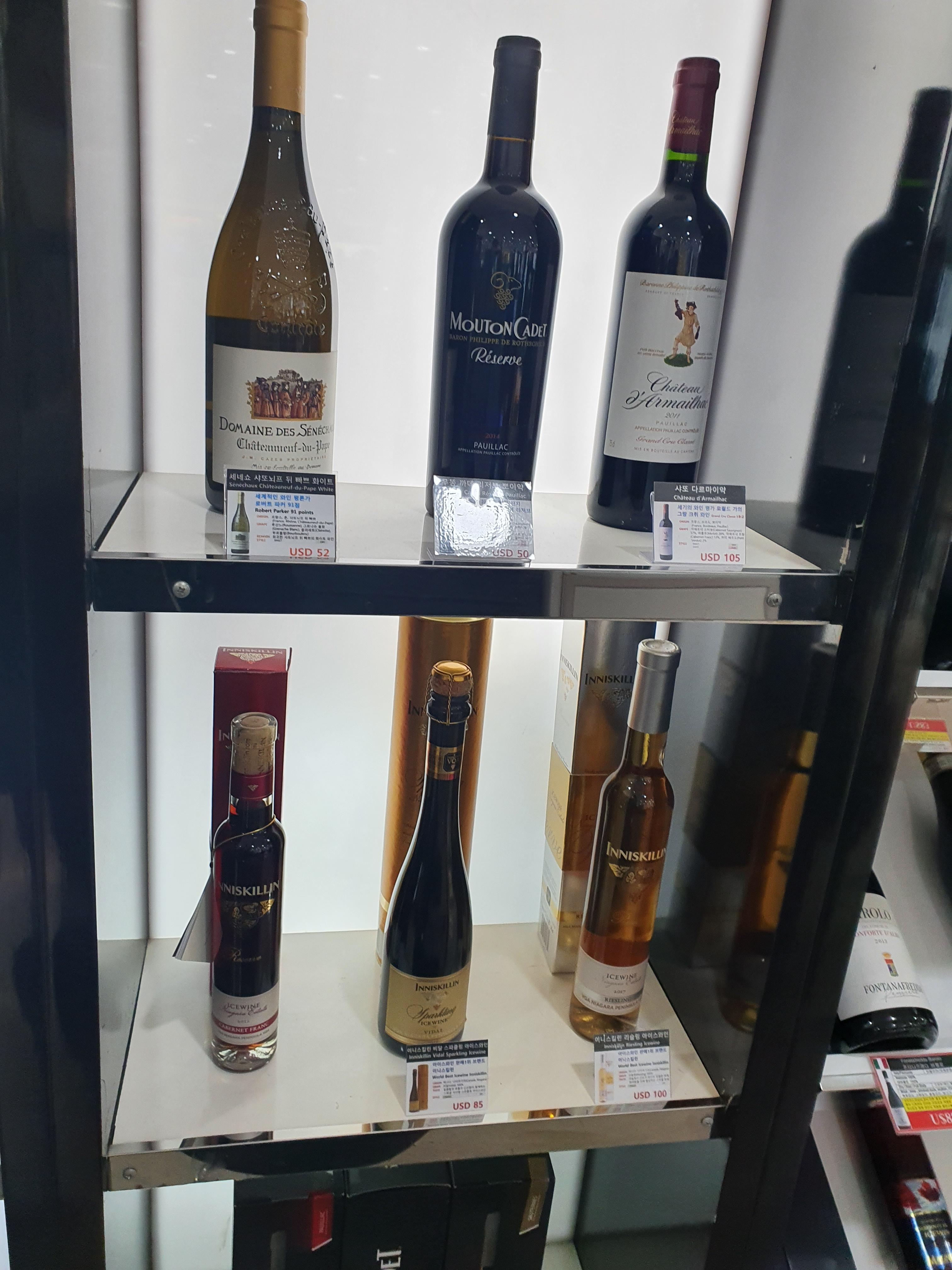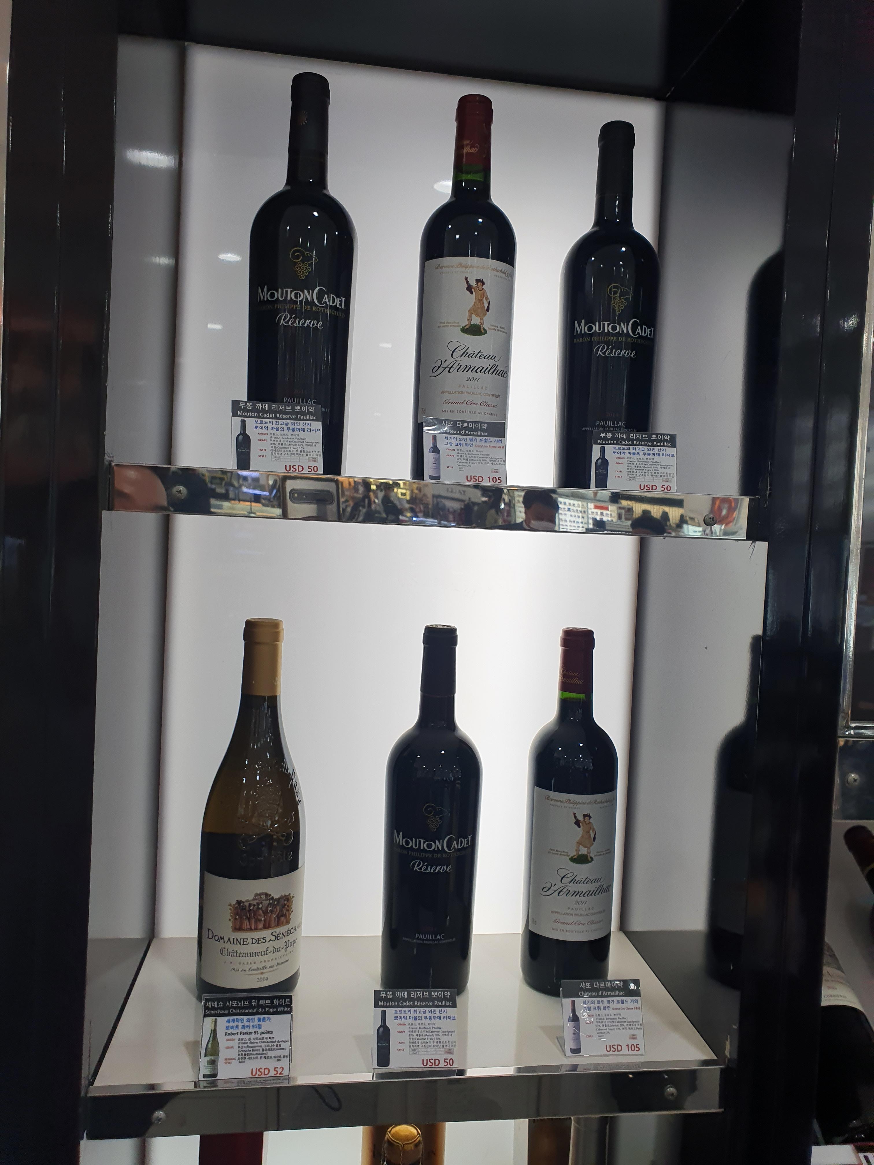 위스키와 증류주 매대에서 좀더 안쪽으로 들어가면 와인매대가 나옵니다. 샤또 무똥 로칠드를 만드는 명품 양조장에서 만든 무똥 까데가 가장 눈에 들어오게 인테리어를 해놓은 모습입니다.