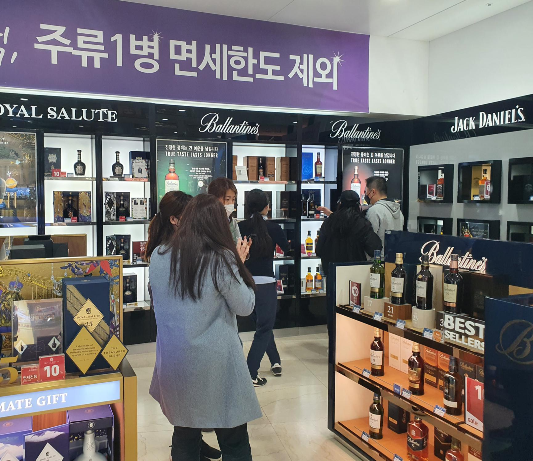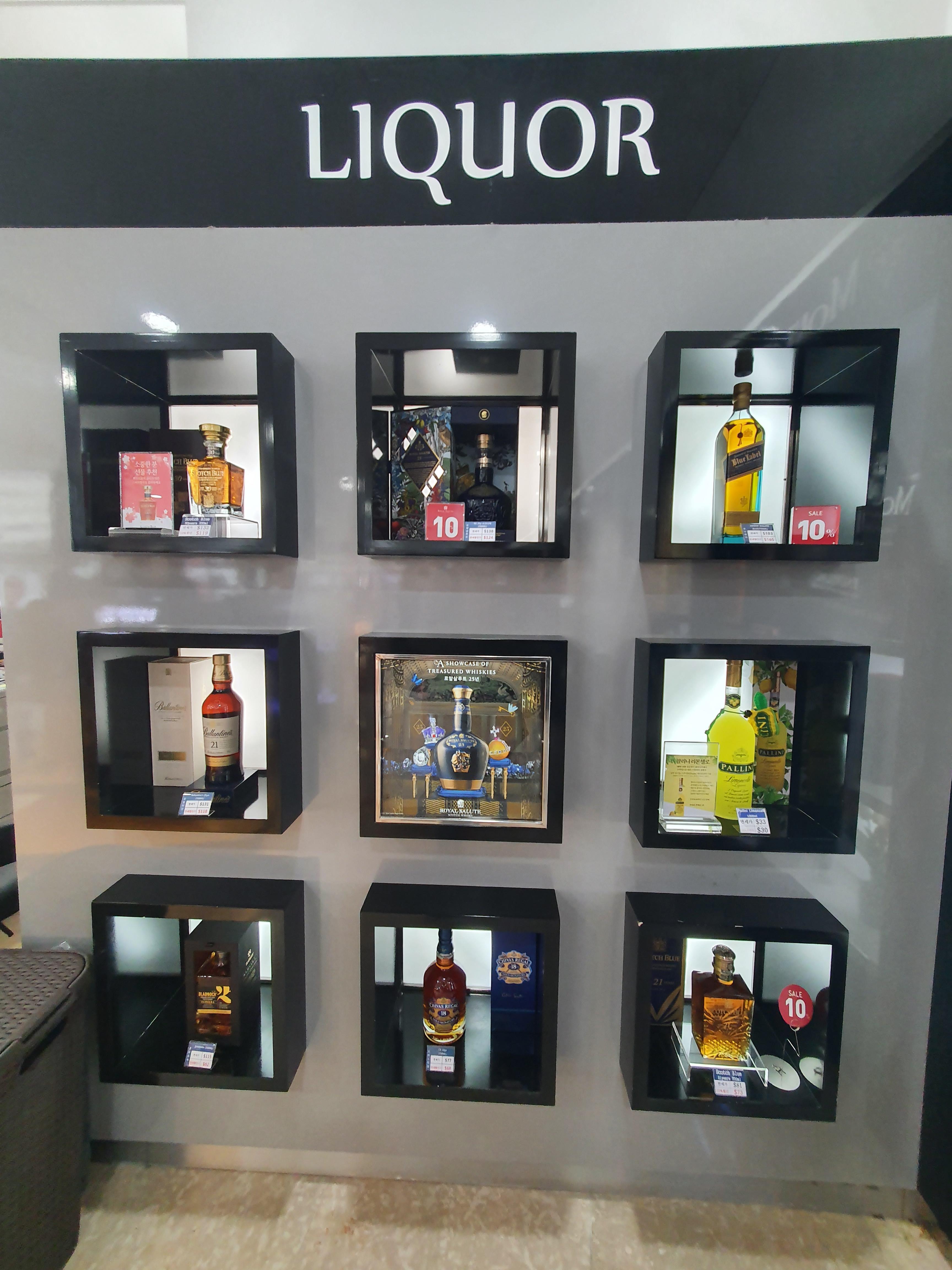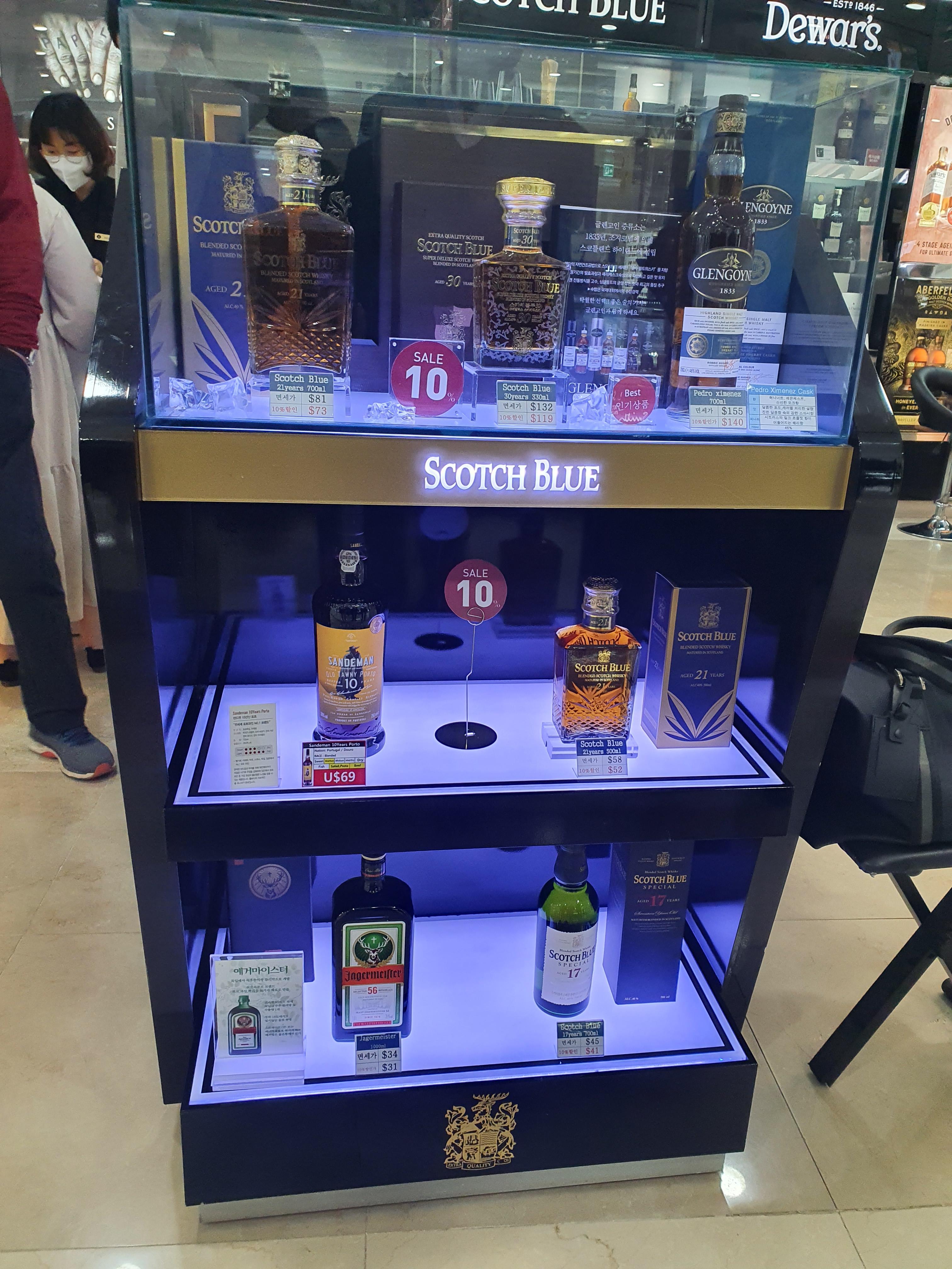 면세점 중앙엔 가장 인기가 있는 제품 혹은 진열에 돈을 쓴 제품들로 보이는 주류들이 전용케이스에 진열되어 있습니다. 가운데 라인엔 로얄살루트가 보이는걸 보니 역시 면세점의 최강자는 로얄샬루트구나 하는 생각이 들고 시바스리갈, 조니워커, 팔리니 리몬첼로도 진열되어 있는 모습이 보입니다.