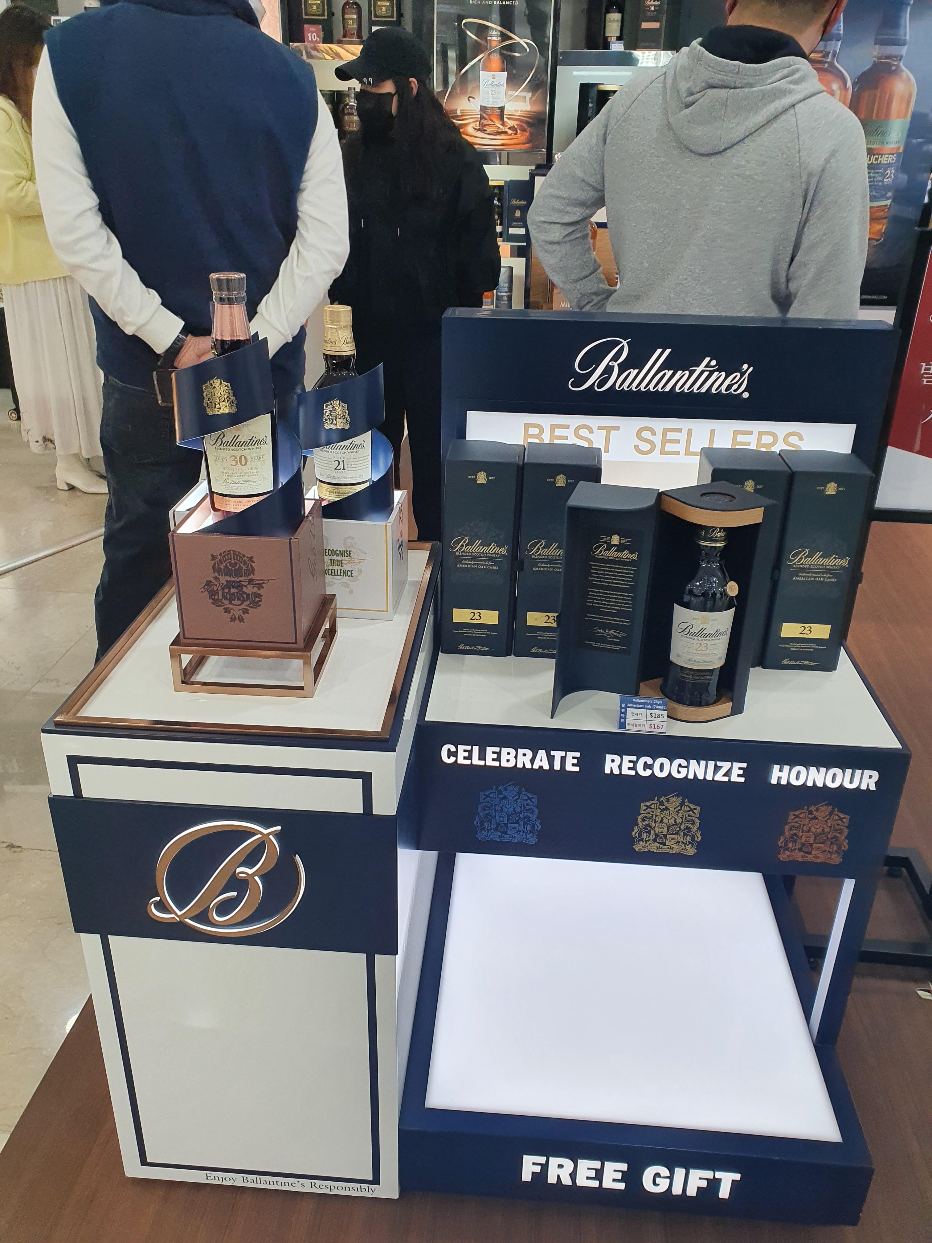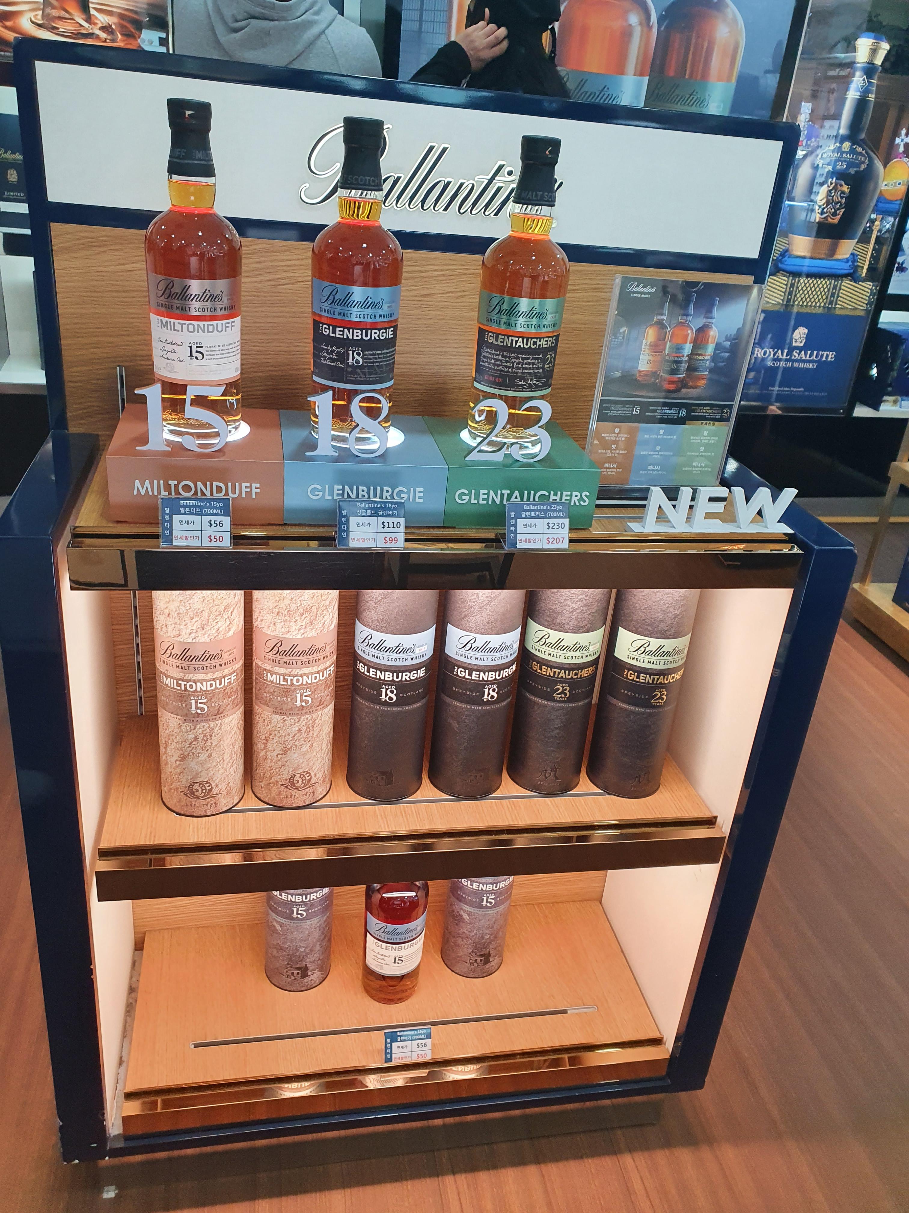 가장 인기가 많고 사람들이 몰린 발렌타인 위스키의 매대입니다. 발렌타임 21년, 23년, 30년의 고급스러운 종류는 따로 진열대를 만들어 전시하고 있고 발렌타인의 싱글몰트 시리즈인 밀톤더프, 글렌버기, 글렌토커스가 보입니다.