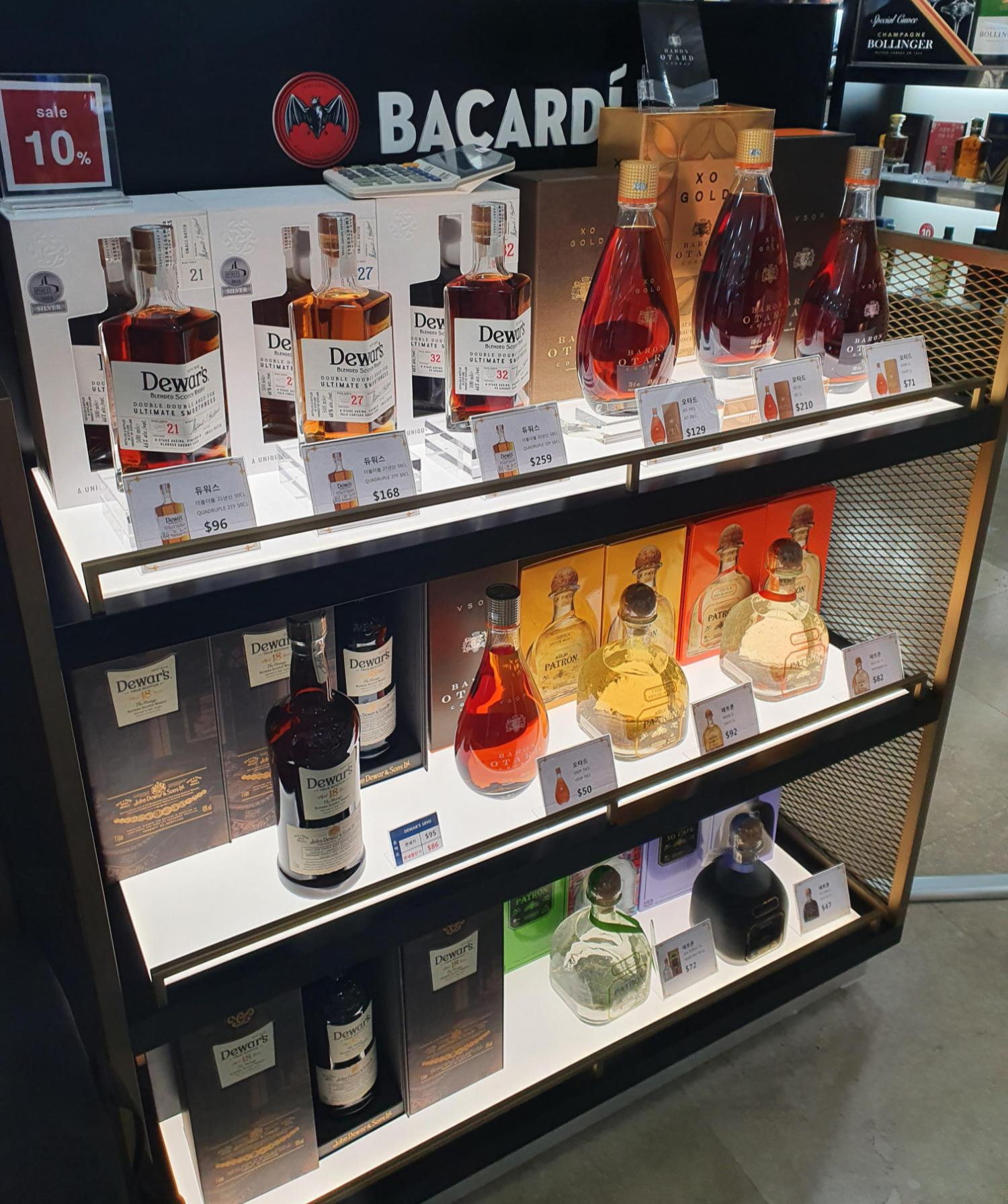 바카디와 올트모어, 아벨펠디, 틸링, 듀워스 위스키, 오타드 꼬냑, 페트론 데낄라가 진열되어 있는 매대입니다. 럼과 데킬라, 위스키와 코냑이라니 상당히 다채로운 조합으로 진열해놓는구나 하는 생각이 듭니다.