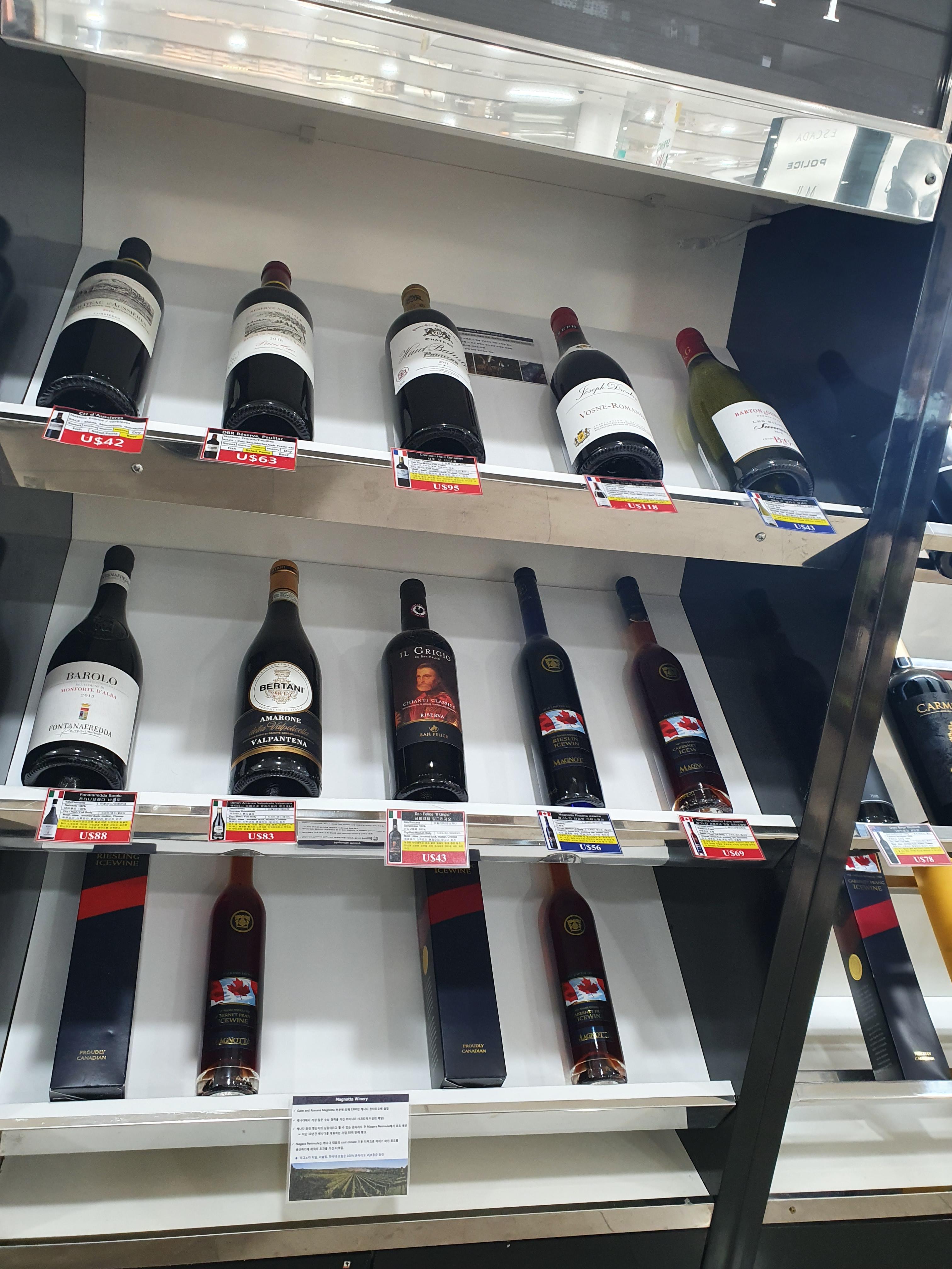 와인매대는 프랑스 와인 외에도 산펠리체, 매그노타, 마르티나, 폰타나프레다, 산타캐롤리나, 등 유명한 이탈리아 및 칠레, 미국 등 신세계 및 구세대 와인도 다수 보이는 모습입니다.