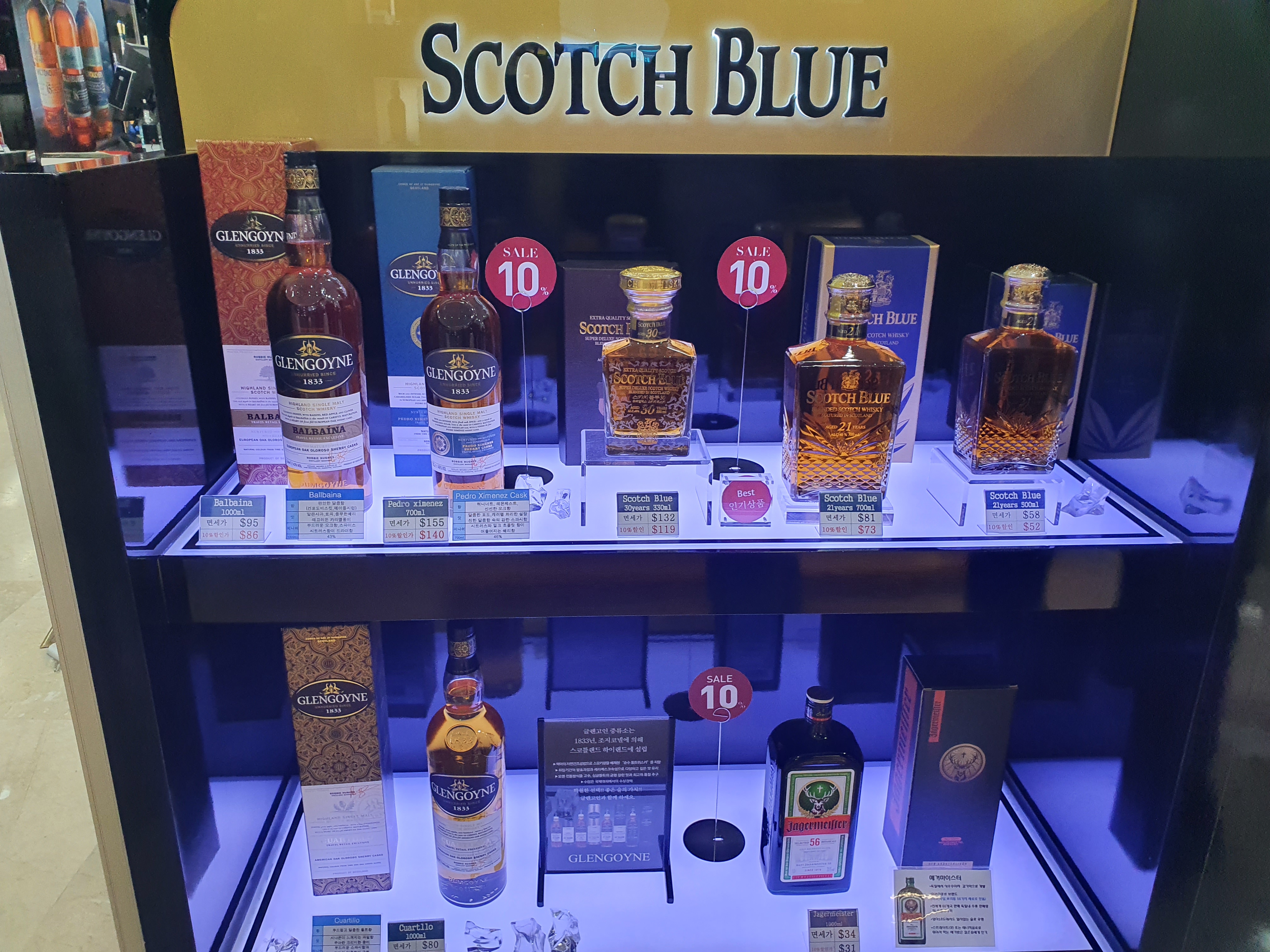 롯데주류의 매대모습입니다. 제주관광공사 면세점에는 임페리얼, 스카치블루, 골든블루와 같은 로컬위스키도 찾아볼수 있으며 시중보다 싸게 구매가 가능한 모습입니다. 역시 내국인을 위한 면세점 성격이 강해서 로컬위스키도 입점해 있는 모습입니다.