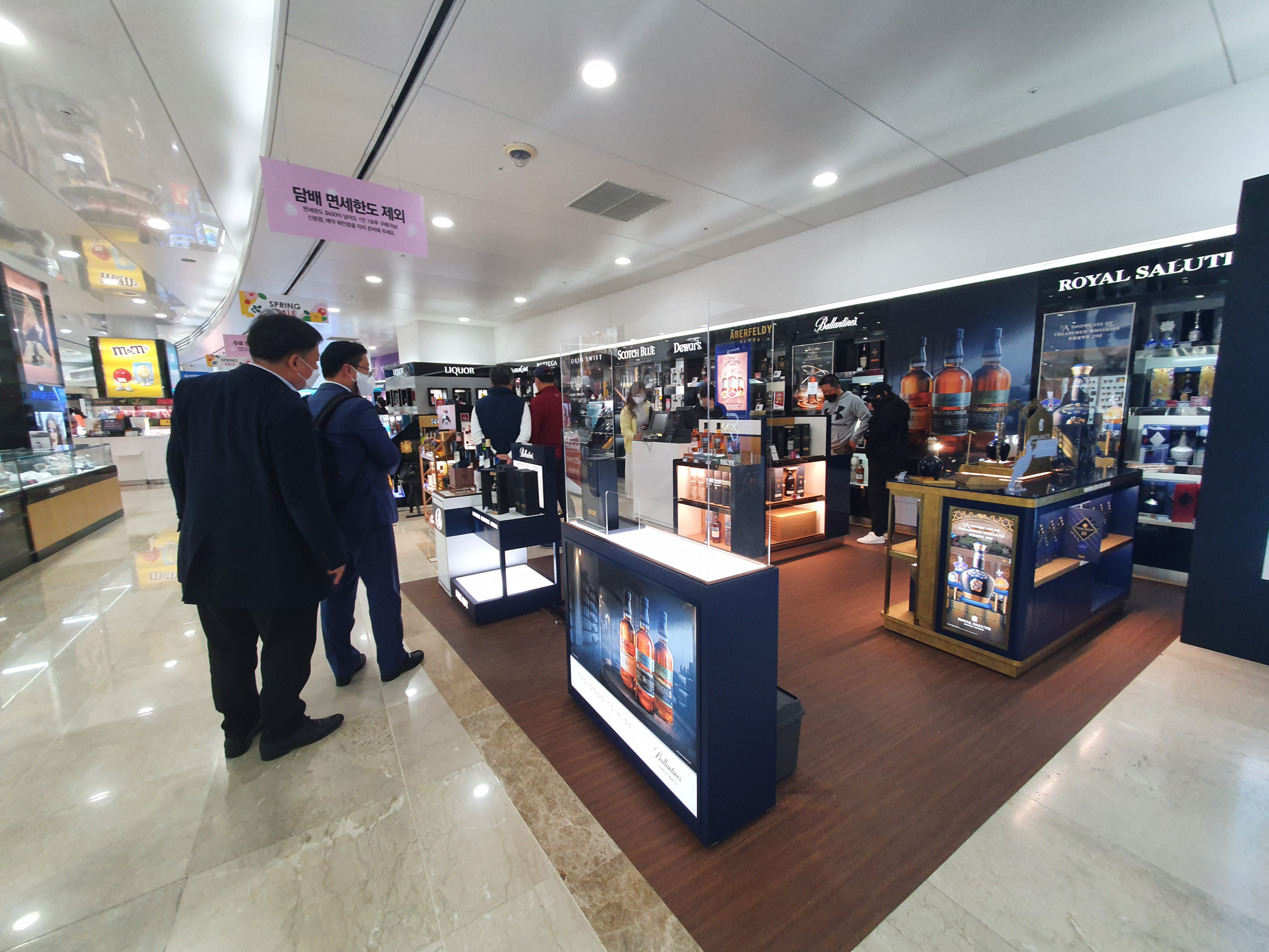 주차를 하고 편하게 면세점에서 가장 인기 있는 주류코너를 둘러봅니다. 브랜드별로 장식장이 있고 직원분들이 자리하고 있는 모습입니다.