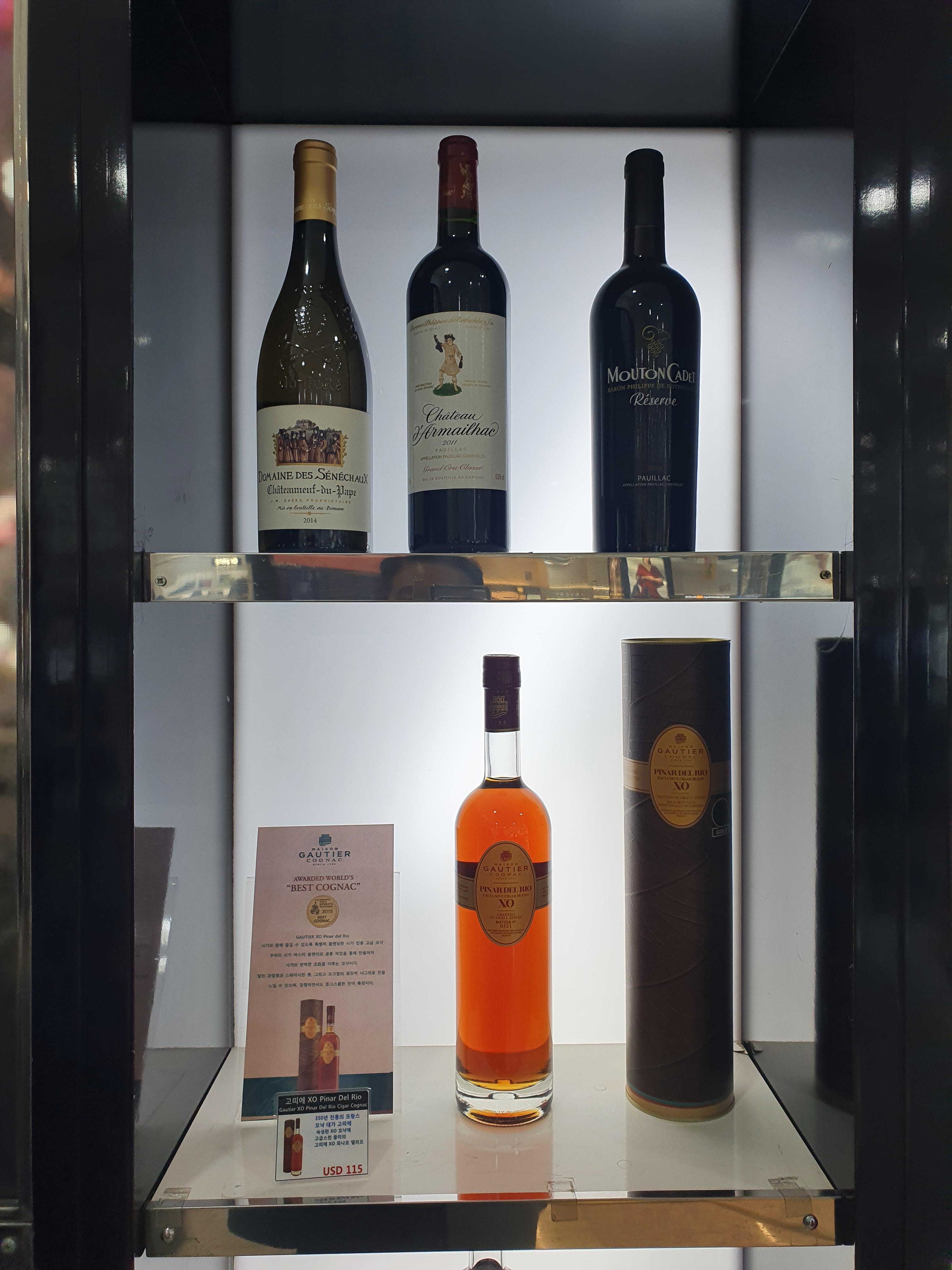 와인매대 중앙에 제품은 무똥까데, 샤또 다르마이악, 보테가 와인, 고띠에 꼬냑이 눈에 들어옵니다.