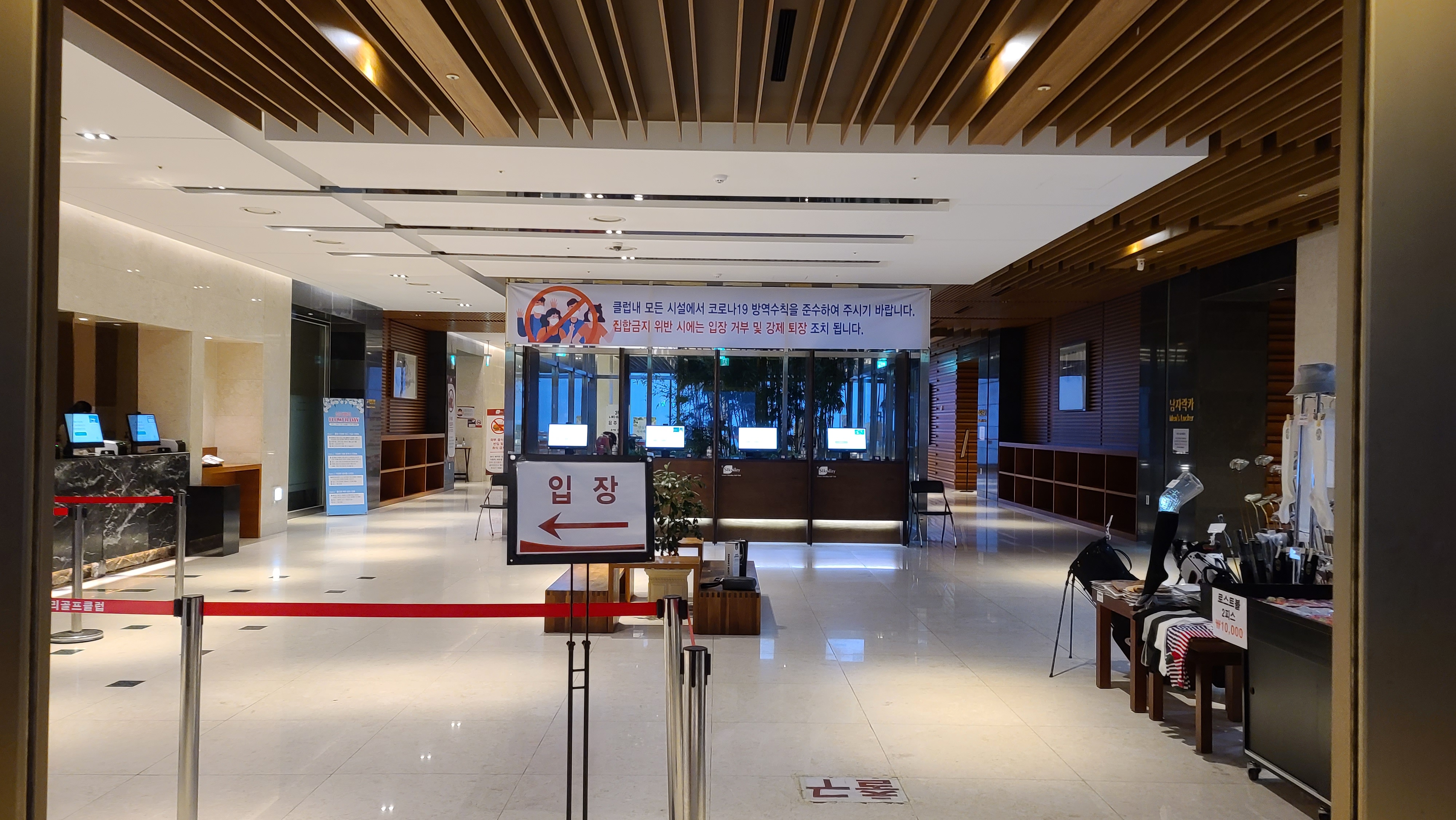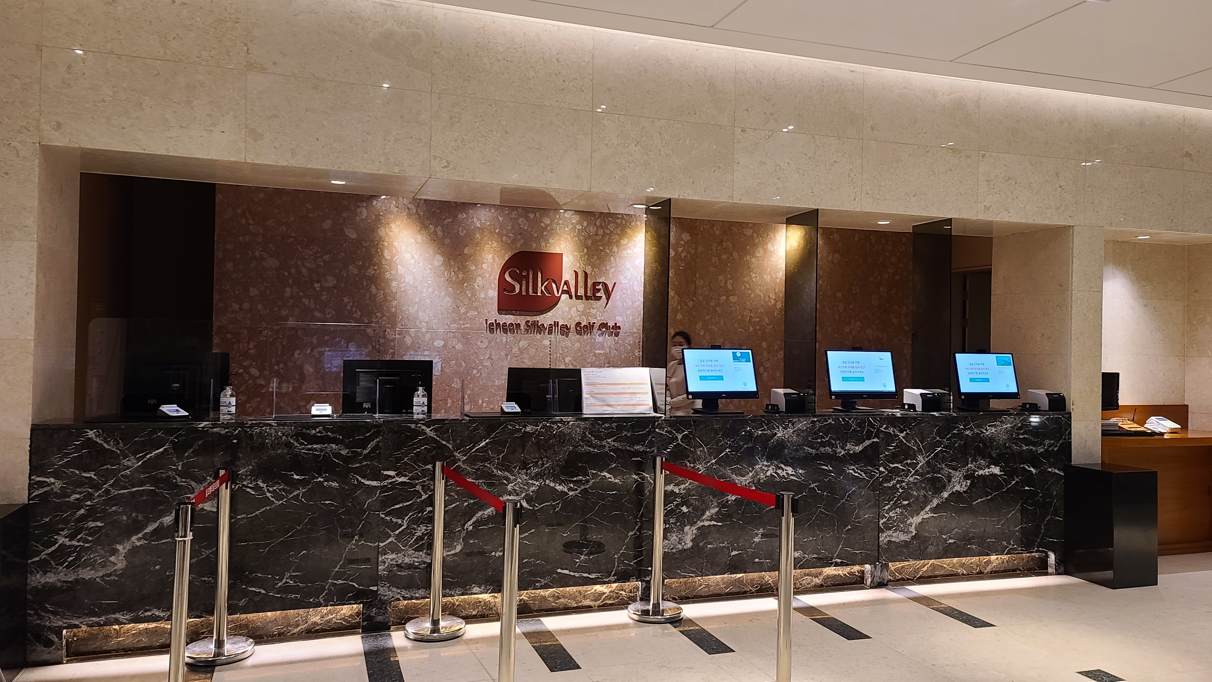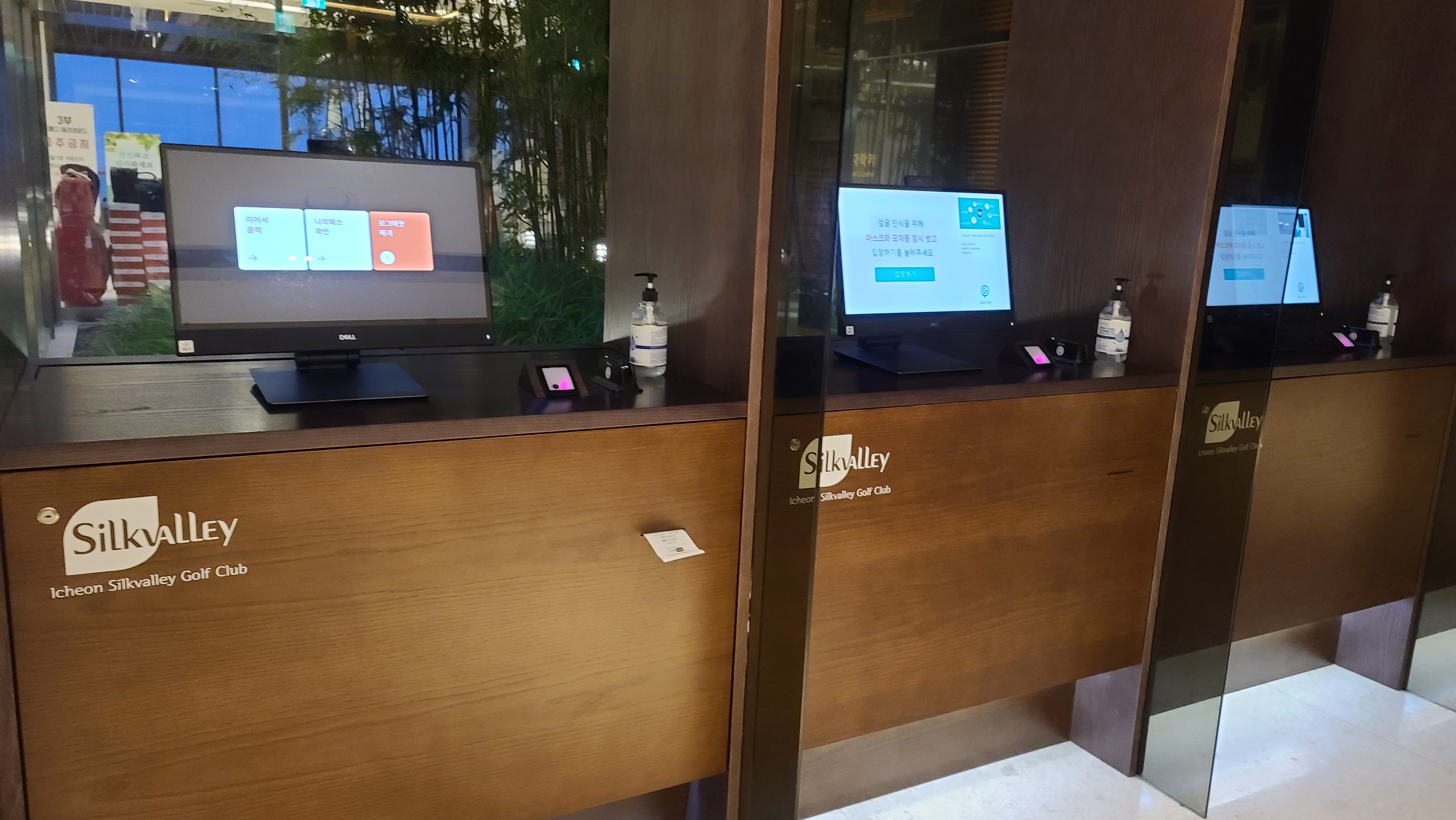 클럽하우스에 입장해서 전경을 담아봅니다. 입구왼쪽으로는 안내데스크 오른쪽으로는 상품점 그리고 정면으로는 무인체크인 기기가 보입니다.