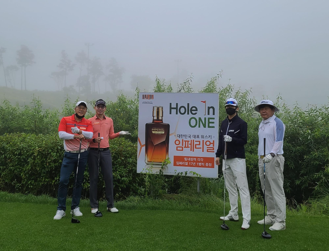 3번째 홀은 파3홀입니다. 티샷 그라운드 옆에 홀인원 이벤트 안내판이 세워져 있습니다. 홀인원을 기원하며 단체사진을 찍어보기로 합니다.