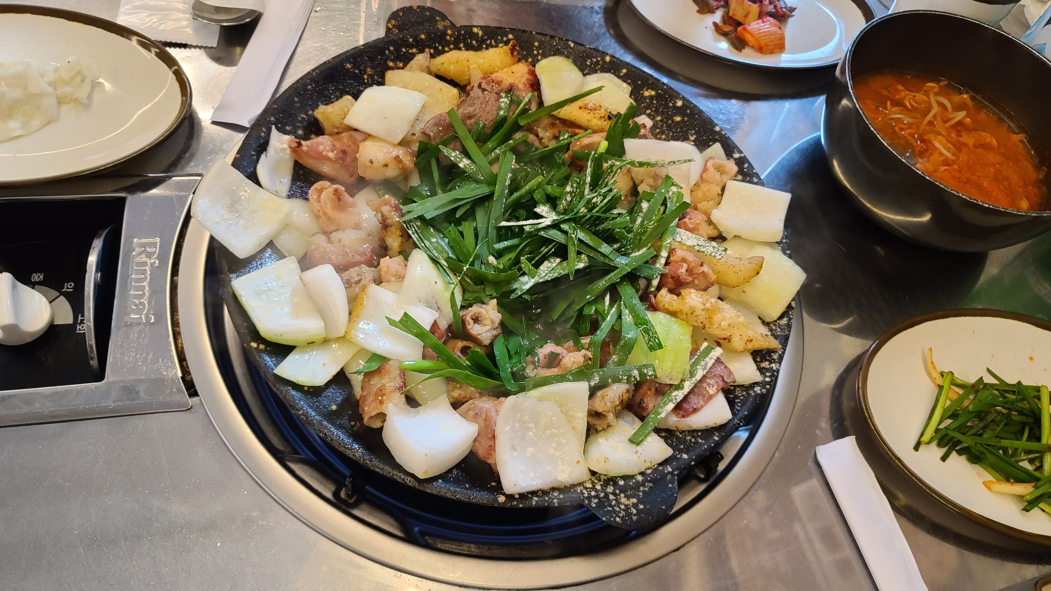 자리를 잡고 기다리자 곱창 한판이 나왔습니다. 곱창, 대창, 양 등이 섞여 있으며 양파, 부추, 감자가 곁들여져 있어 고소한 냄새를 풍기고 있습니다.