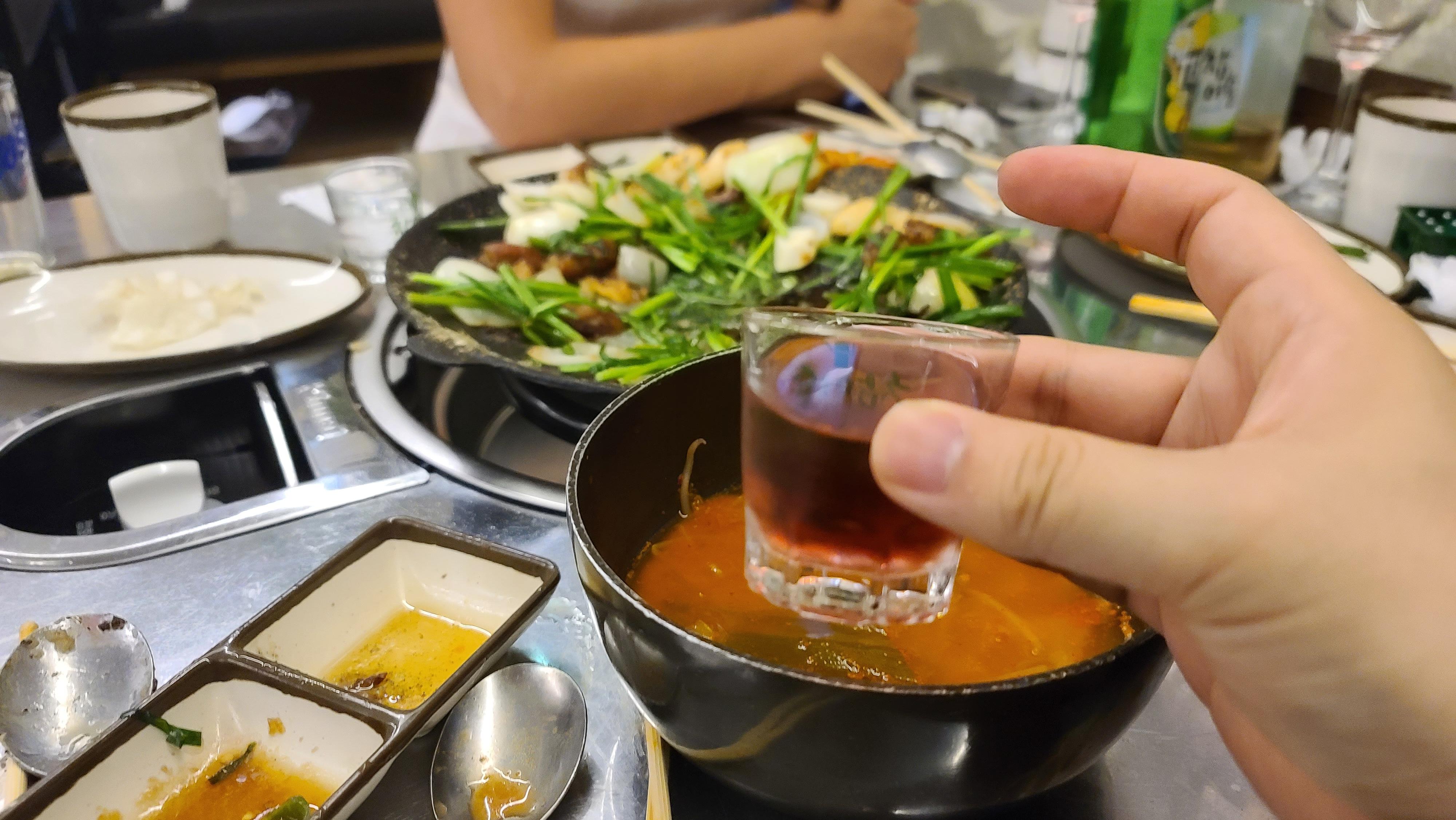 조금더 한국적으로 부추와 곱창을 싸서 소주글래스에 와인을 따르고 원샷을 하며 분위기를 띄워봅니다. 역시 다양한 경험을 하니 술자리가 더욱 즐거워집니다.