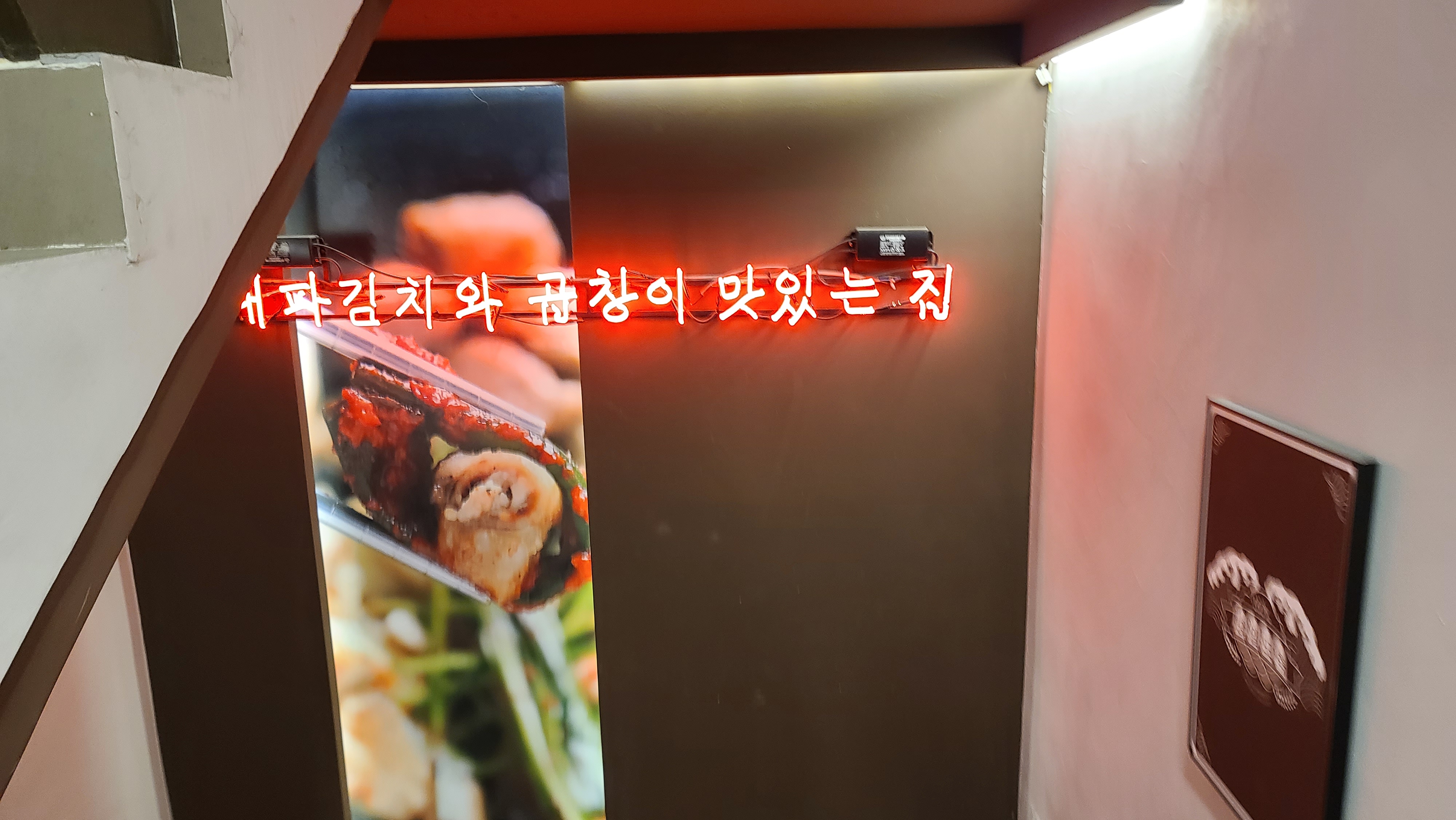 2층으로 올라가는길에 조명이 눈에 들어옵니다. 대파김치와 곱창이 맛있는집. 가게의 특징을 잘 나타내주는 시그니처로 보이고 빈공간을 활용한 마케팅기법이 돋보입니다.