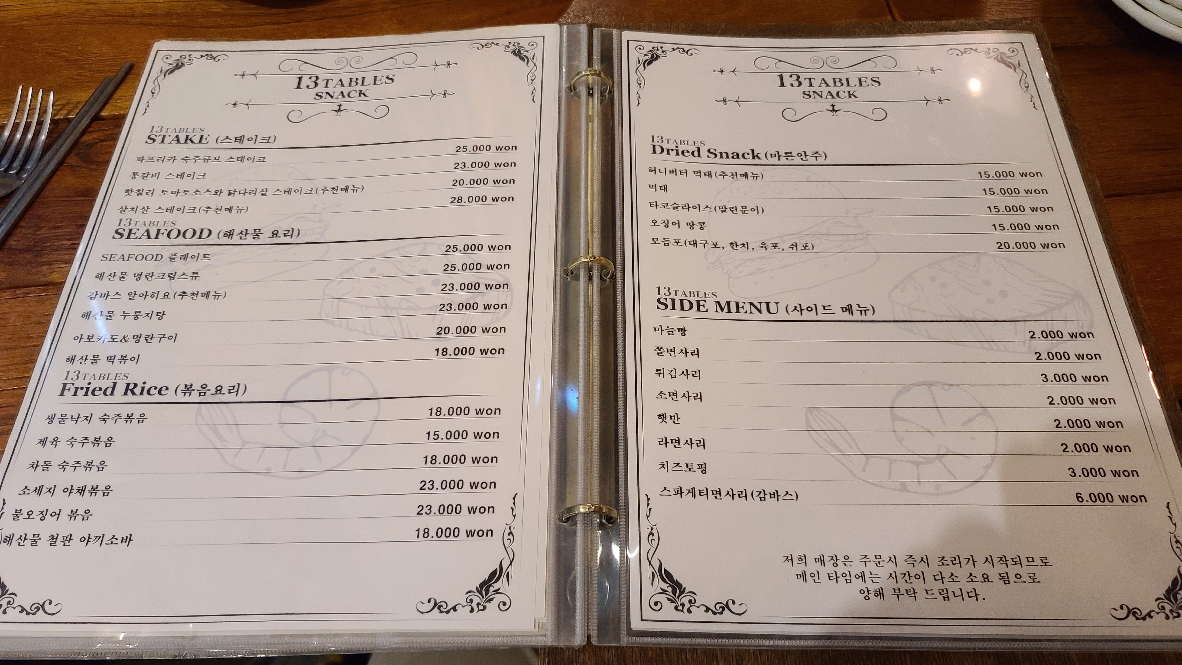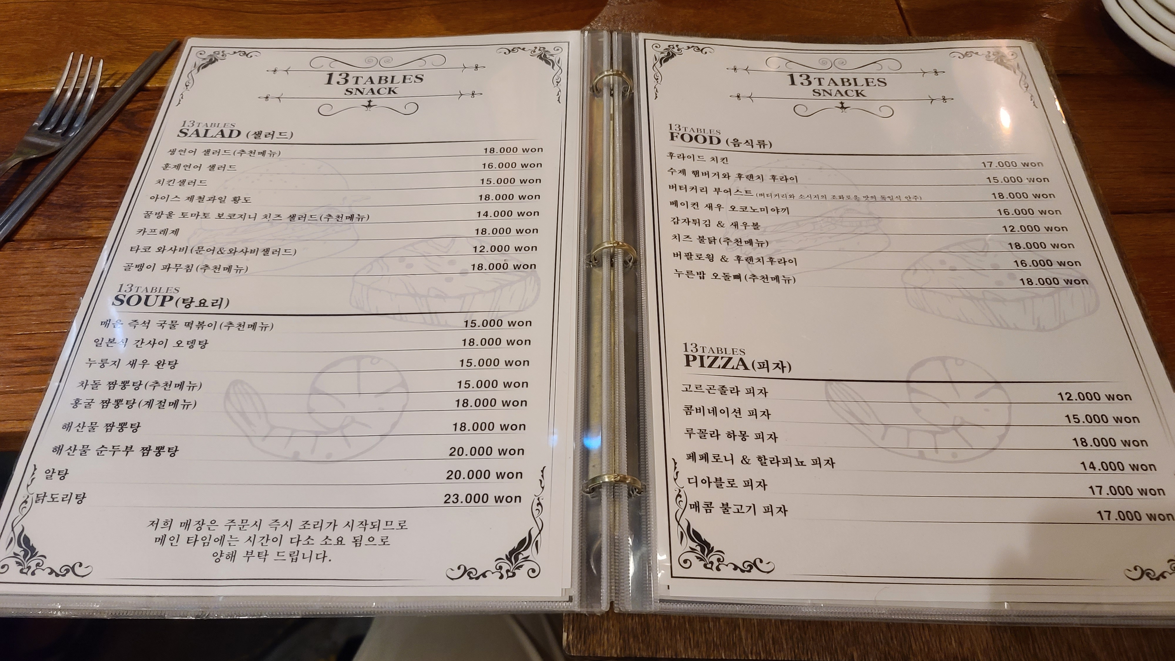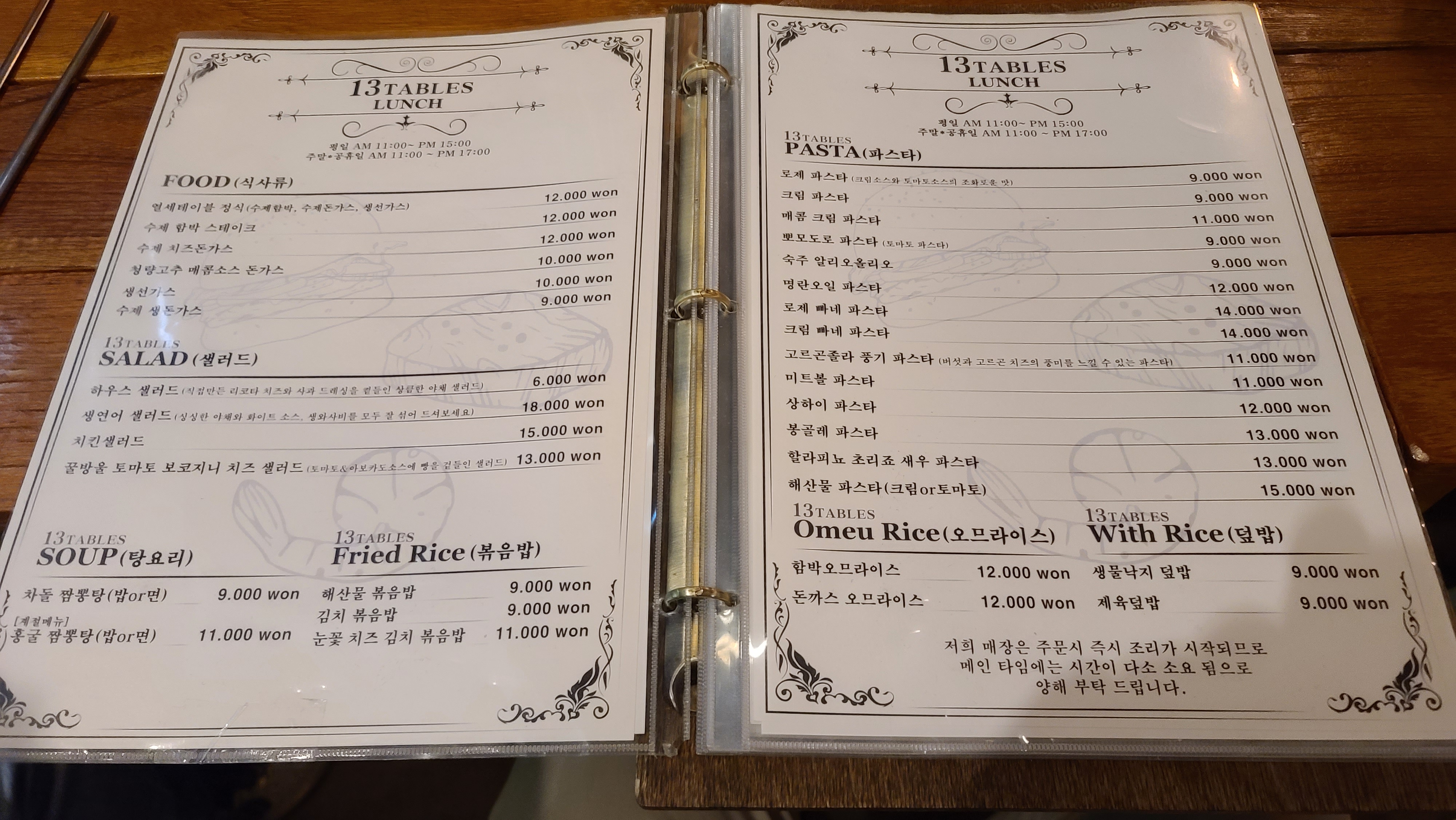 들어가서 자리를 잡고 메뉴판을 살펴봅니다. 가장 눈에 띄는 열세테이블 정식은 함박과 돈가스, 생선가스의 조합이고 다양한 샐러드와 파스타 그리고 오므라이스, 덮밥류가 보입니다.