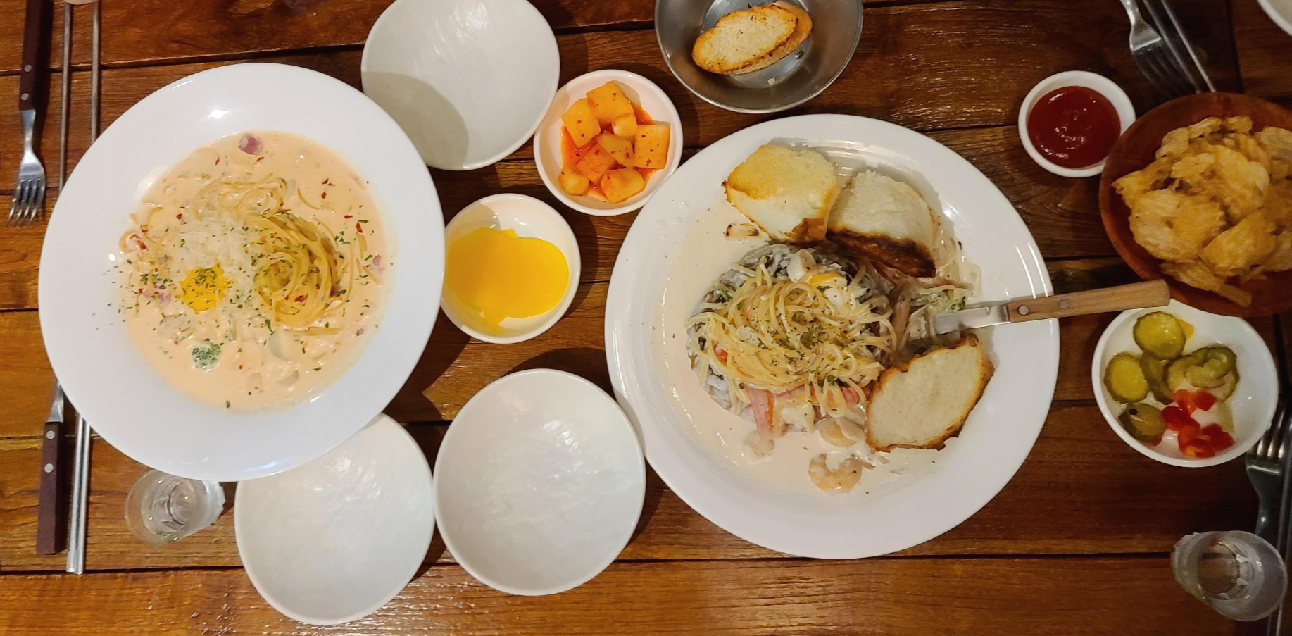 잠시 기다리자 매운크림파스타와 크림빠네 2가지의 면요리가 먼저 나왔습니다. 매운크림파스타는 로제빛깔의 소스에 계란 노른자가 떠있는 이색적인 비주얼이며 크림빠네는 빵속 면이 분출하는 듯한 비주얼이 매우 마음에 듭니다.