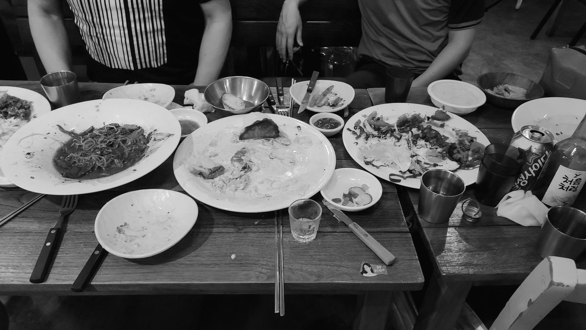 주문한 메뉴들과 소주를 한잔씩하며 즐거운 시간을 보냅니다. 이탈리안 퓨전 레스토랑에서 소주한잔과 즐기는 다양한 음식들이 꽤나 잘 어울립니다.