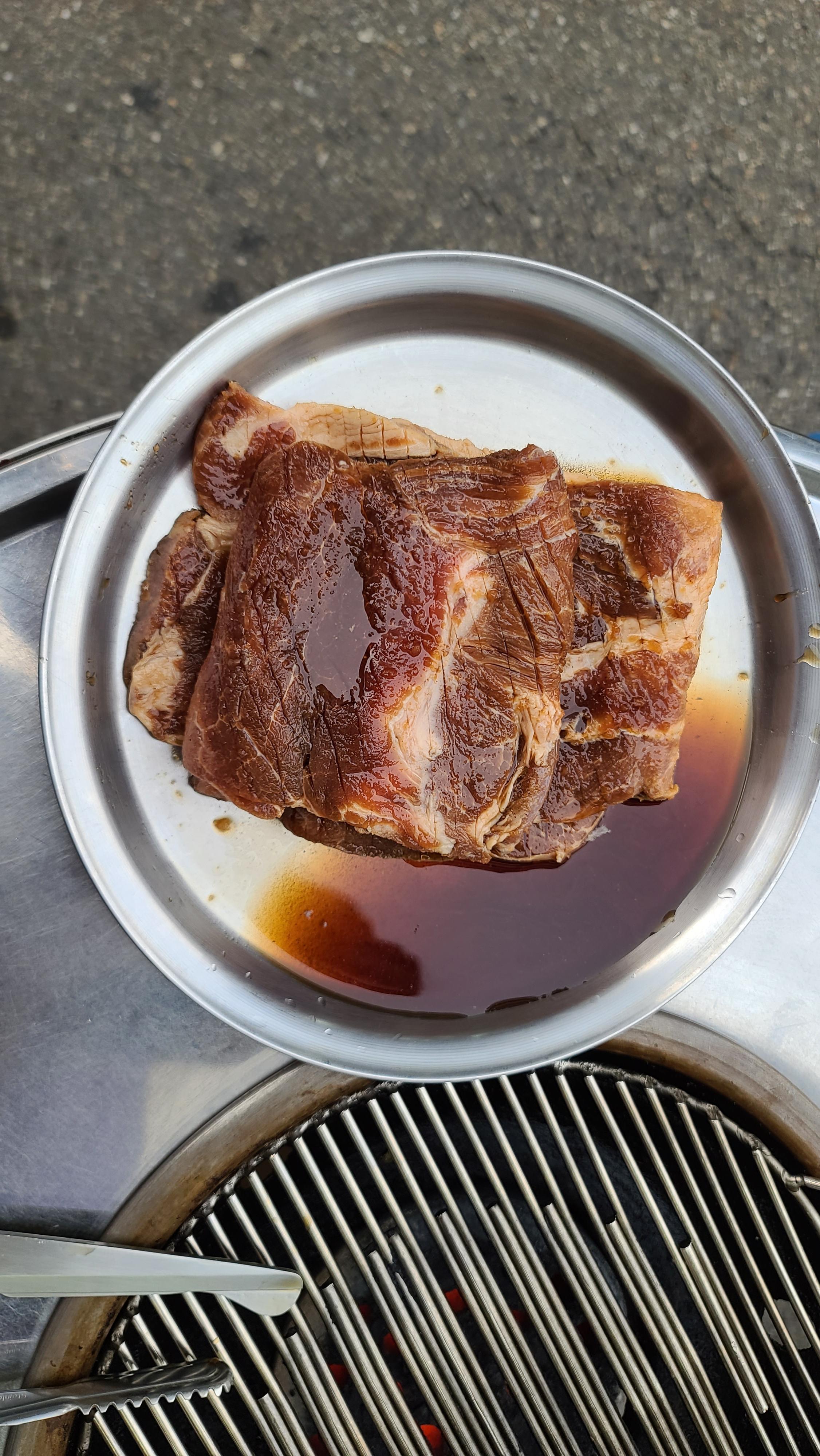 왕갈비와 삼겹살, 껍데기 닭발 등이 눈에 들어옵니다. 왕갈비를 주문하고 바깥에서 자리를 잡고 기다려봅니다.