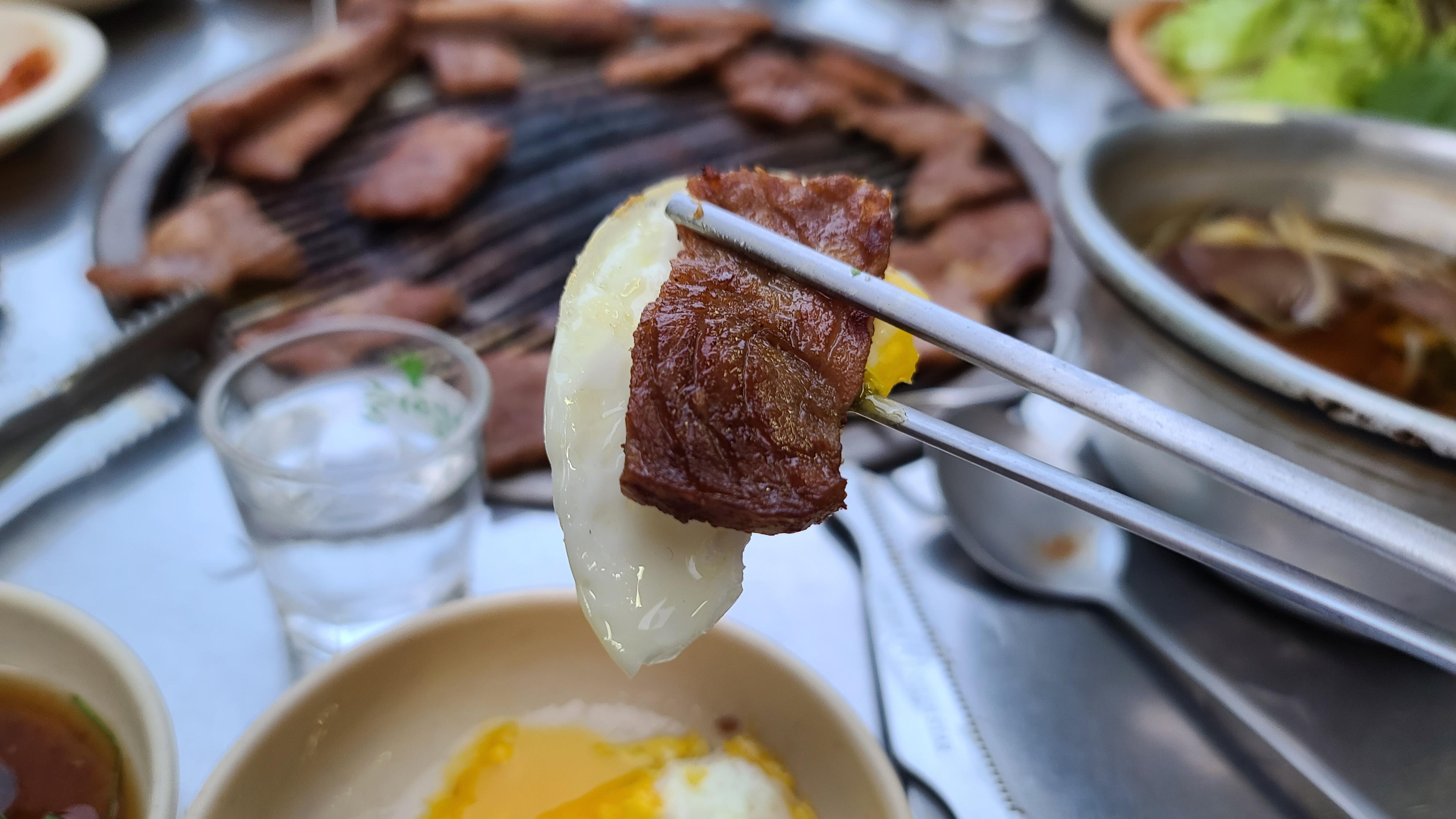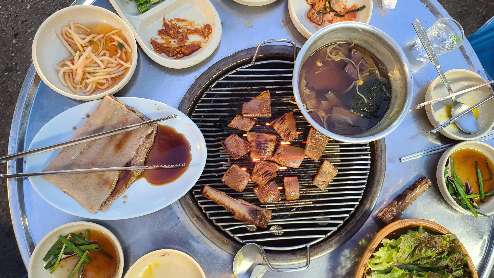 고기가 익도록 기다리고 있으니 선지해장국도 반찬으로 나옵니다. 가게이름에 왜 남문해장국이 붙는지 알 수 있을정도로 잘 끓인 선지해장국을 먹으니 식욕이 폭발하고 있습니다.