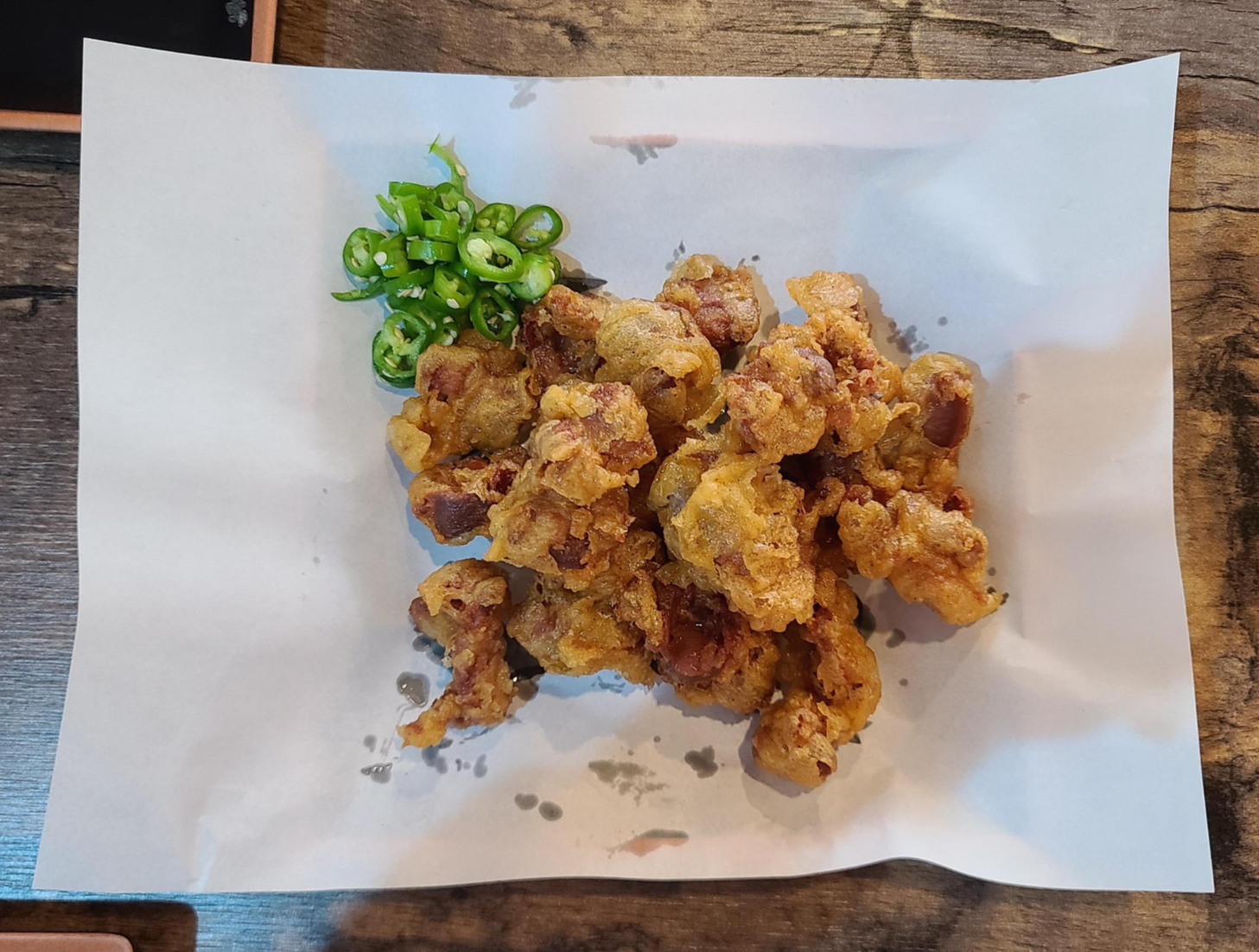 치킨은 포장을 하기로 하고 흔하지 않은 닭똥집튀김을 주문해봅니다. 경북지역에서는 흔한 음식이지만 서울권에서는 잘 보기가 힘든 메뉴입니다. 바삭바삭한 튀김옷을 씹으면 꼬들꼬들 씹혀지는 닭똥집의 맛이 일품입니다.