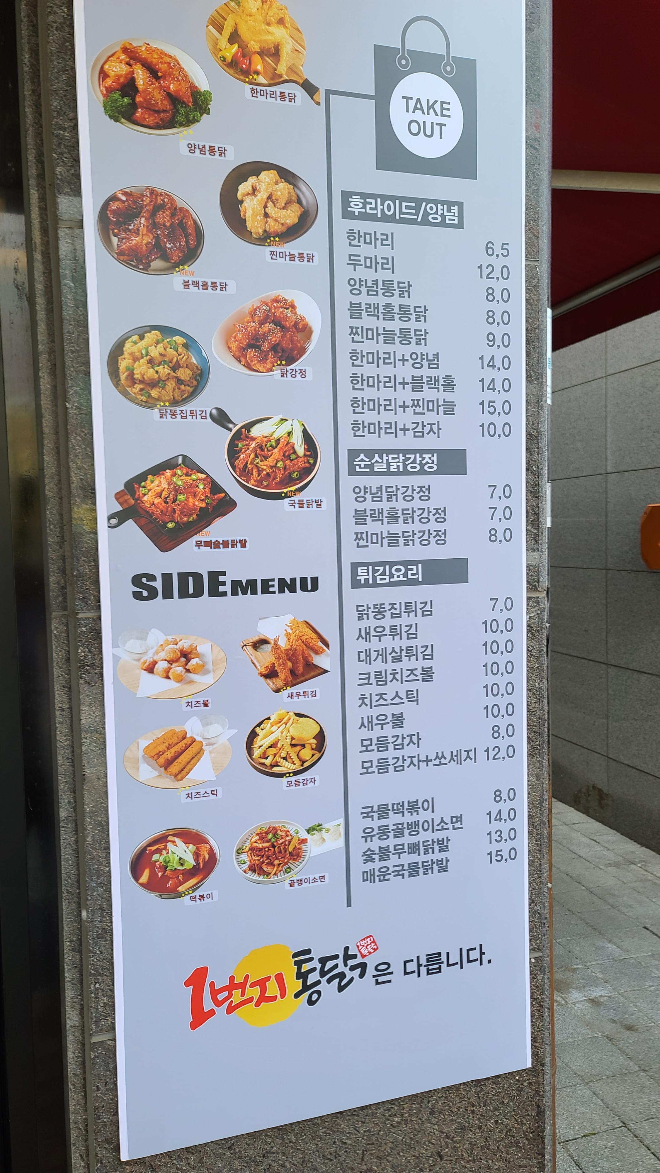 가게 주변을 보니 신장개업을 했는지 화환과 꽃화분이 둘러싸여 있습니다. 호기심이 생겨 메뉴판을 살펴보니 치킨 두마리가격이 다른 치킨체인점 한마리 가격보다 싸게 느껴집니다. 이마트 치킨가격보다 싼거 같아 퀄리티가 궁금해져서 들어가보기로 합니다.