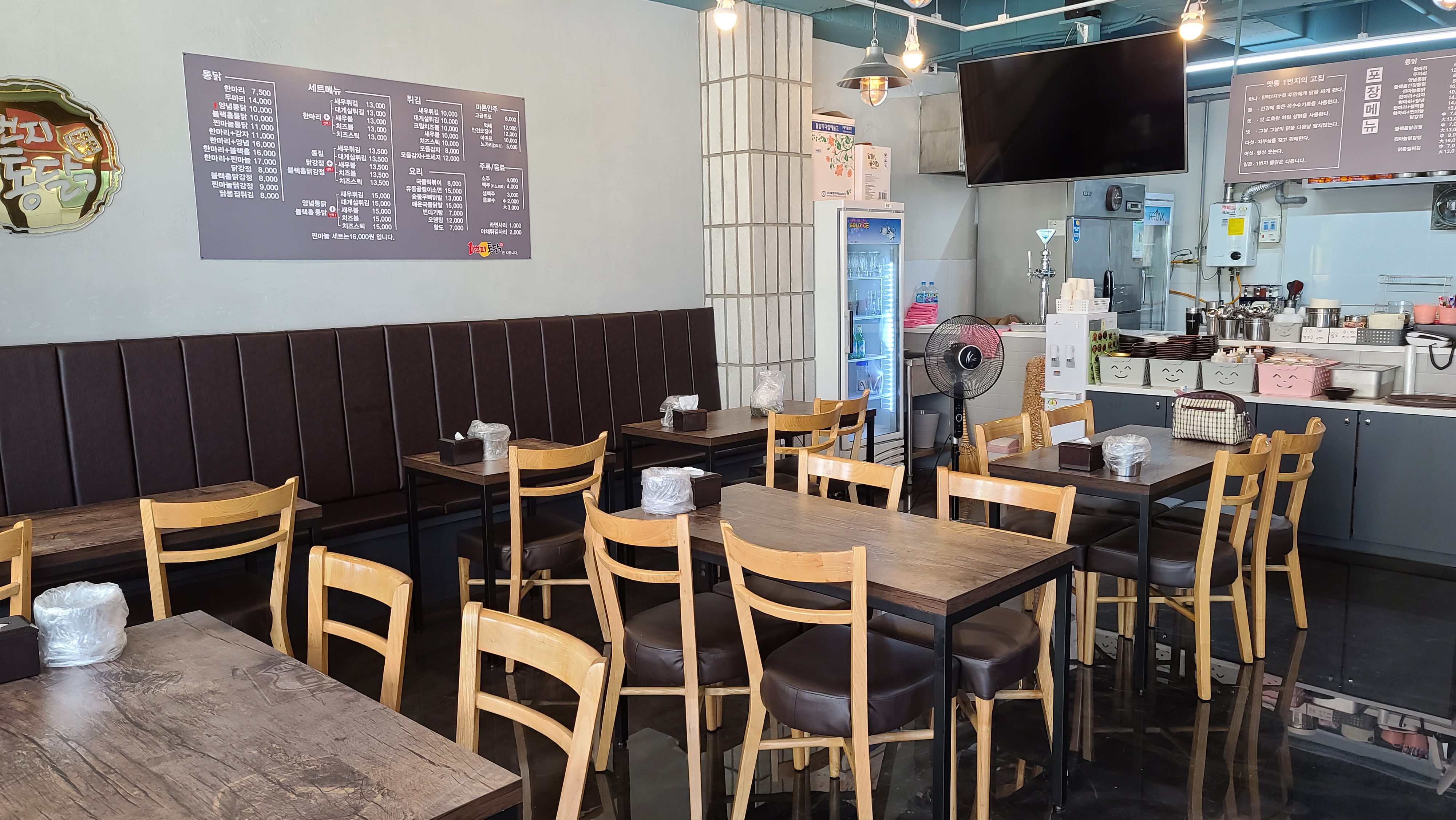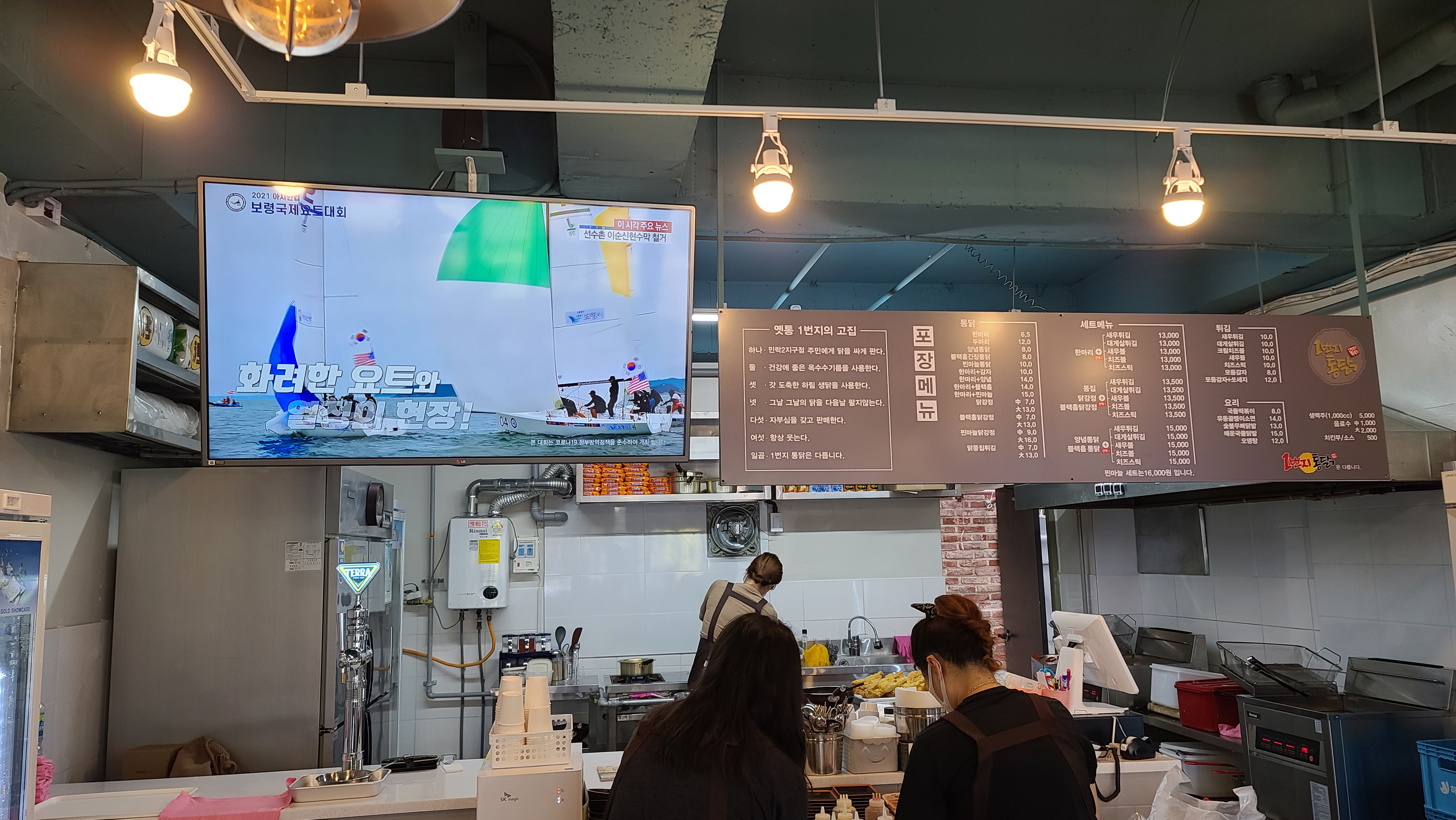 들어가서 가게안을 살펴보니 오픈형 주방이 눈에 띄고 넓은 홀과 대형 TV가 걸려있습니다. 청결한 조리과정을 보여주는 모습이 인상적이고, 축구나 야구 등 스포츠 경기를 보며 한잔하기 좋은 장소이겠구나 하는 생각이 듭니다.