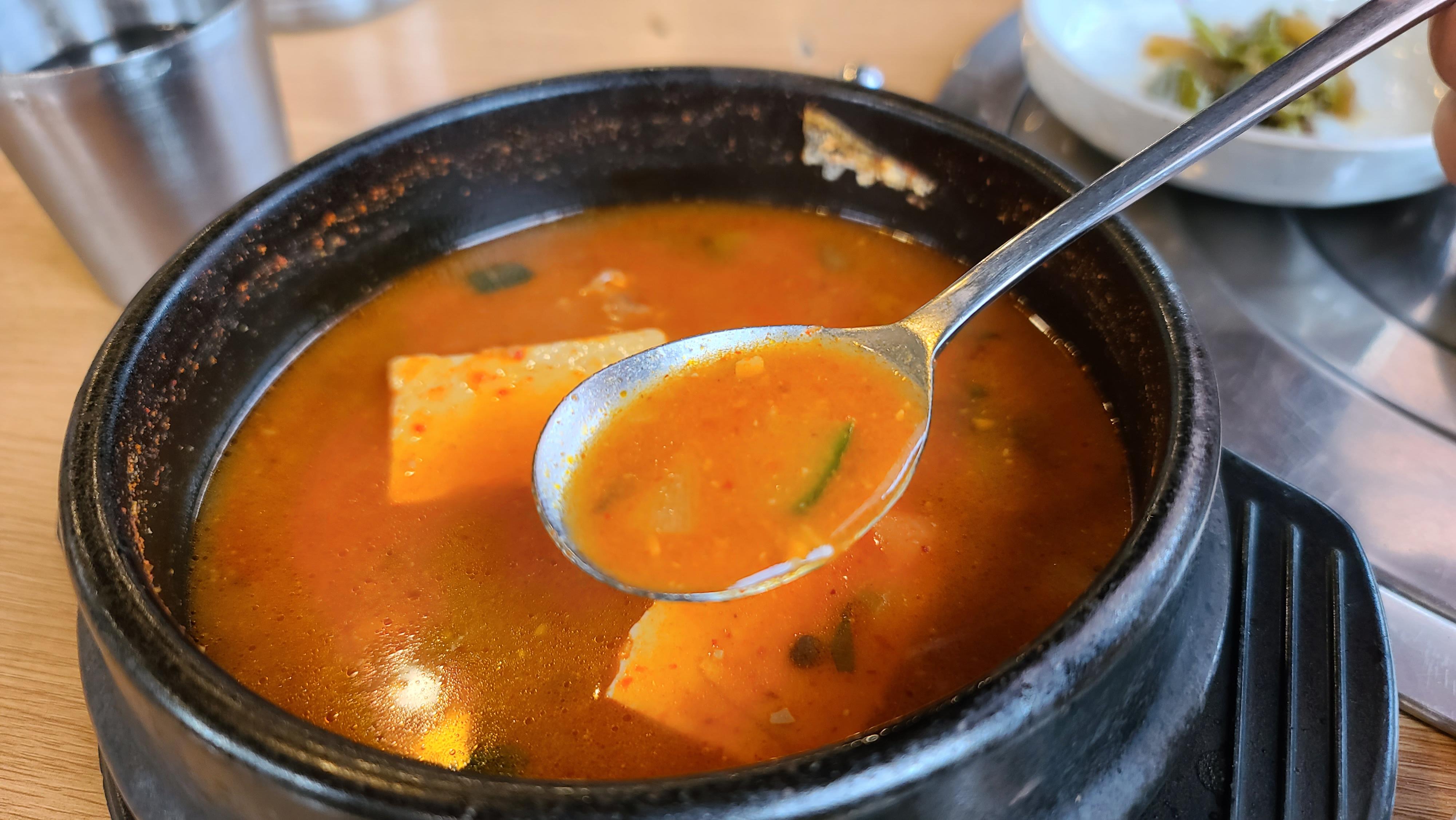 보글보글 끓는 차돌된장찌개를 떠봅니다. 두부, 애호박, 차돌, 팽이 등 건더기가 가득한게 먹음직스럽습니다. 감탄을 하며 한숟가락 떠먹어보자 적당한 간에 적당한 조미료맛 그리고 차돌까지 모든게 어우러져서 밥도둑이 따로 없습니다.