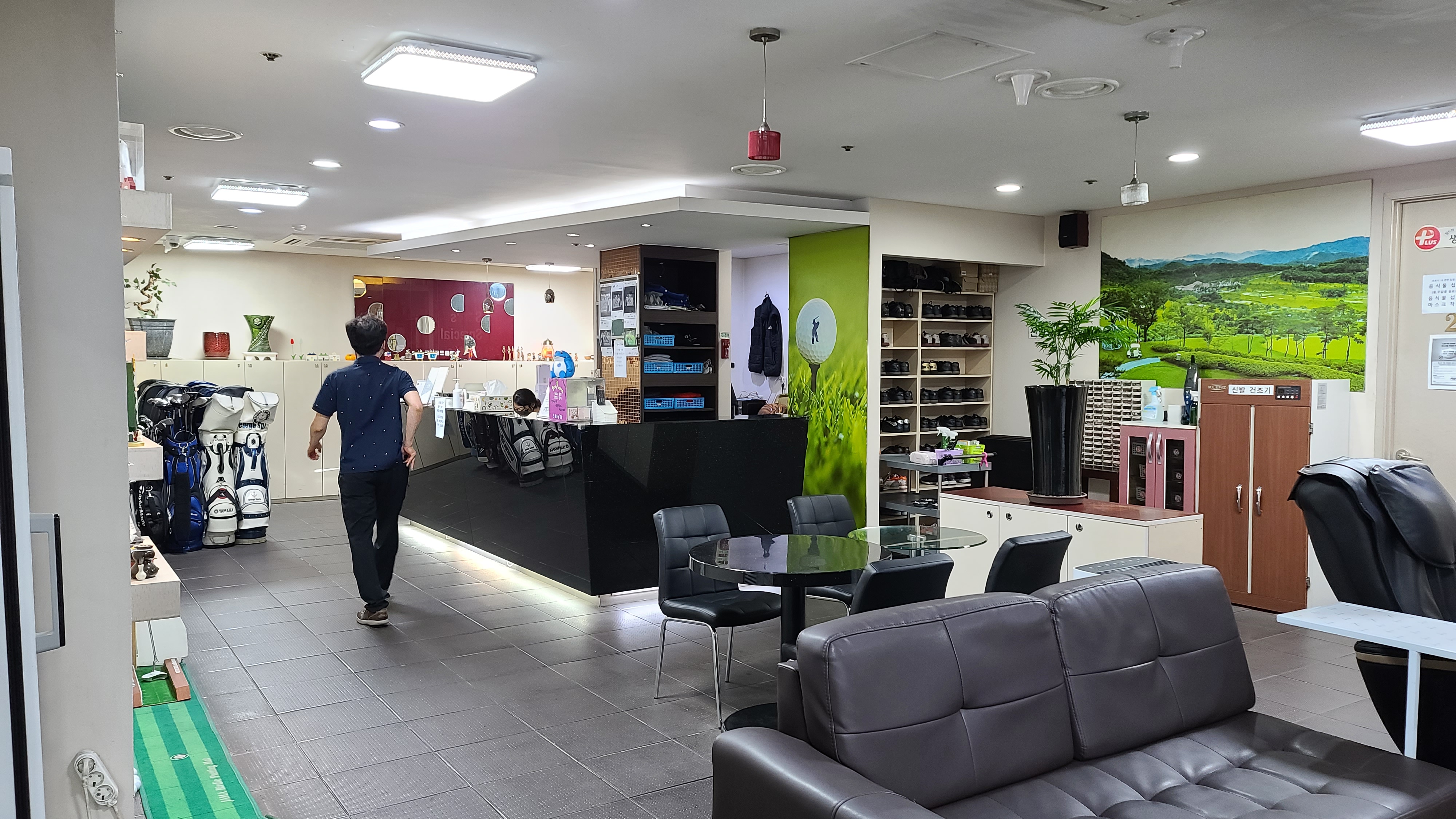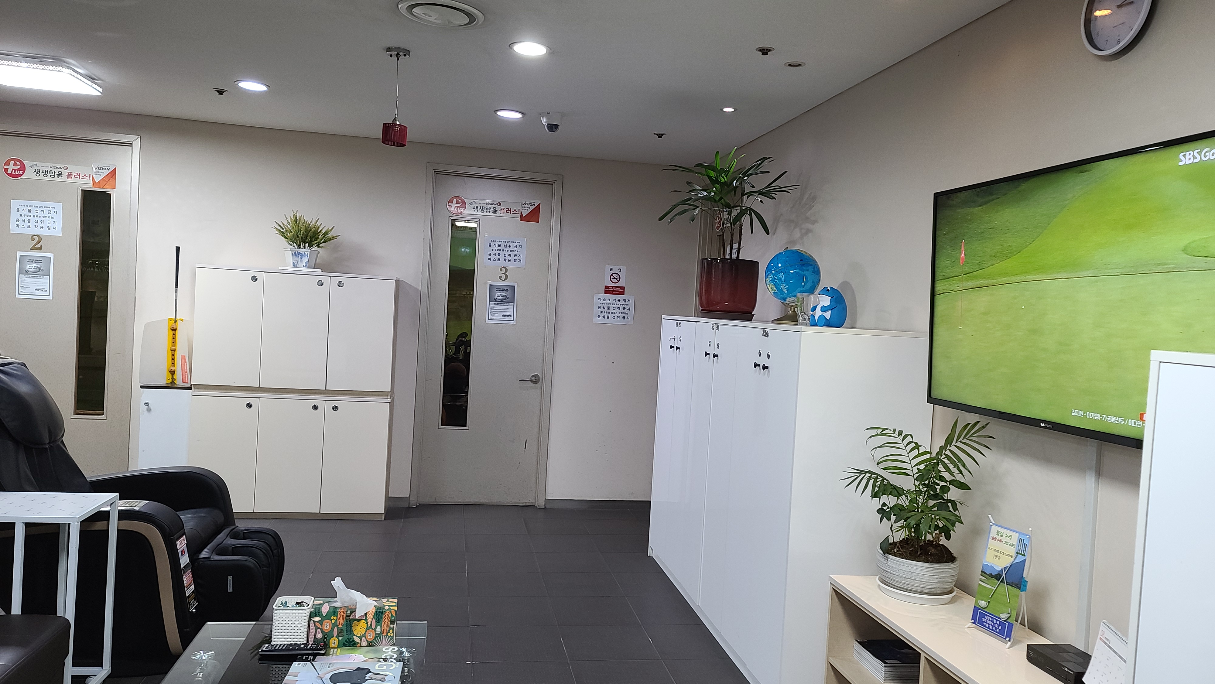 스크린골프장에 입장하니 넓은 라운지가 눈에 들어옵니다. 회원용 캐비닛들과 대형 TV 그리고 앉아서 쉴수있는 소파뒤로 카운터가 보입니다. 간판에 비해 제법 쾌적하게 꾸며놓은 모습입니다.