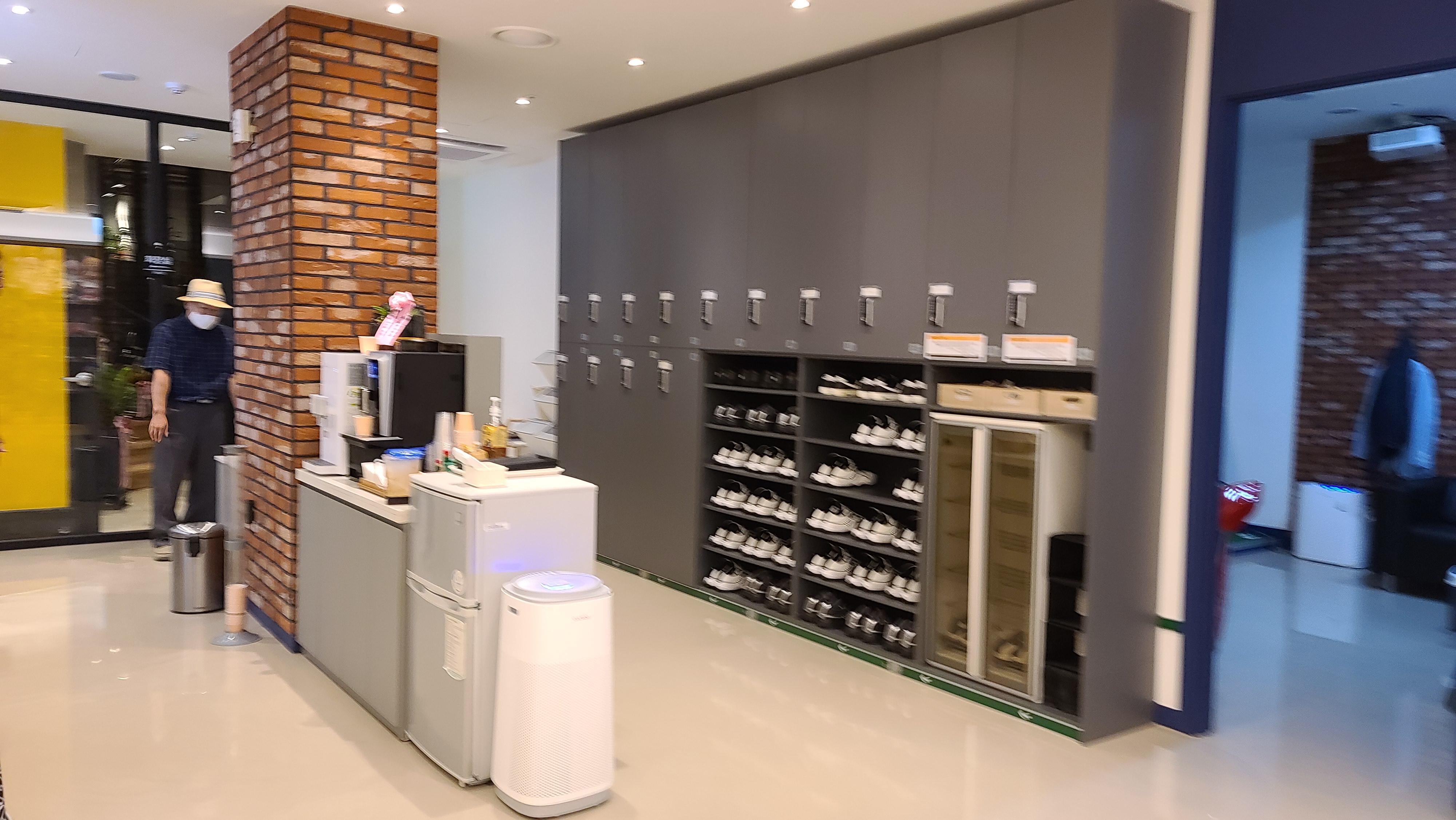 입구를 지나니 넓은 라운지가 나타납니다. 여러 캐비넷이 보이며 신밝과 장갑세트가 진열되어 있는것이 보입니다. 사장님께 말씀을 드리자 아직 시간이 조금 남아서 카페테리아로 안내를 해주십니다.