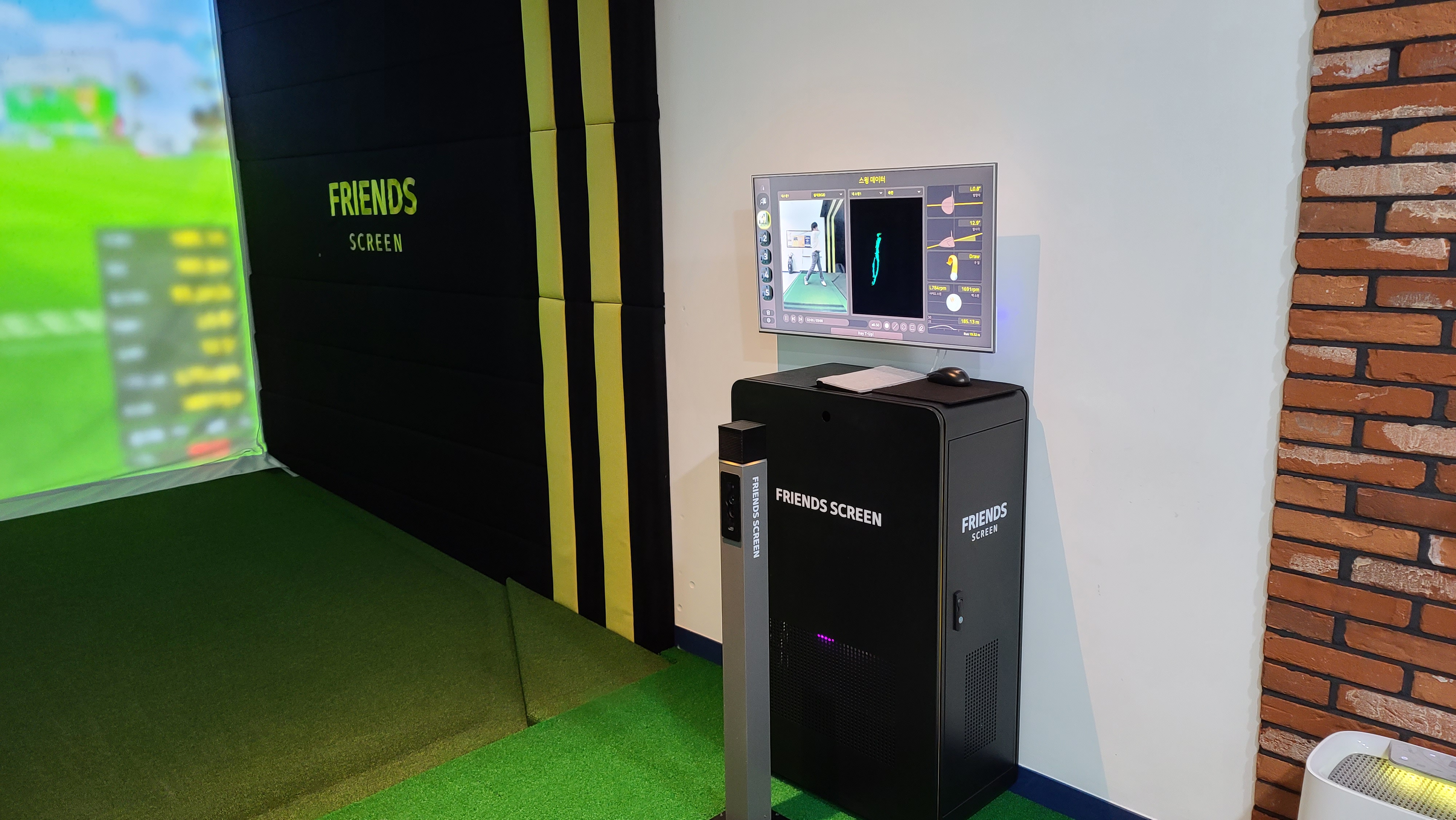 연습을 하면서 내부를 살펴봅니다. 방안에 공용채는 비치되어 있지 않고 밖에서 공용채가 담긴 골프백을 가져와야 되는 구조입니다. 시스템은 컴퓨터와 마우스 키보드로 컨트롤하는 구조이며 모니터에는 연습스윙시 자세를 반복적으로 보여주게 되어 있습니다.