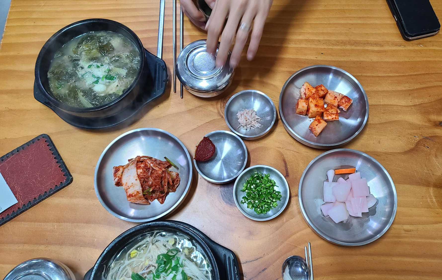 반찬을 살펴보니 김치와 피클이 보입니다. 김치를 보니 겉절이 스타일로 직접 만드는것 같아 맛있어 보입니다.