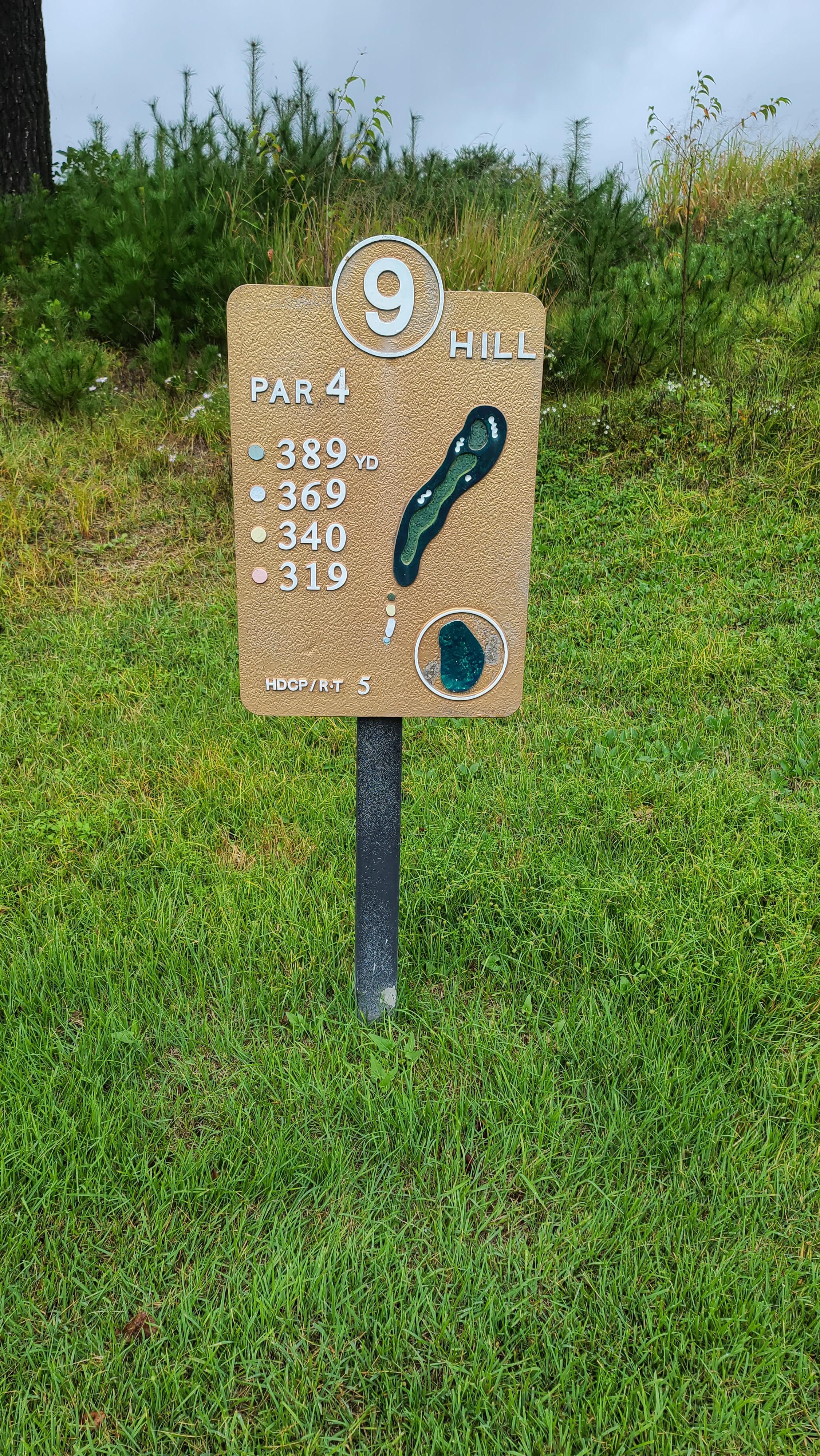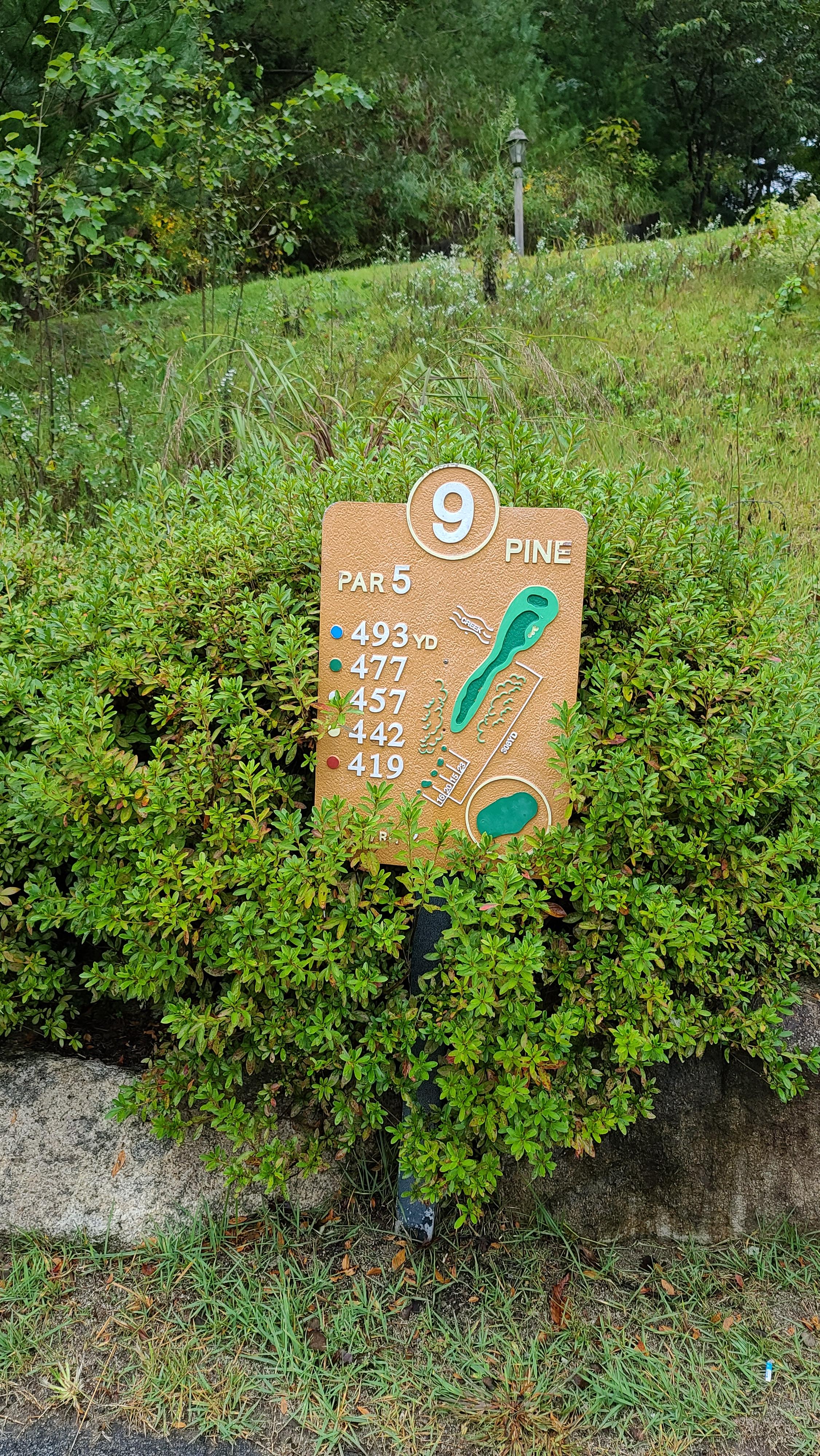 9번홀 파5코스입니다. 내리막 424m 코스로 장타자라면 충분히 2온을 노릴 수 있는 코스입니다만 좁고 시야를 방해하고 약간의 굴곡이 있어 극과극의 결과를 보여줄수 있는 코스입니다. 마지막홀이기 때문에 마음껏 휘둘러봅니다.