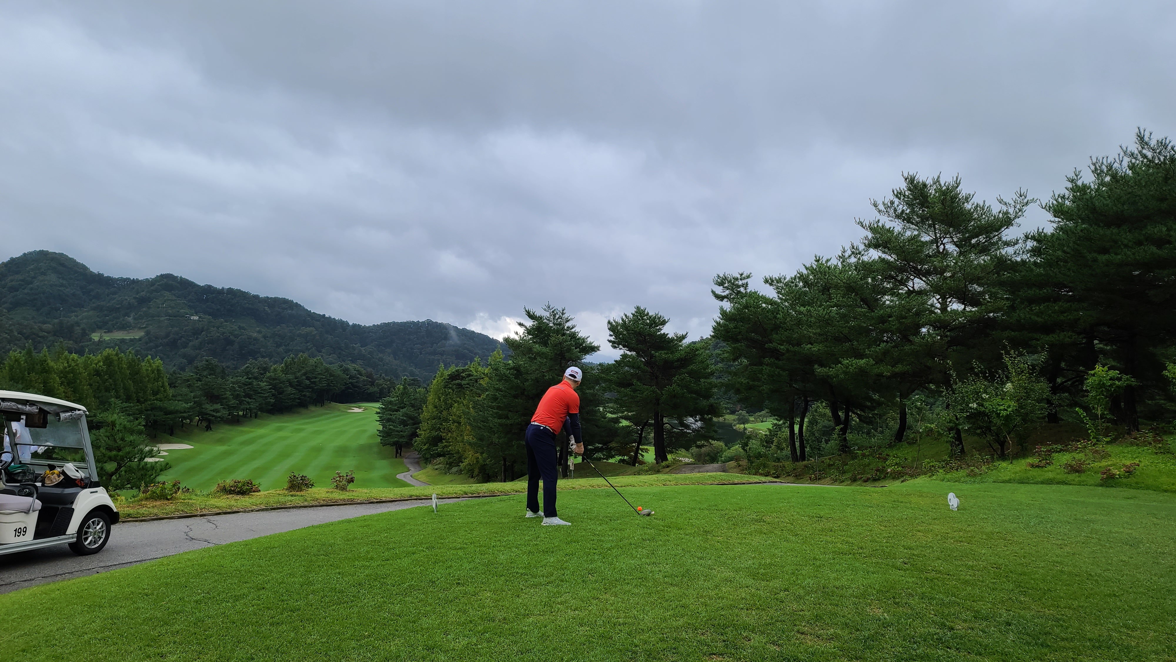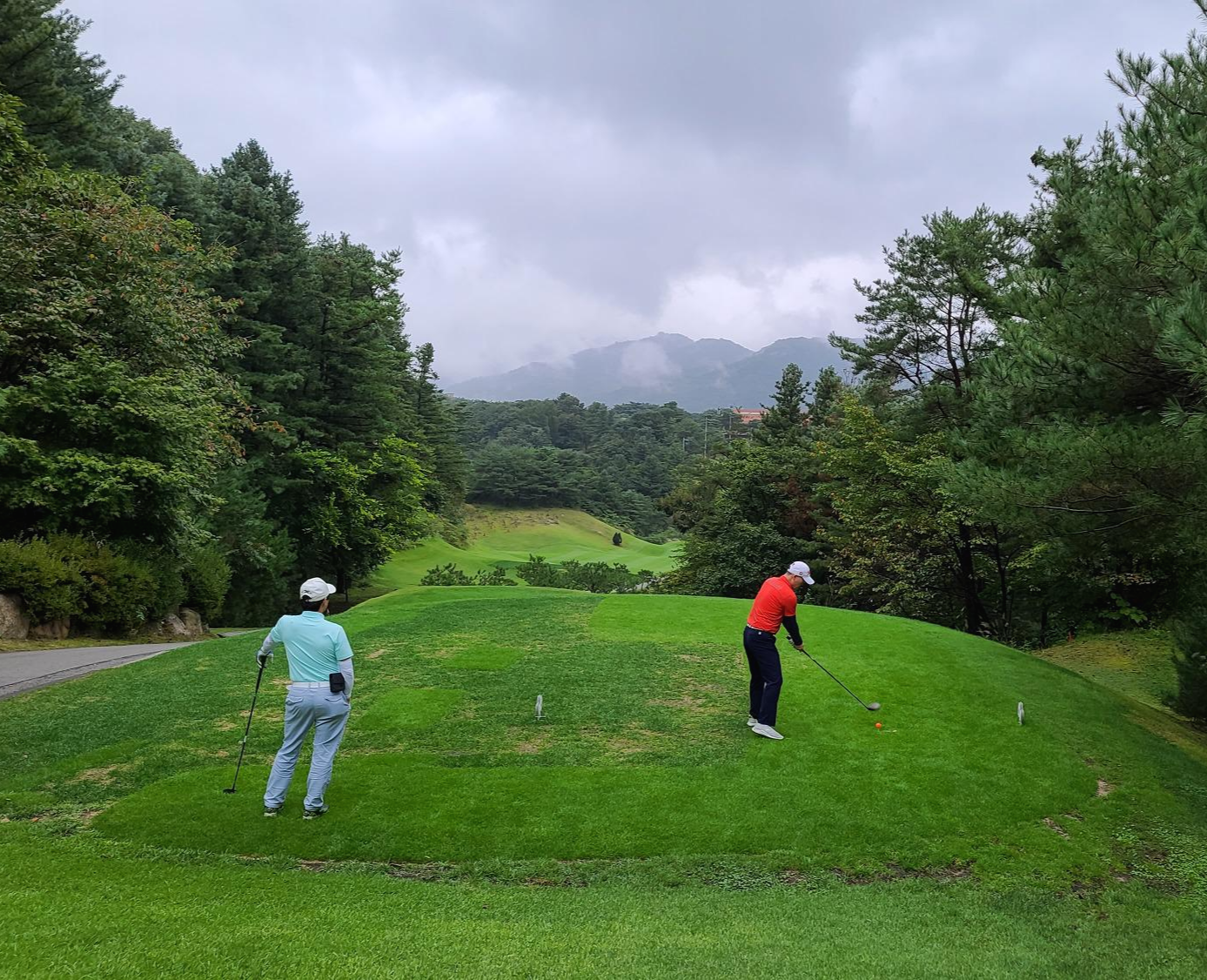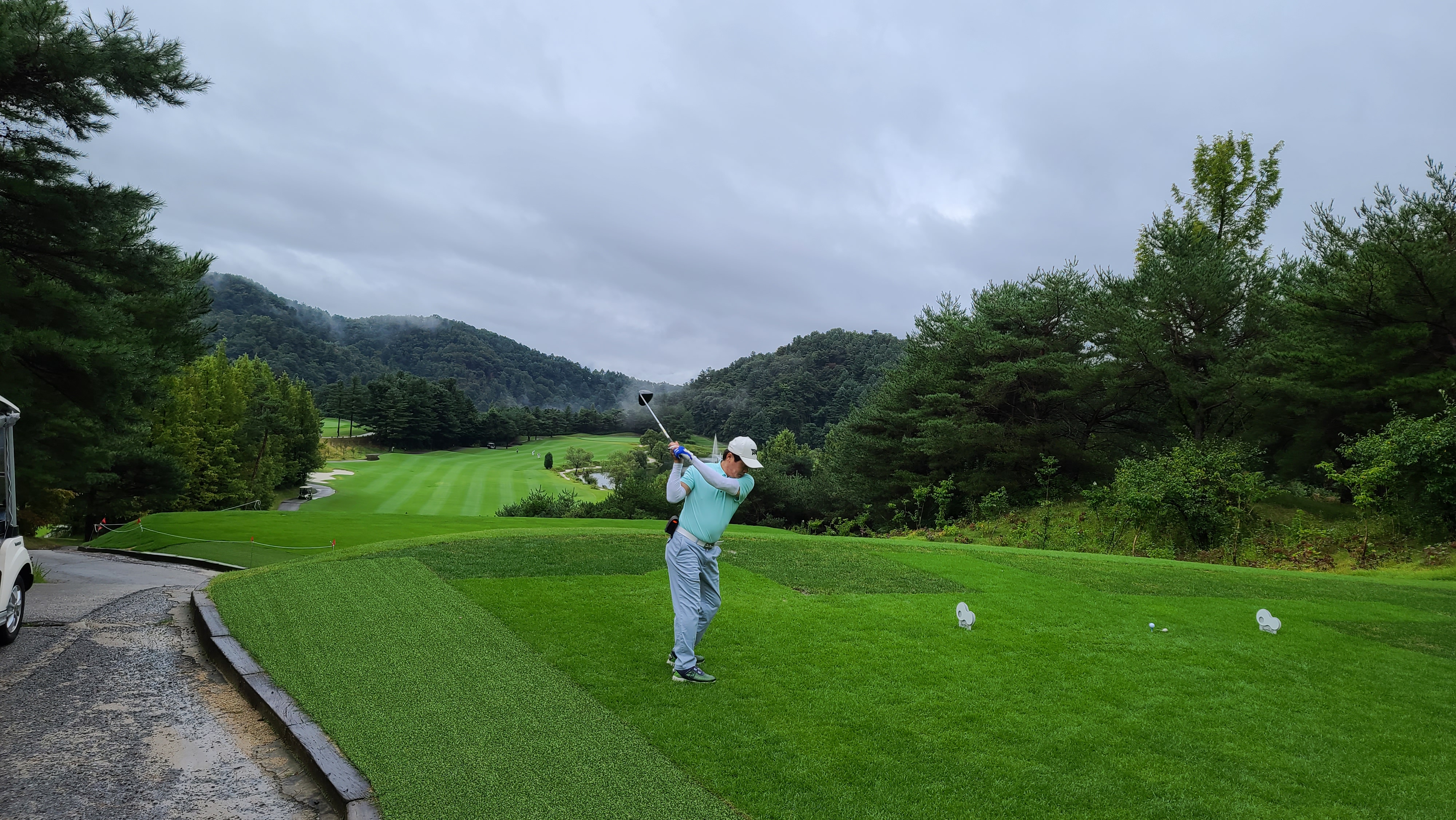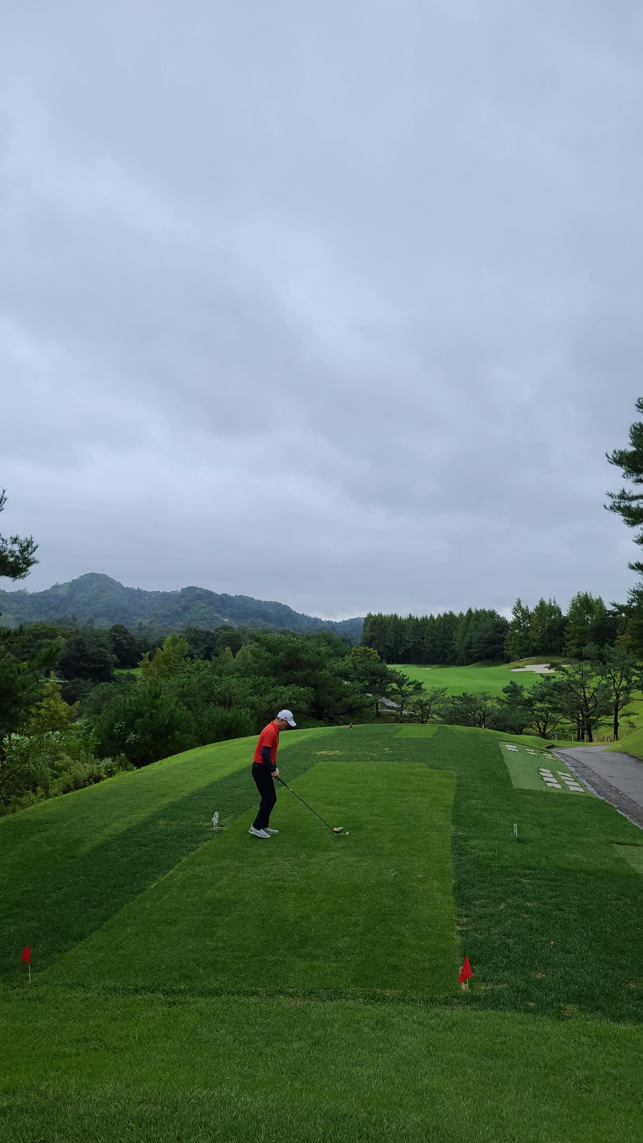 힐코스 1번홀 드라이버 샷의 모습입니다. 왼쪽을 겨냥하여 세컨샷을 안정적으로 할수있는곳으로 볼을 보내는 모습입니다. 티샷은 항상 에임이 중요합니다.