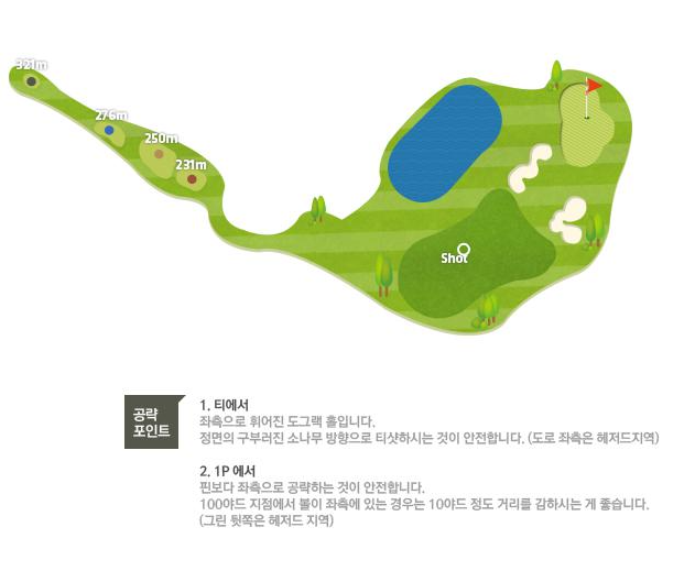 파인코스 5번홀을 좌측으로 휘어진 도그렉홀입니다. 사진에서 보이듯이 왼쪽은 나무에 가려져서 시야에 보이지 않지만 넓게 펼쳐져 있습니다. 왼쪽을 공략하는 것이 쉬우나 나무에 걸릴우려가 있고 훅이나는 경우 해저드가 도사리고 있으므로 안전하게 중앙을 공략합니다.