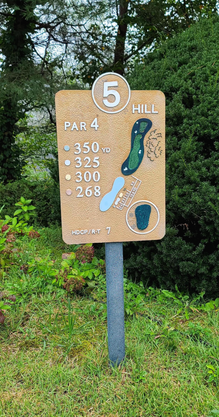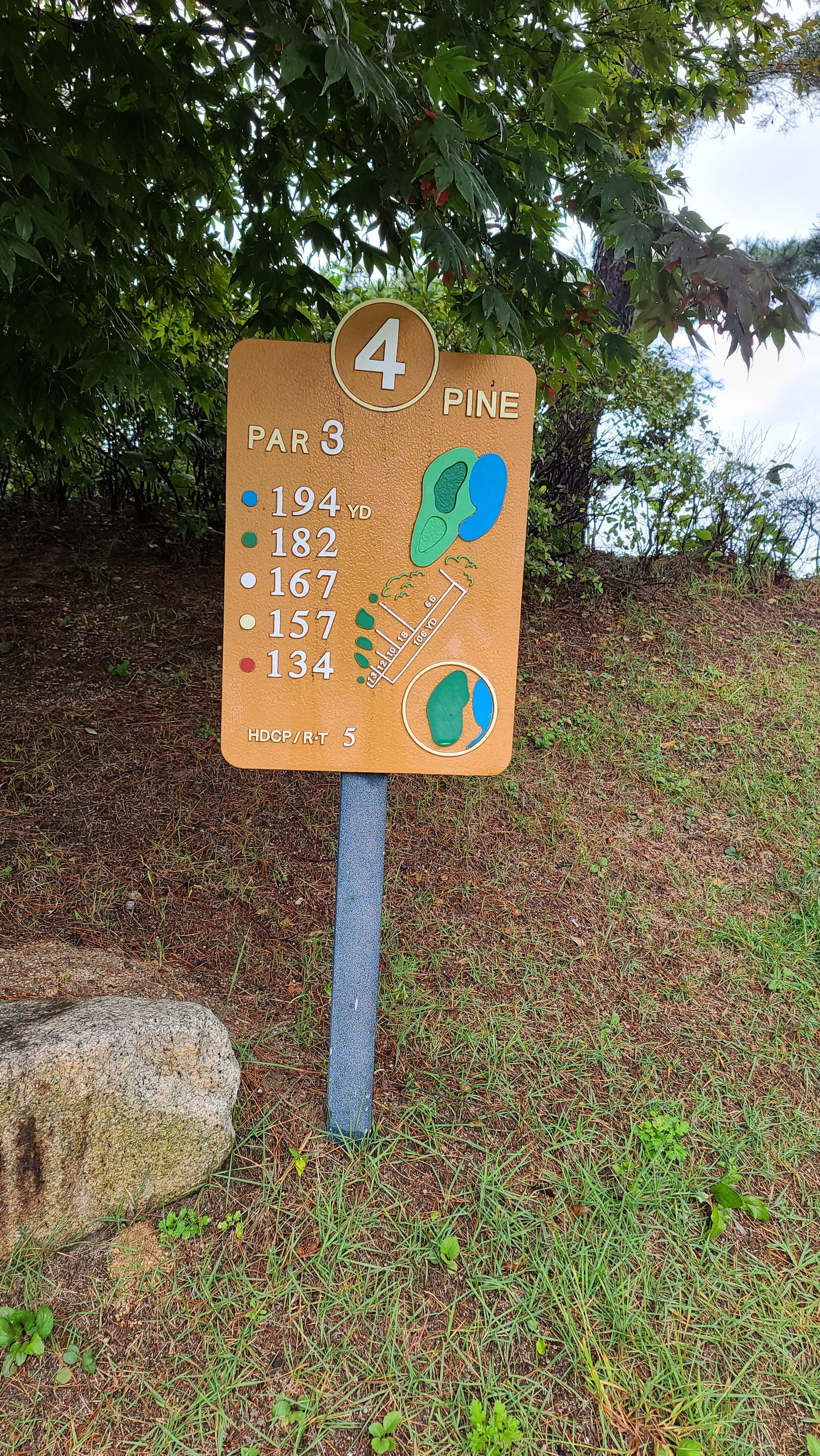 4번홀 파3의 모습입니다. 길이가 길지 않고 내리막으로 이루어져 있기 때문에 런까지 생각하면 클럽을 짧게 잡는것이 유리합니다. 내리막 그린 좌우측은 사진에서도 보이듯이 상당히 좁게 이루어져 있기 때문에 정교한 아이언샷이 요구되는 파3홀입니다.