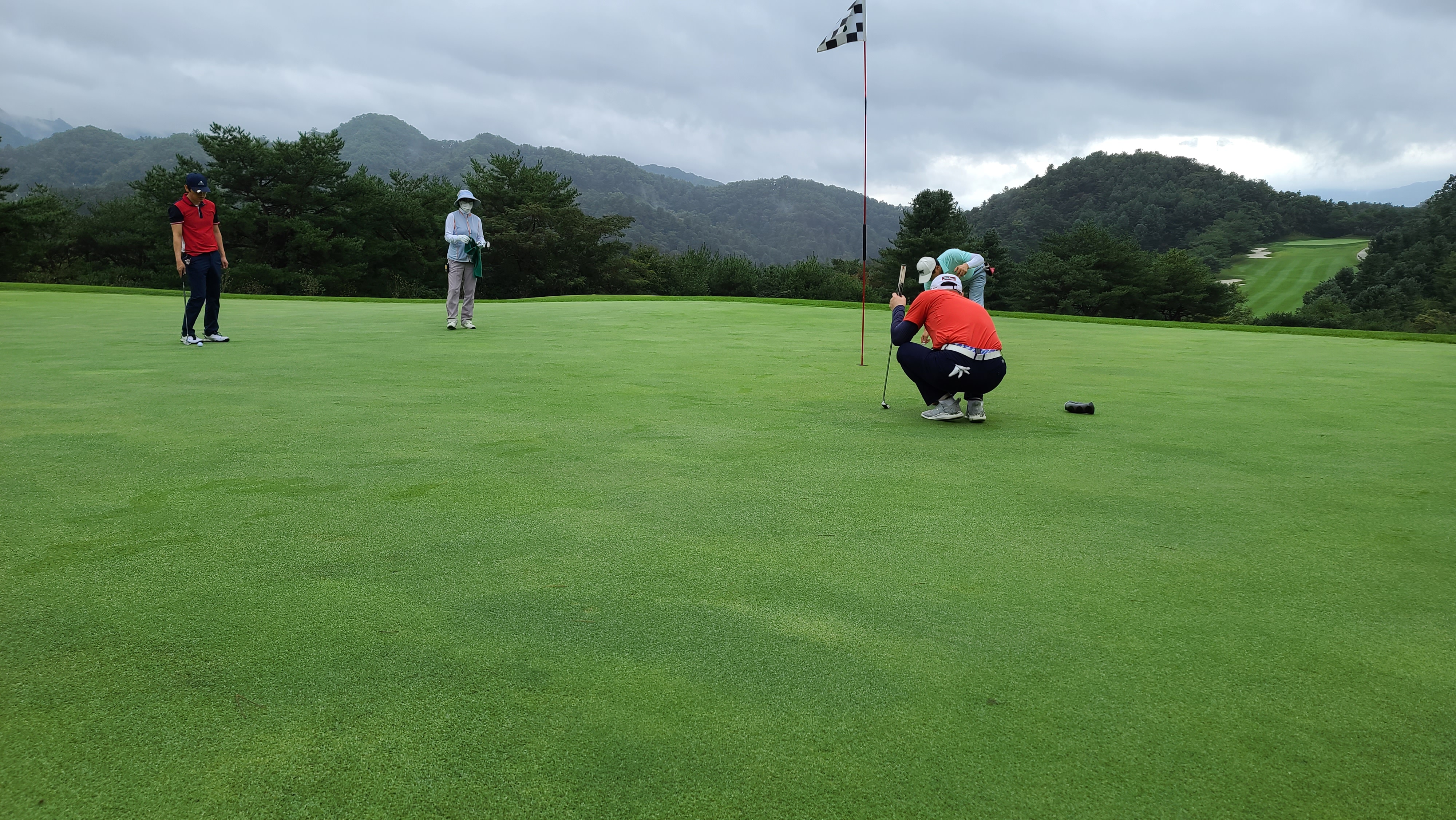 전반을 마치기전 비가 조금씩 내립니다. 비오는 날 골프엔 손이 미끄러운게 가장 큰 어려움이므로 전용골프타워를 꺼내서 손을 닦아가며 플레이를 합니다. 전반 마지막 라운드라서 모두 신중히 퍼팅을하는 모습입니다.