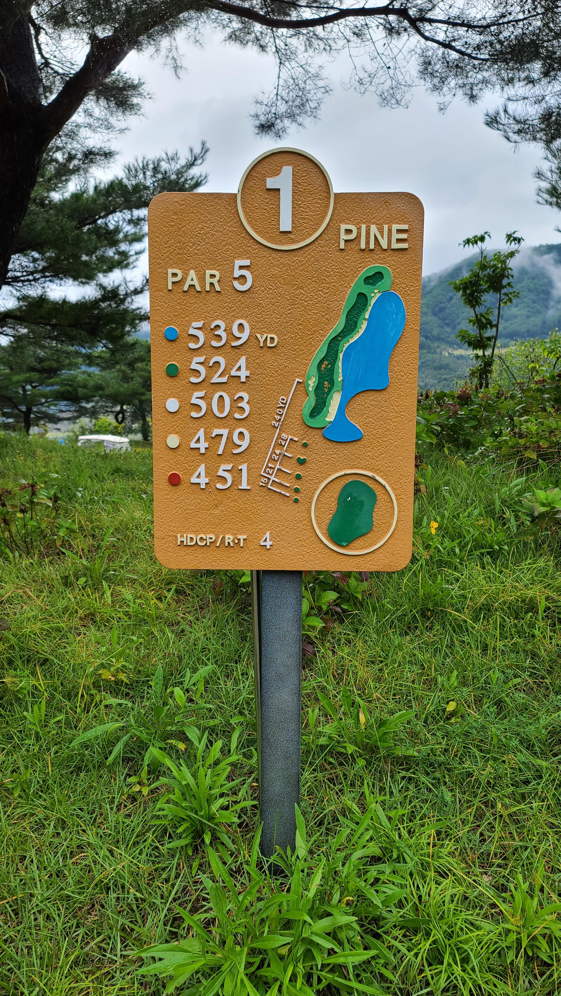후반은 힐코스에서 시작합니다. 1번홀은 파4 우측으로 약간 휘어진 홀입니다. 우측이 OB이기 때문에 좌측을 겨냥하여 티샷을 하는것이 유리합니다.