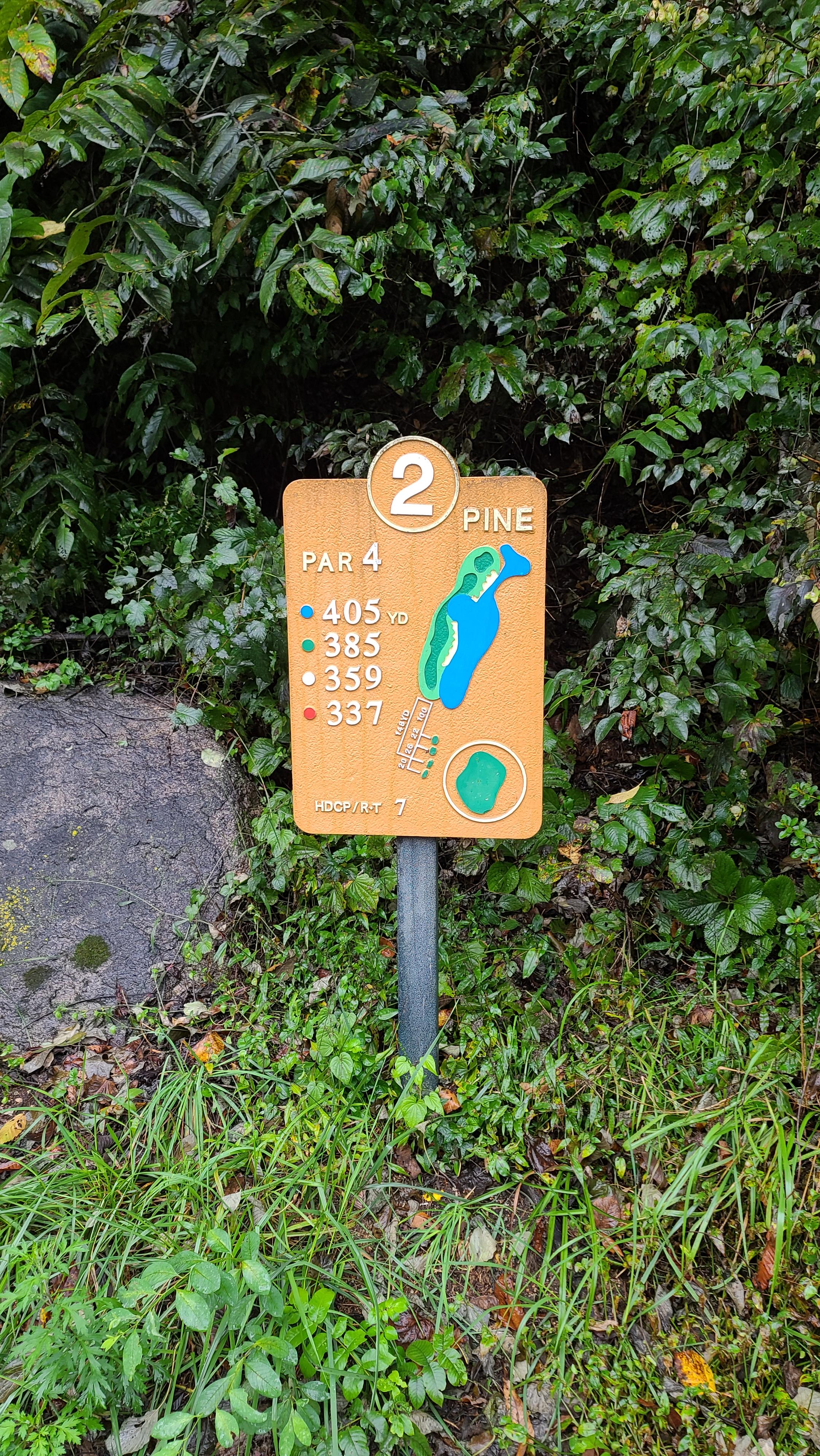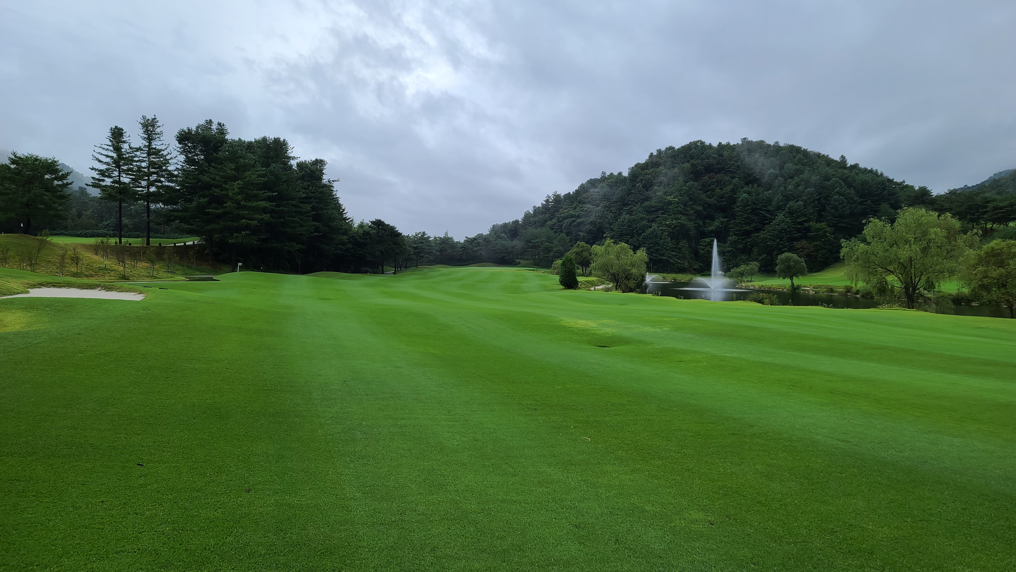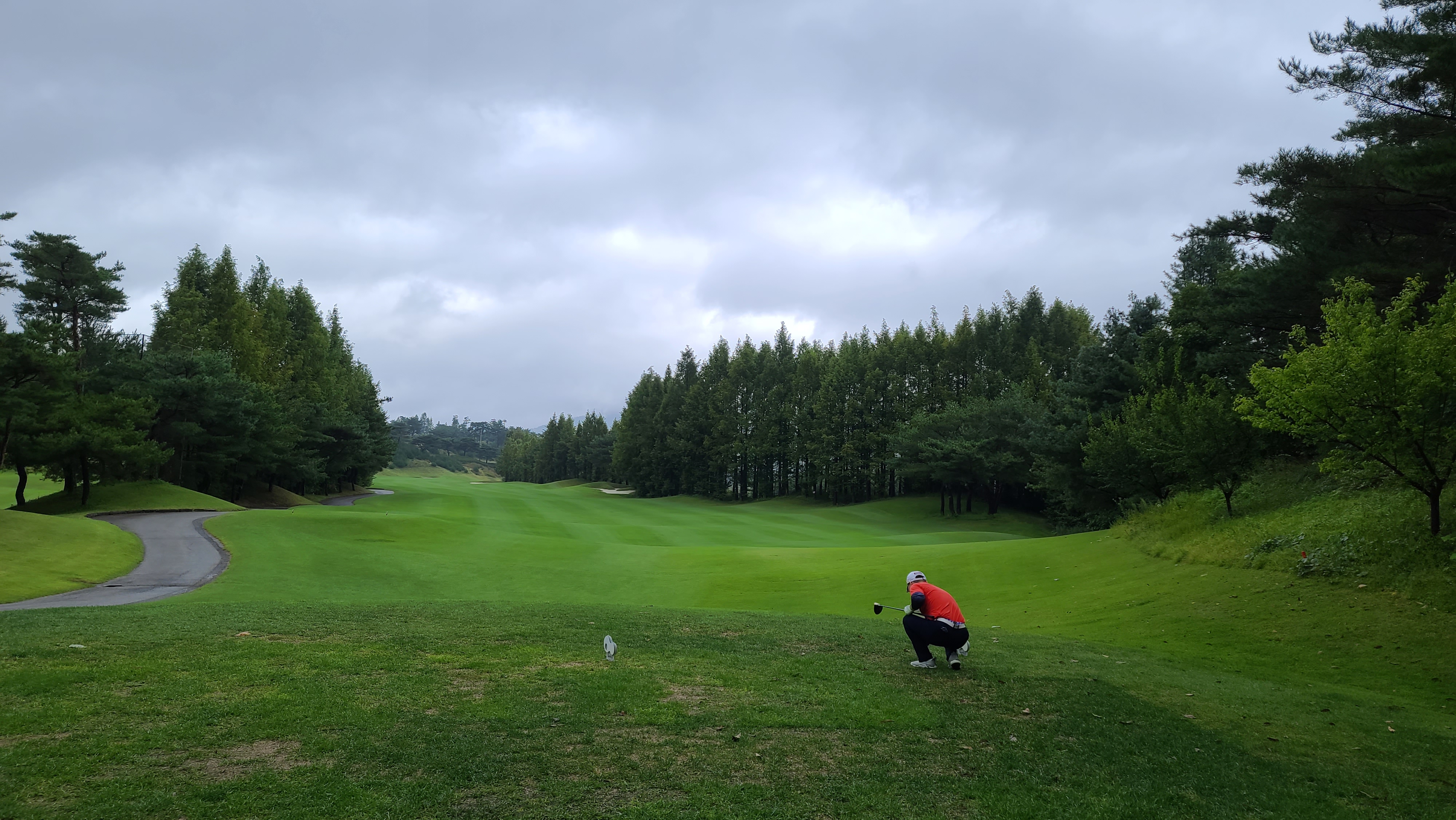 파인코스 7번 파4홀의 모습입니다. 직선으로 이루어져 있지만 좁고 시야를 가리기 때문에 어려워보이는 코스입니다. 파인코스는 이름답게 침엽수들이 우거져 있어 법면을 노리고 쳐도 공이 잘 굴러나오지 않는 어려운 난이도를 보여줍니다.
