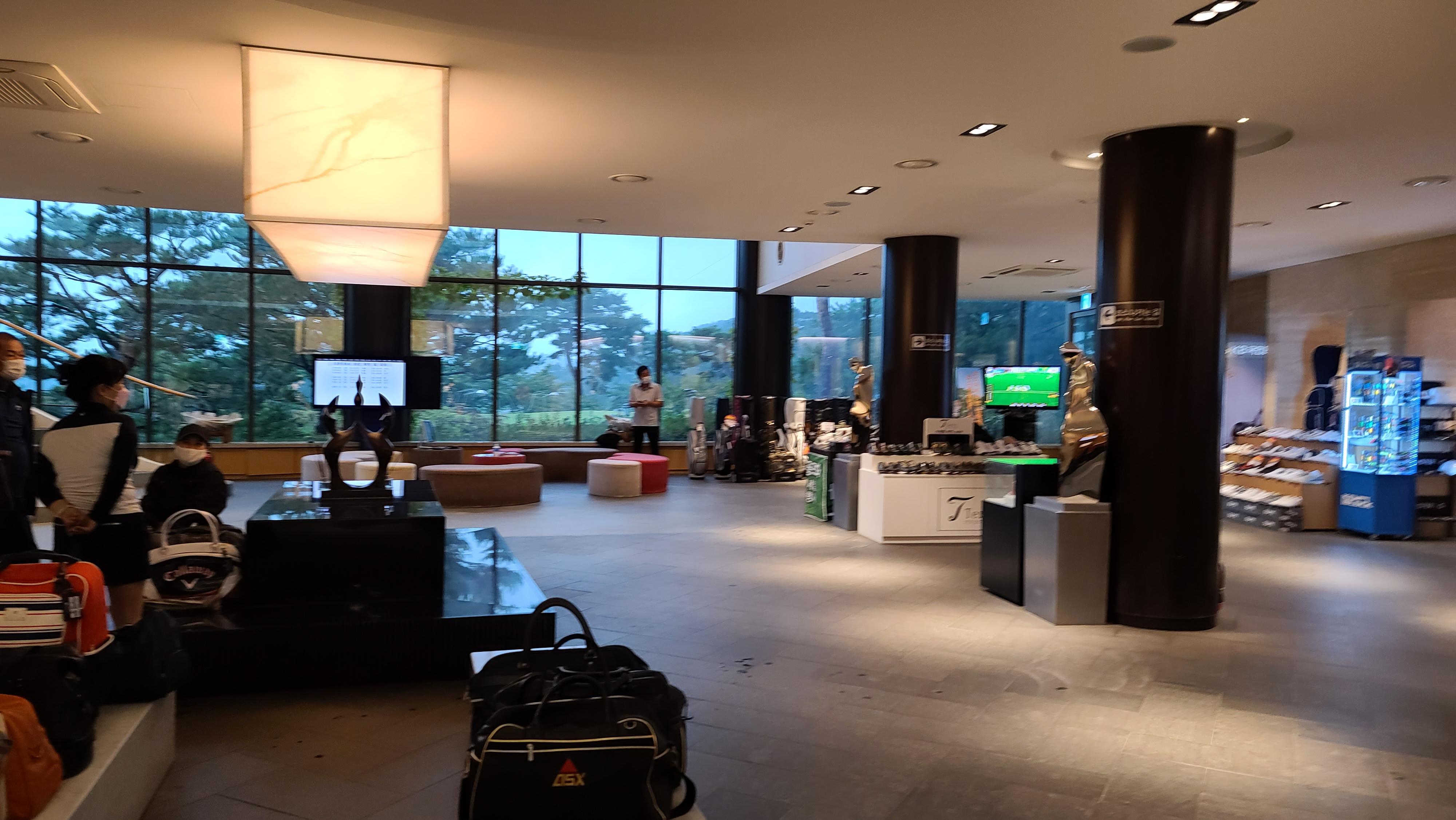 클럽하우스 로비로 들어가서 좌우측을 살펴봅니다. 좌측에는 탈의실 우측에는 카운터가 위치해 있으며 2층에 식당이 자리하고 있는 구조입니다.