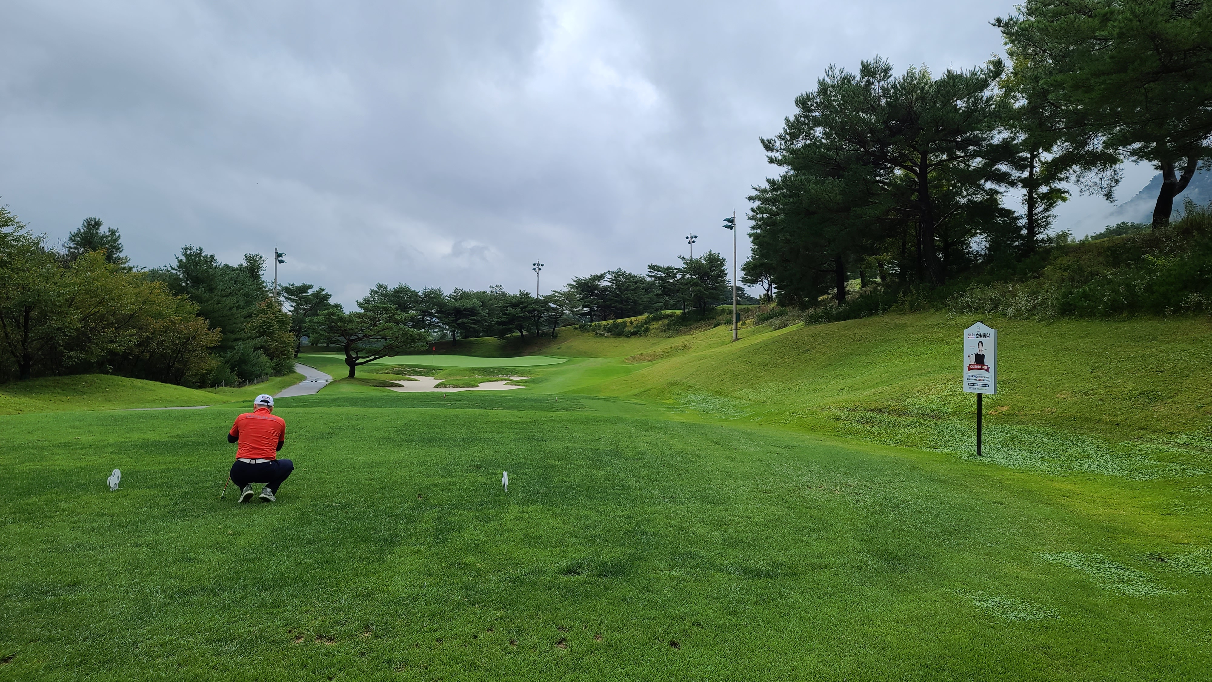 티샷후 카트 도로 주변에서 세컨샷위치에서 바라본 그린의 모습입니다. 티샷위치에서는 나무에 가려져서 안보이지만 상당히 짧게 남은 거리로 장타자라면 원온도 가능한 코스입니다.