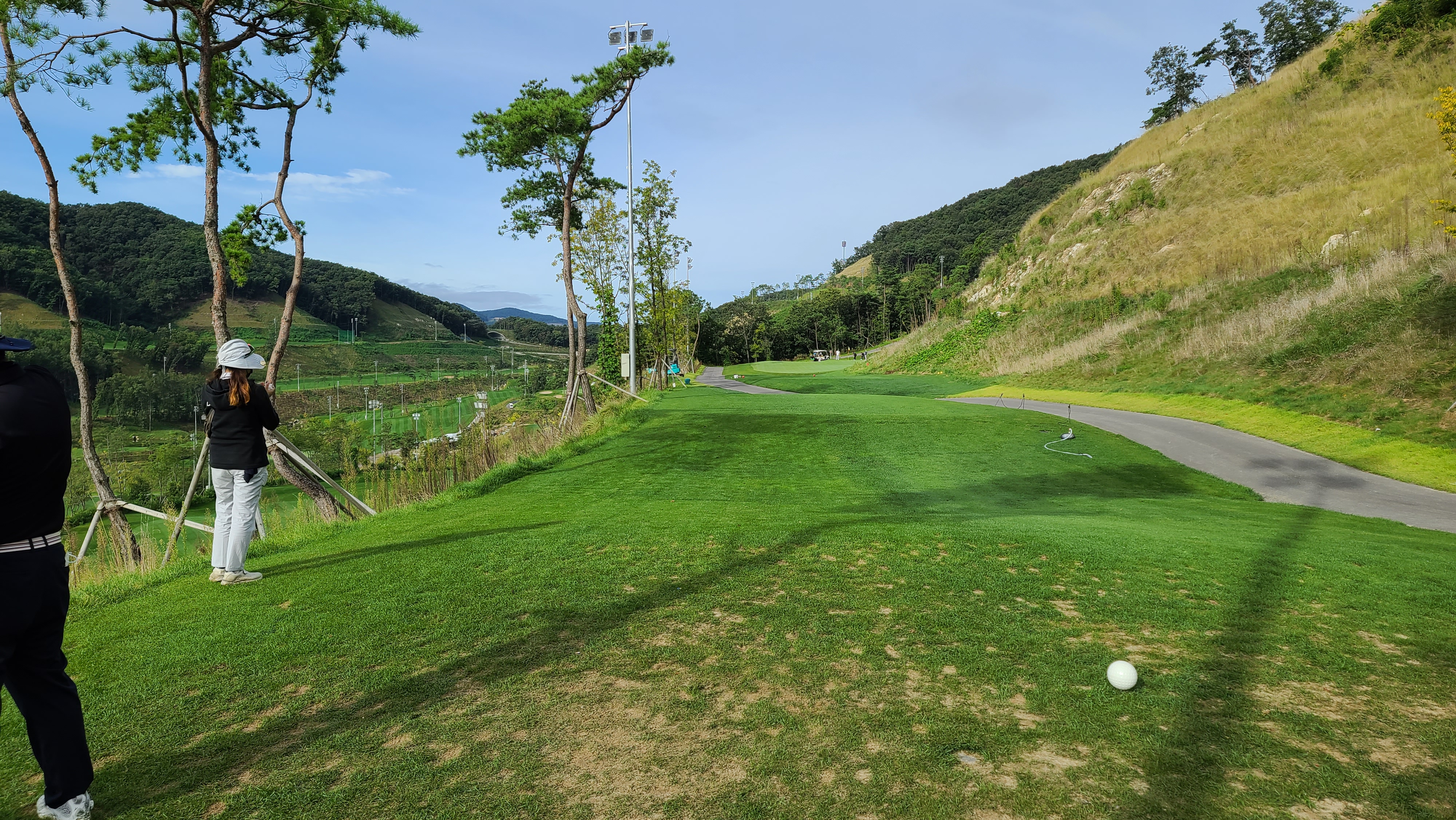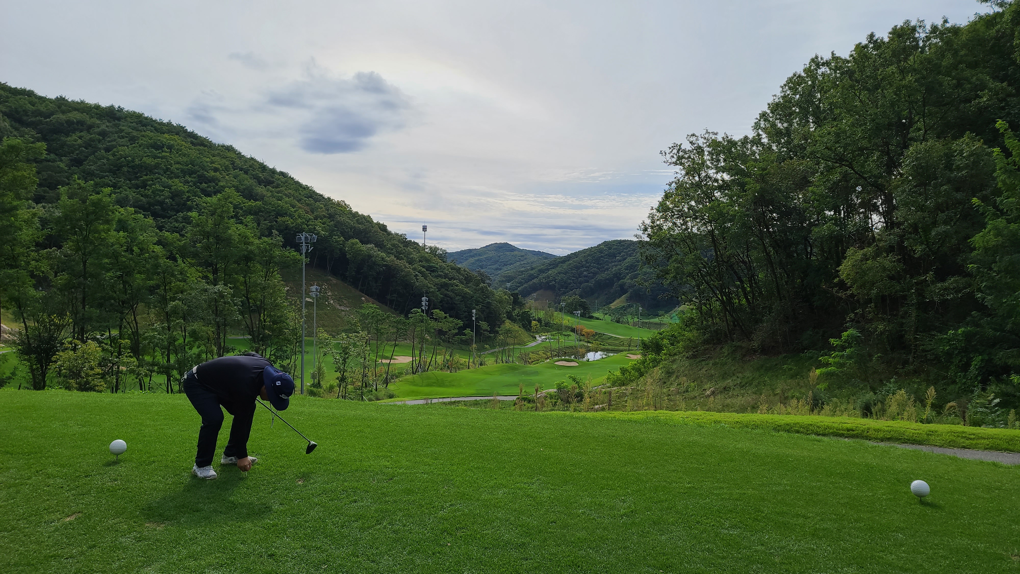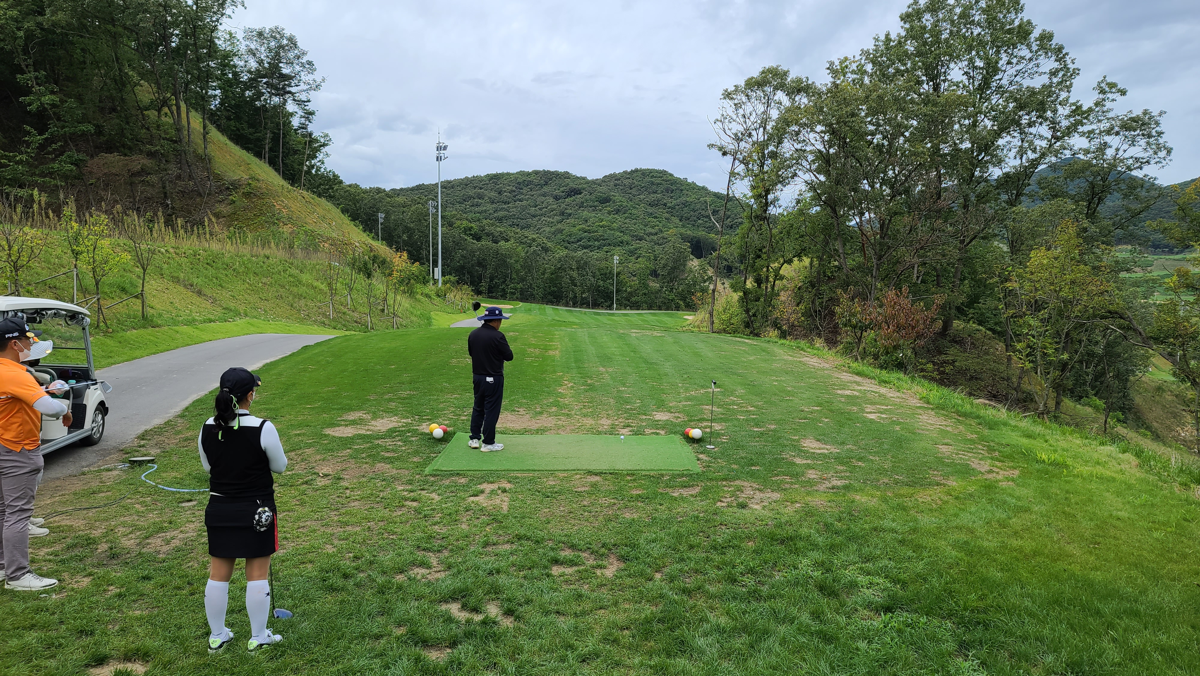 마운틴홀부터 시작 1번부터 파5홀입니다. 좌측으로 휘어진 도그렉홀로서 우측이 OB이기 때문에 좌측을 겨냥하는 것이 좋습니다. 티샷에어리어에 사람이 있어서 뭔가 봤더니 판매용 기념사진을 찍어주시는 분입니다. 첫홀의 부담감에 거리가 긴 파5홀 거기에 사진촬영까지 긴장감을 최대로 이끌어올리고 있습니다.