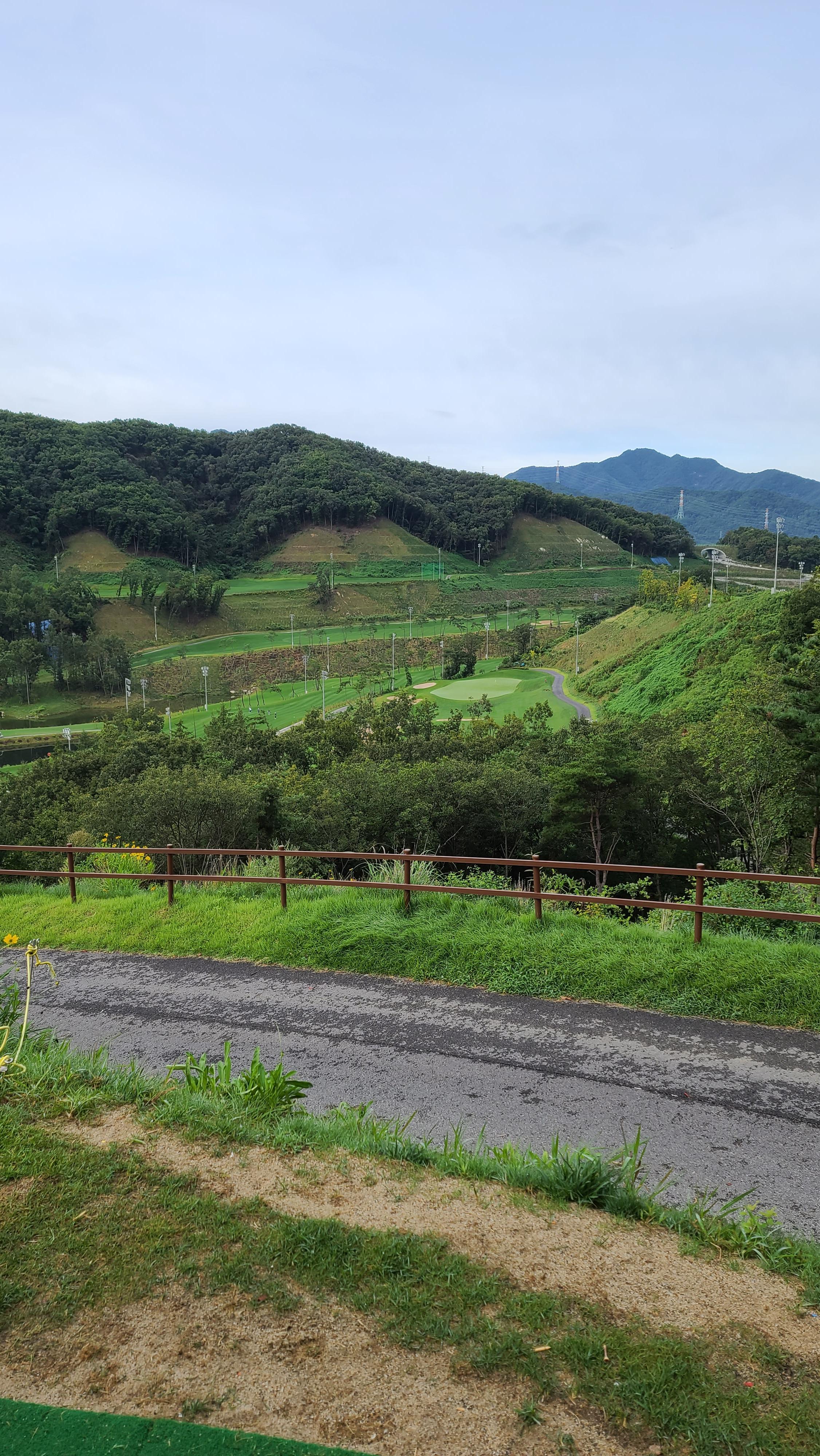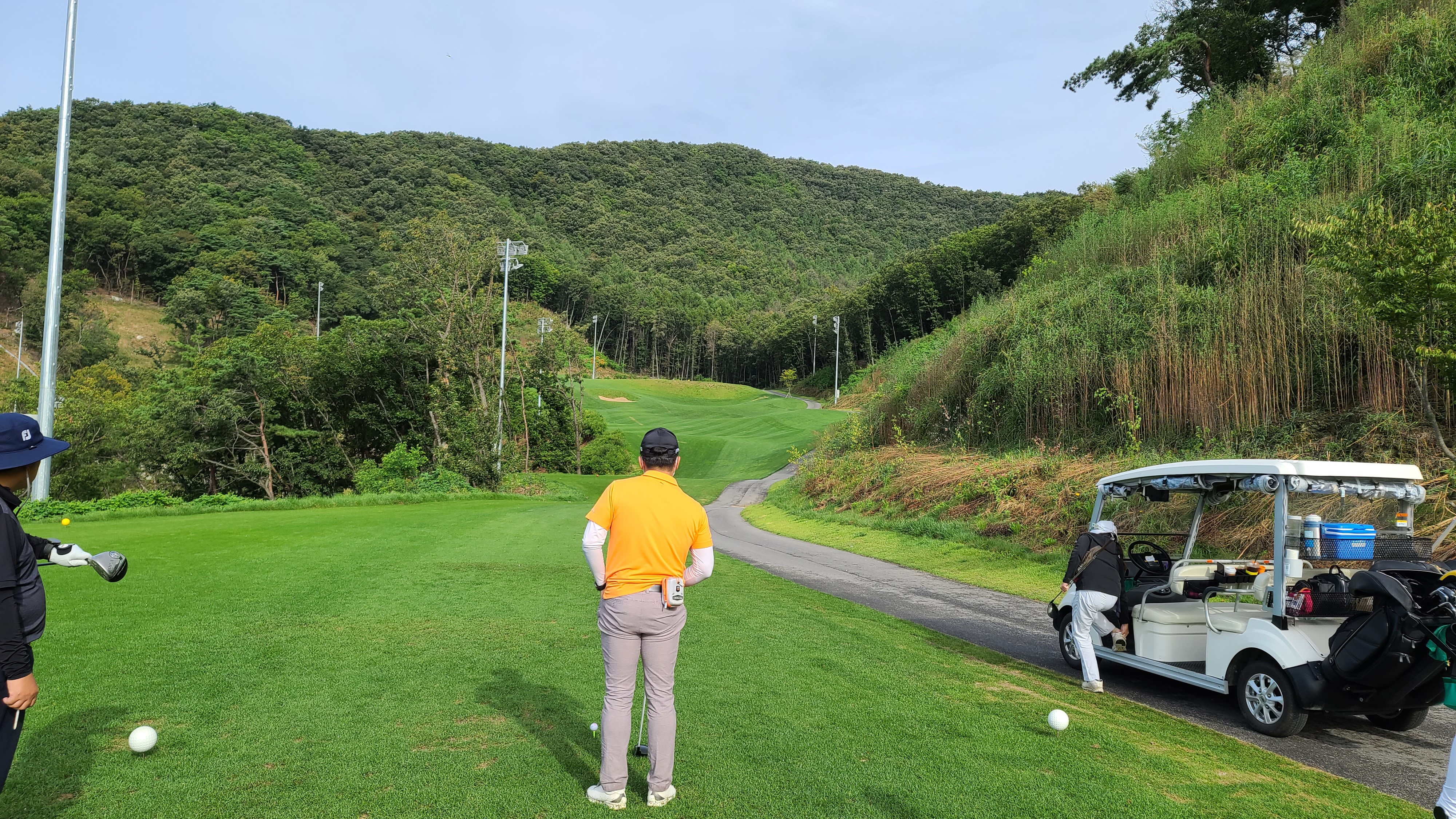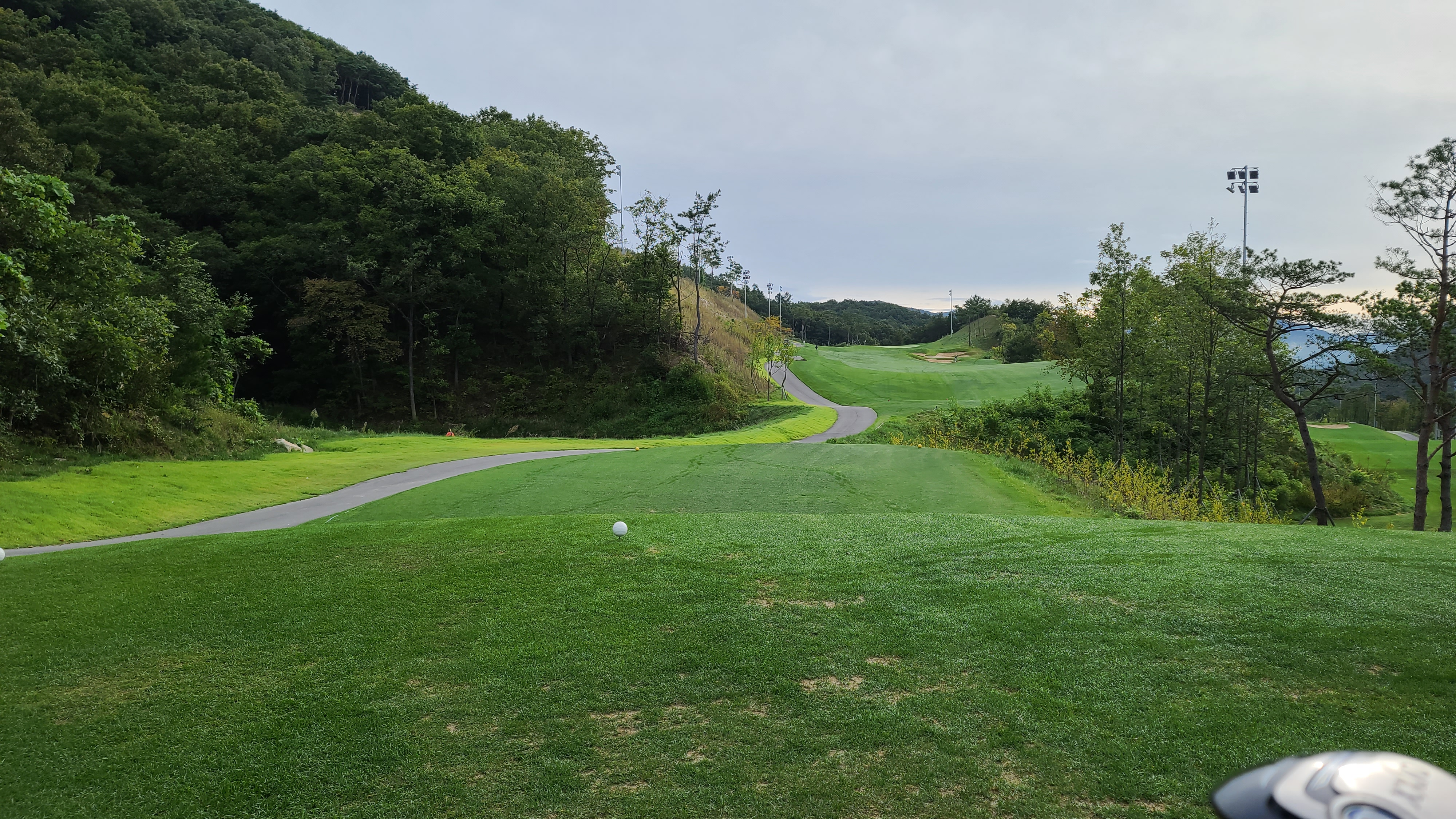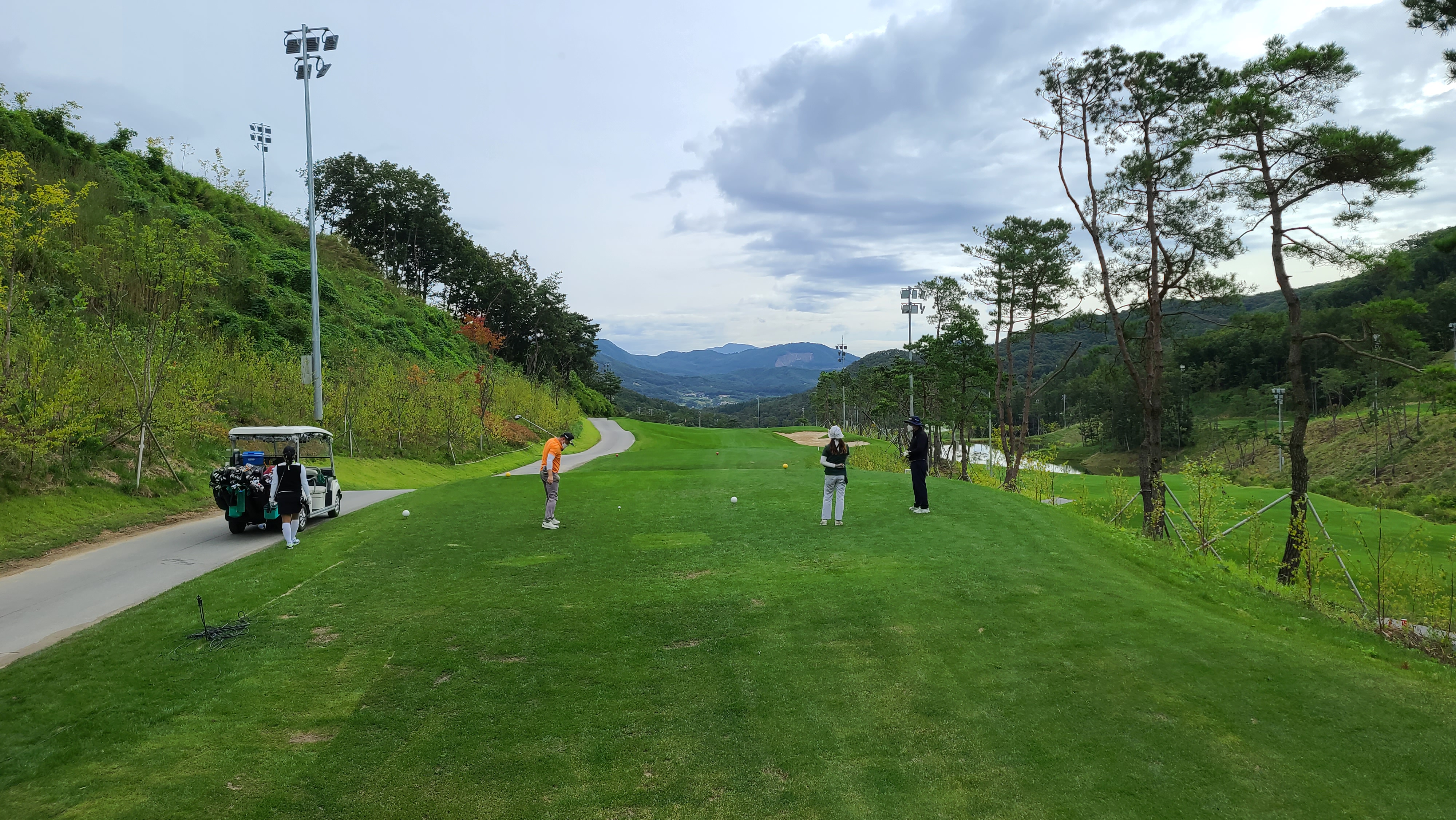 마운틴홀부터 시작 1번부터 파5홀입니다. 좌측으로 휘어진 도그렉홀로서 우측이 OB이기 때문에 좌측을 겨냥하는 것이 좋습니다. 티샷에어리어에 사람이 있어서 뭔가 봤더니 판매용 기념사진을 찍어주시는 분입니다. 첫홀의 부담감에 거리가 긴 파5홀 거기에 사진촬영까지 긴장감을 최대로 이끌어올리고 있습니다.