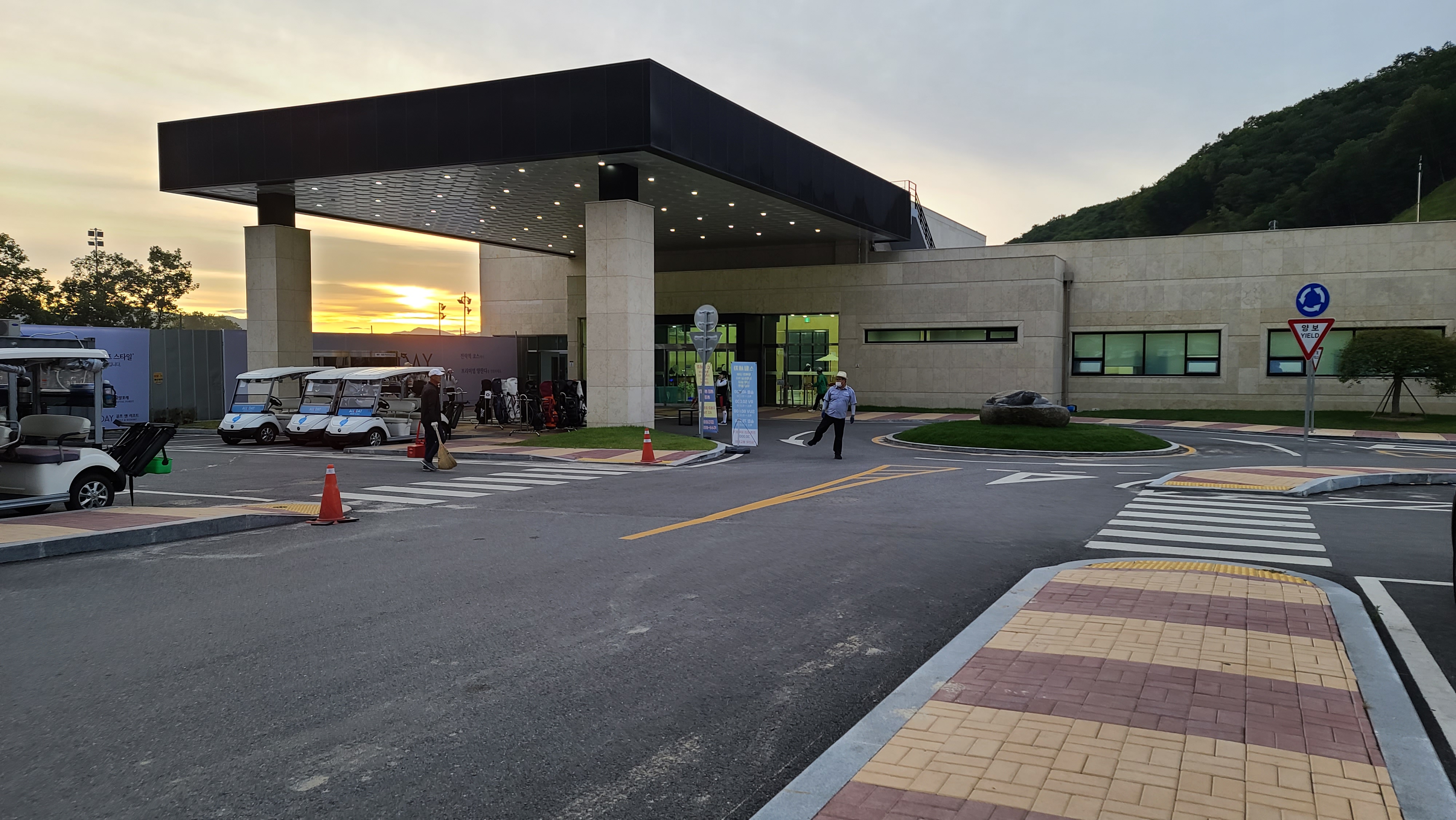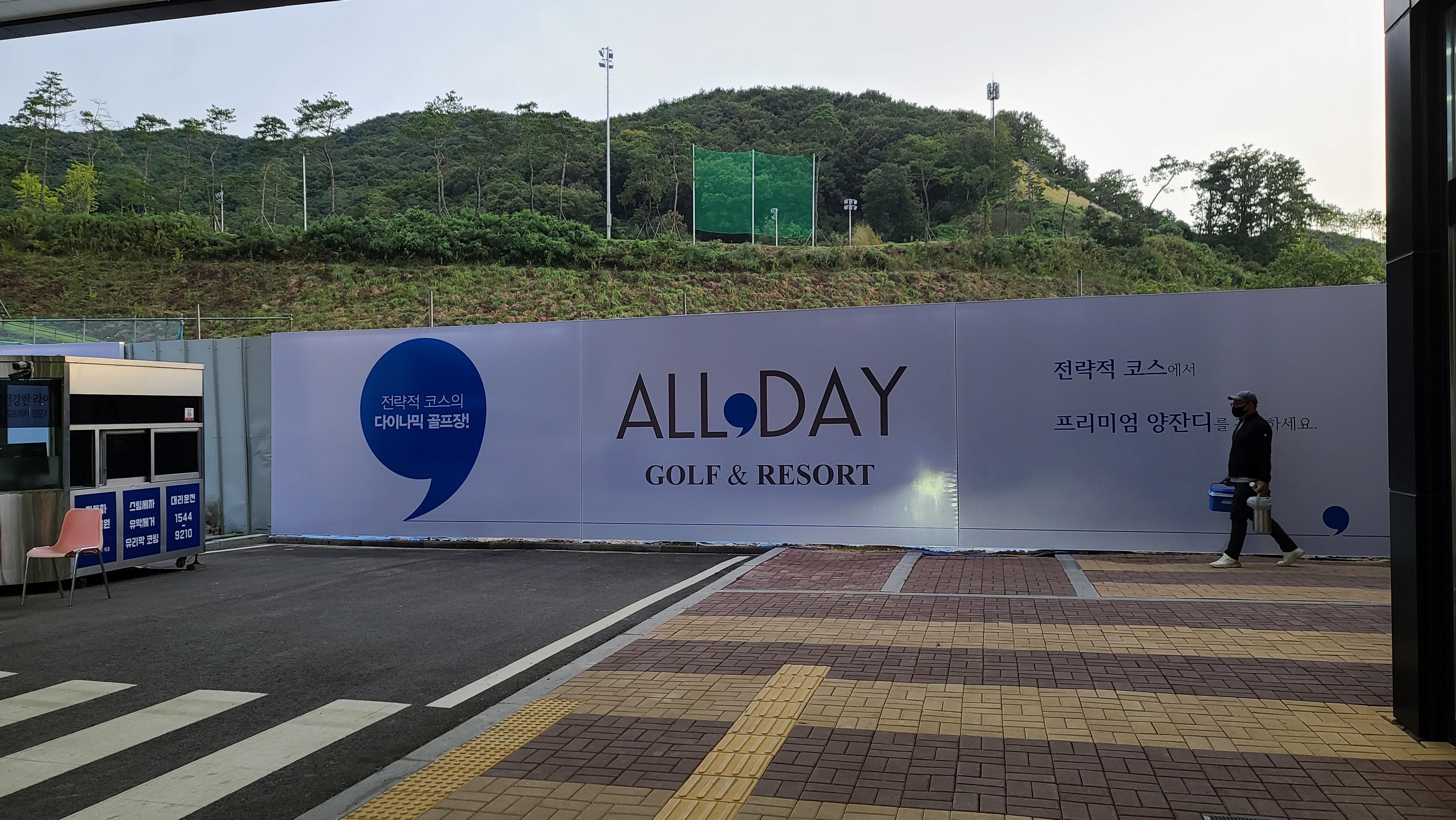충청권에 위치한 충주에 신규 골프장이 오픈했다는 소식을 듣고 방문하여 라운딩을 해보기로 합니다. 클럽하우스에는 골프백을 내려주고 회전형 돌아서 나가게 되어 있는 설계이며, 입구에 올데이CC라고 현수막이 크게 걸려있습니다.