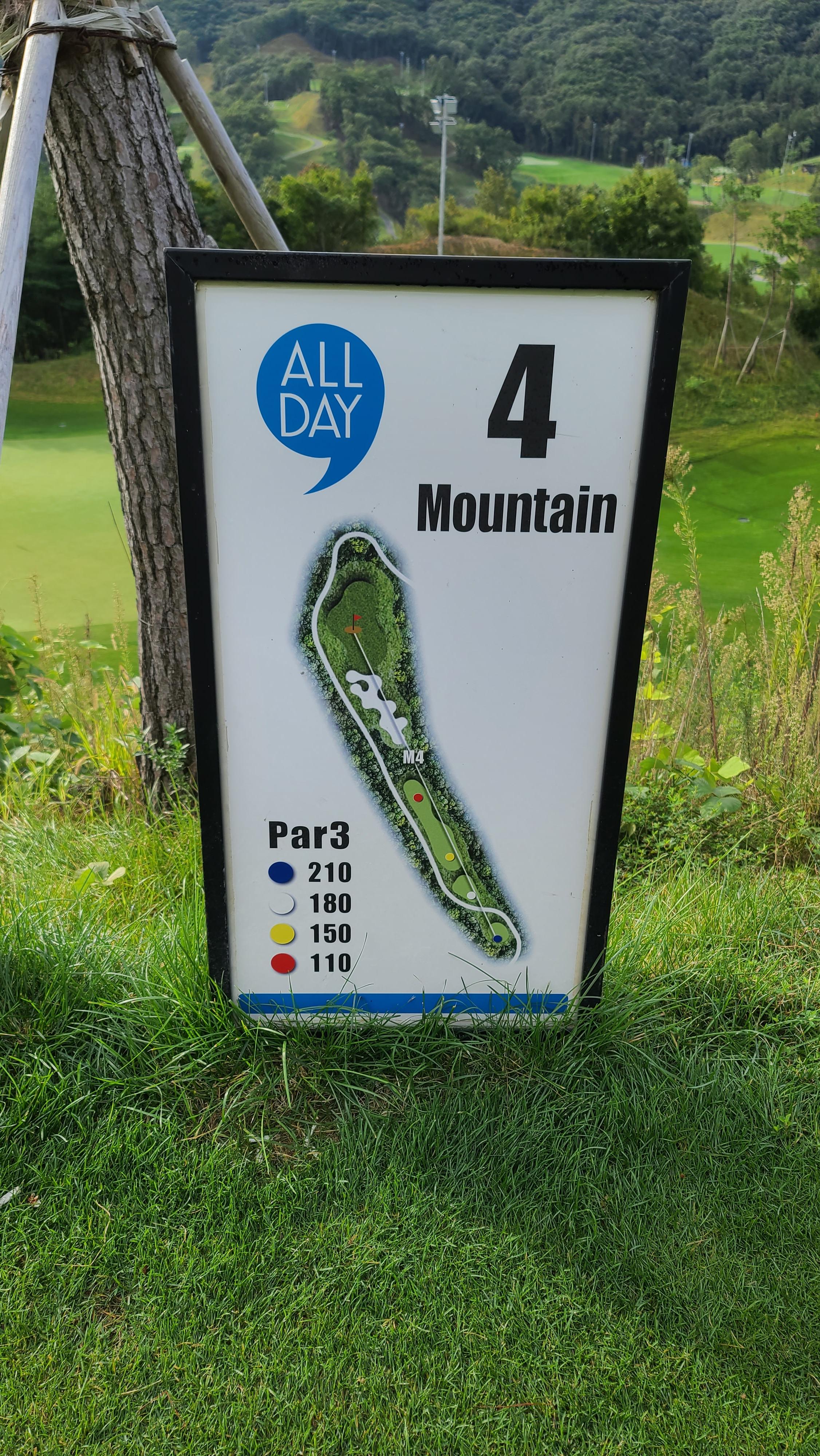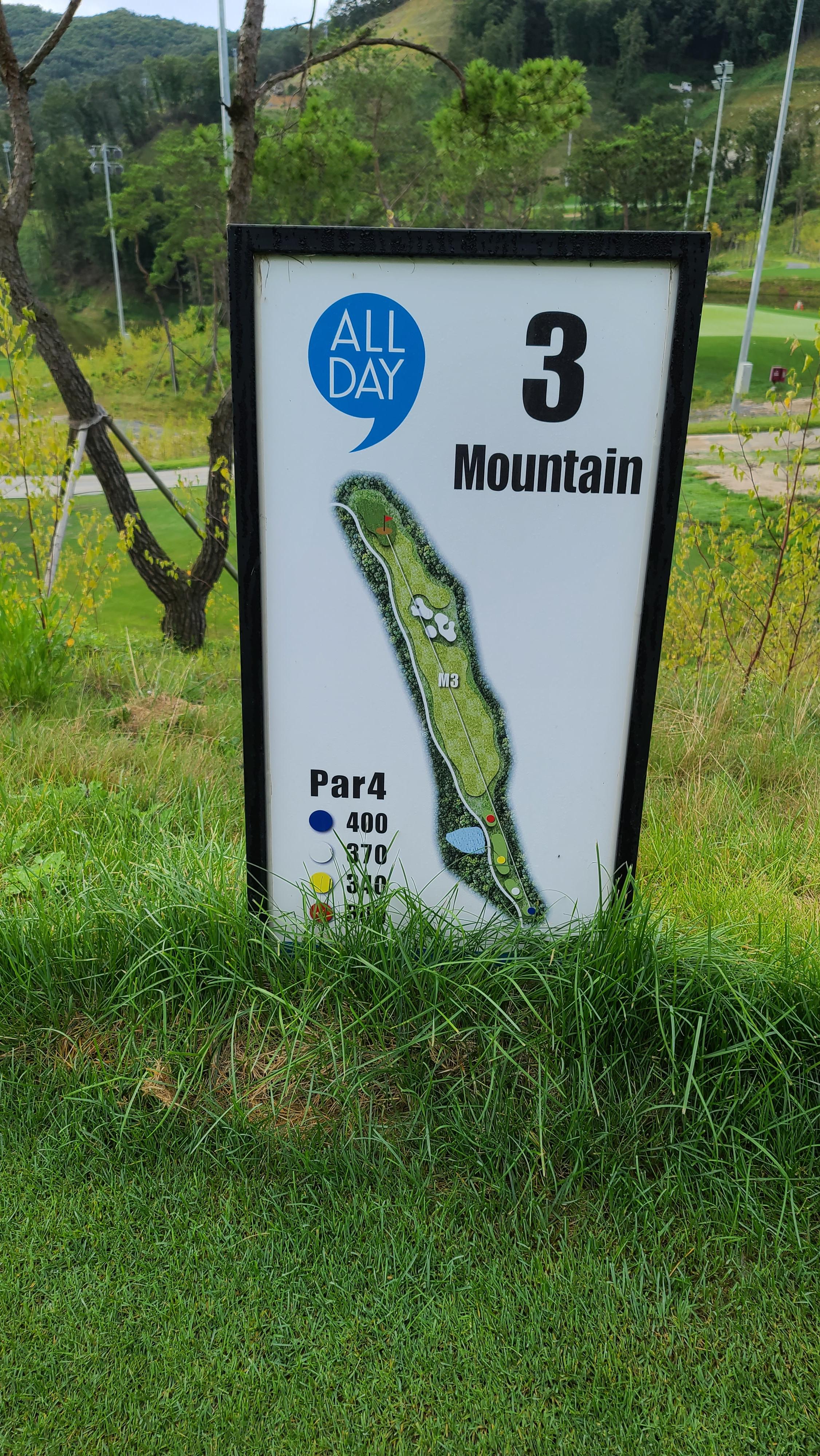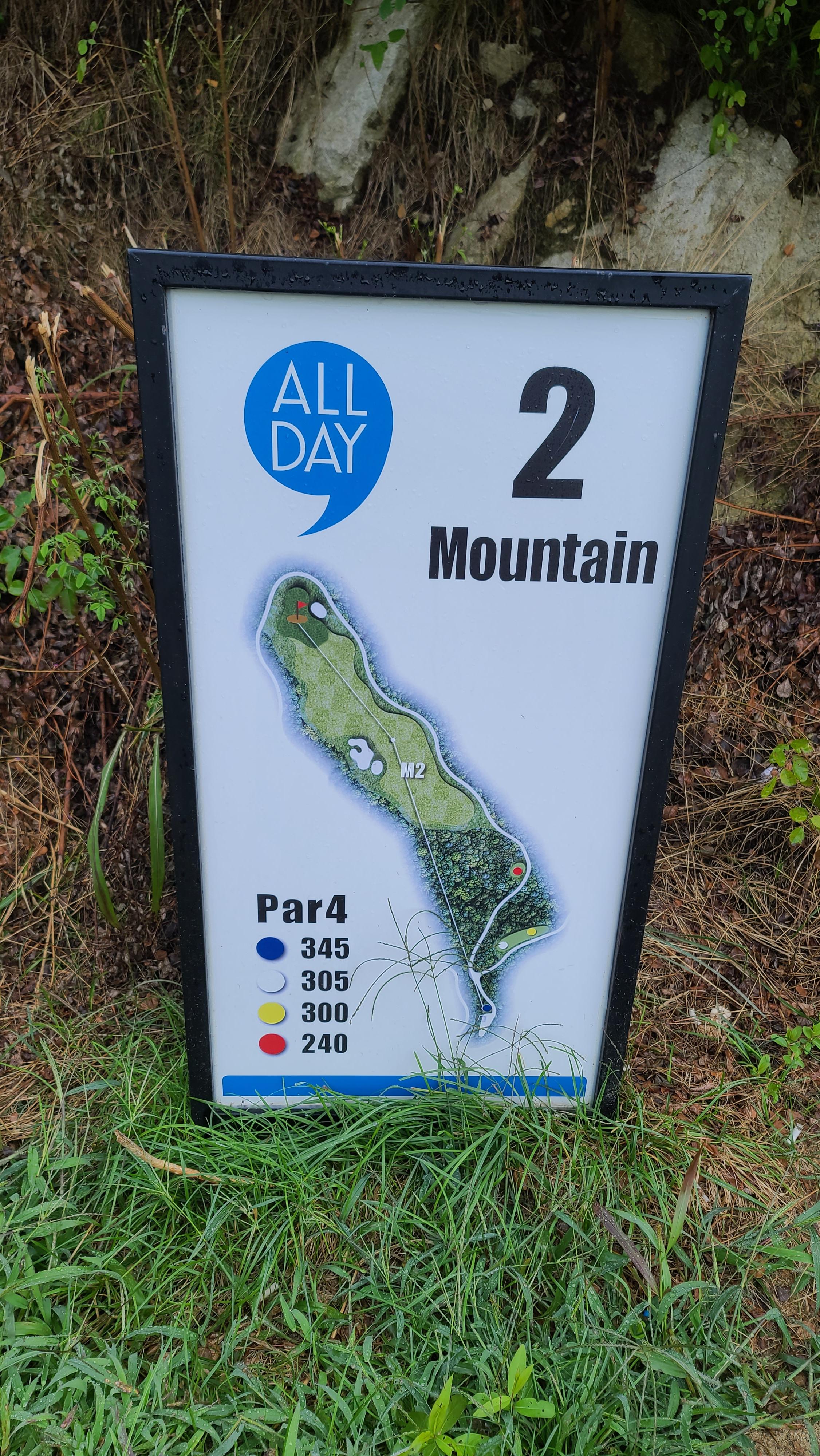마운틴 2번홀은 파4홀이지만 레이디티와 프론트티가 동일 위치에 있는 내리막이 심한 코스입니다. 20m 이상 언덕아래 홀이 위치하고 있어 원온이 가능하기 때문에 남자는 드라이버 사용을 금지하고 있습니다.