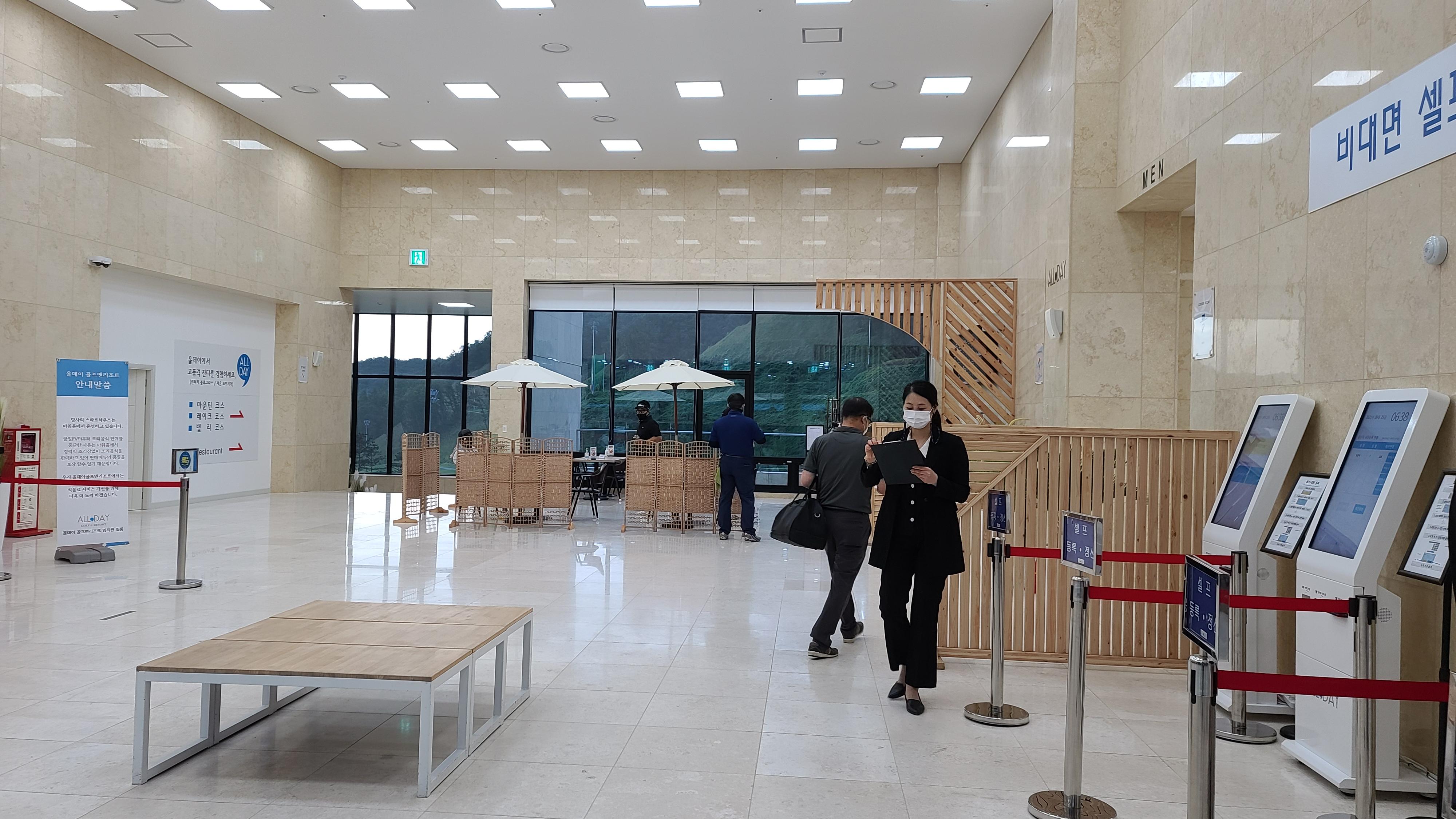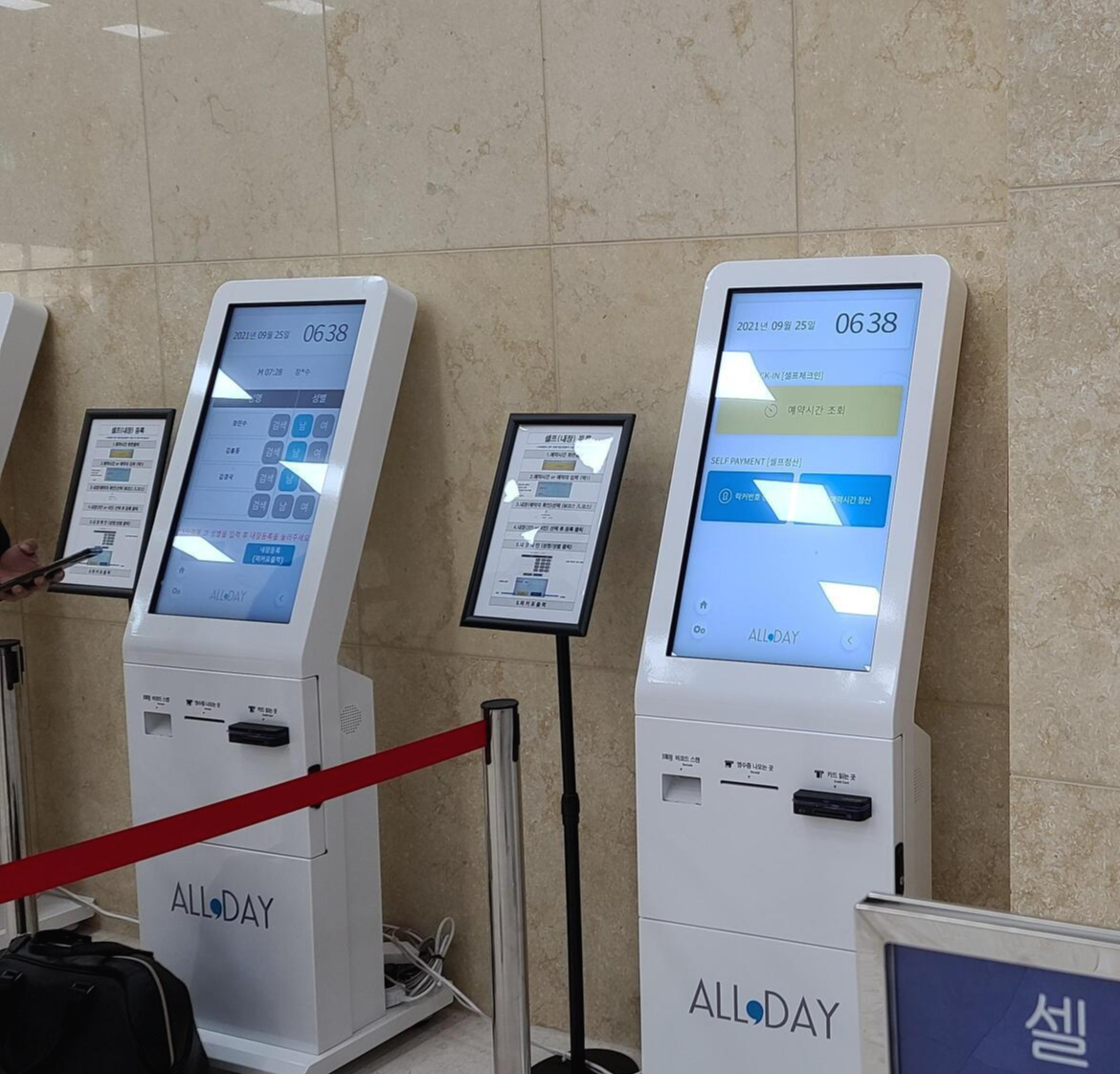 클럽하우스에 들어가니 정면으로는 카페가 보이고 좌측으로는 안내데스크 우측으로 비대면 셀프 체크인 키오스크가 보입니다. 셀크 체크인 키오스크에서 체크인을 하고 락커룸으로 들어갑니다.