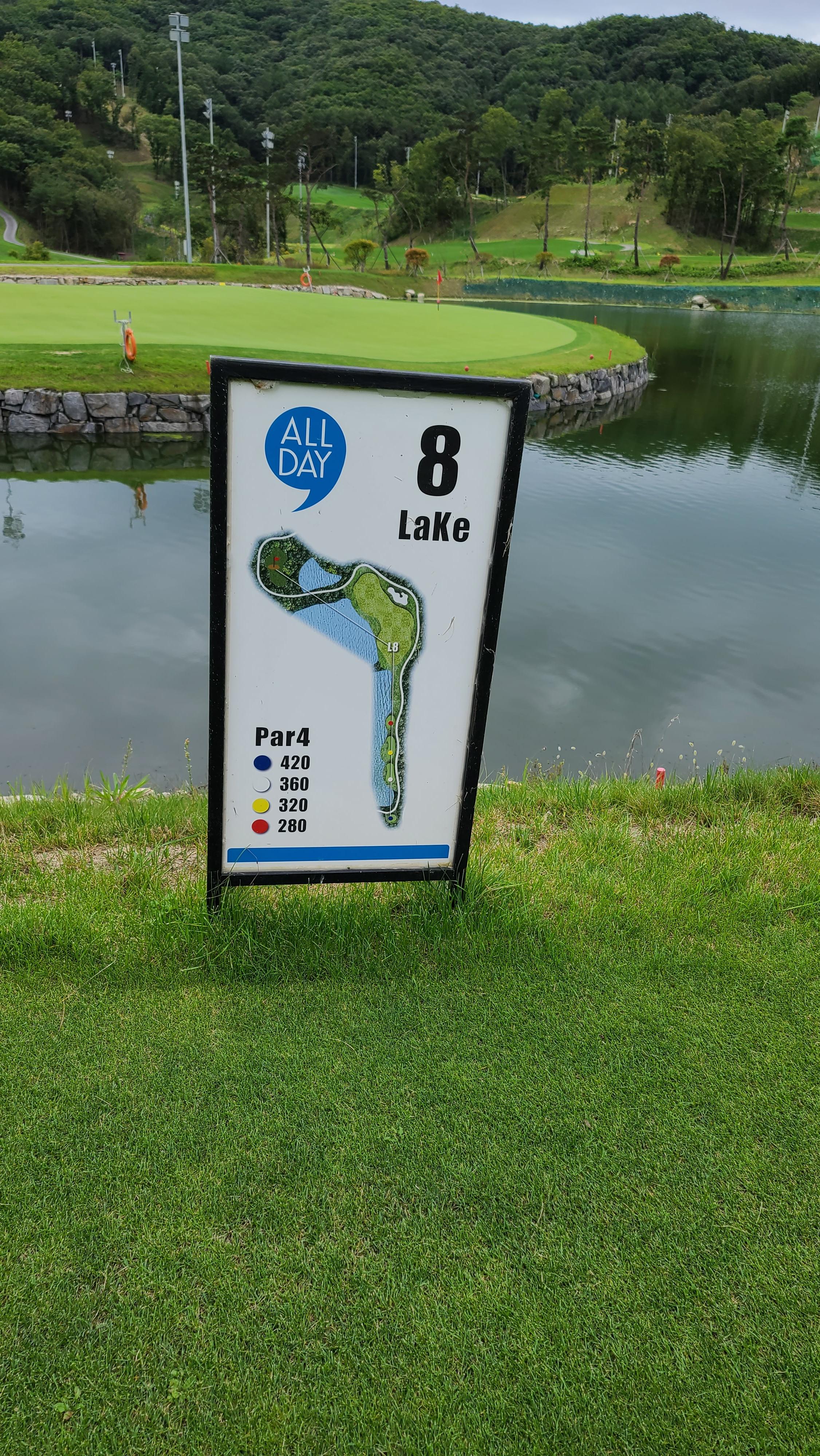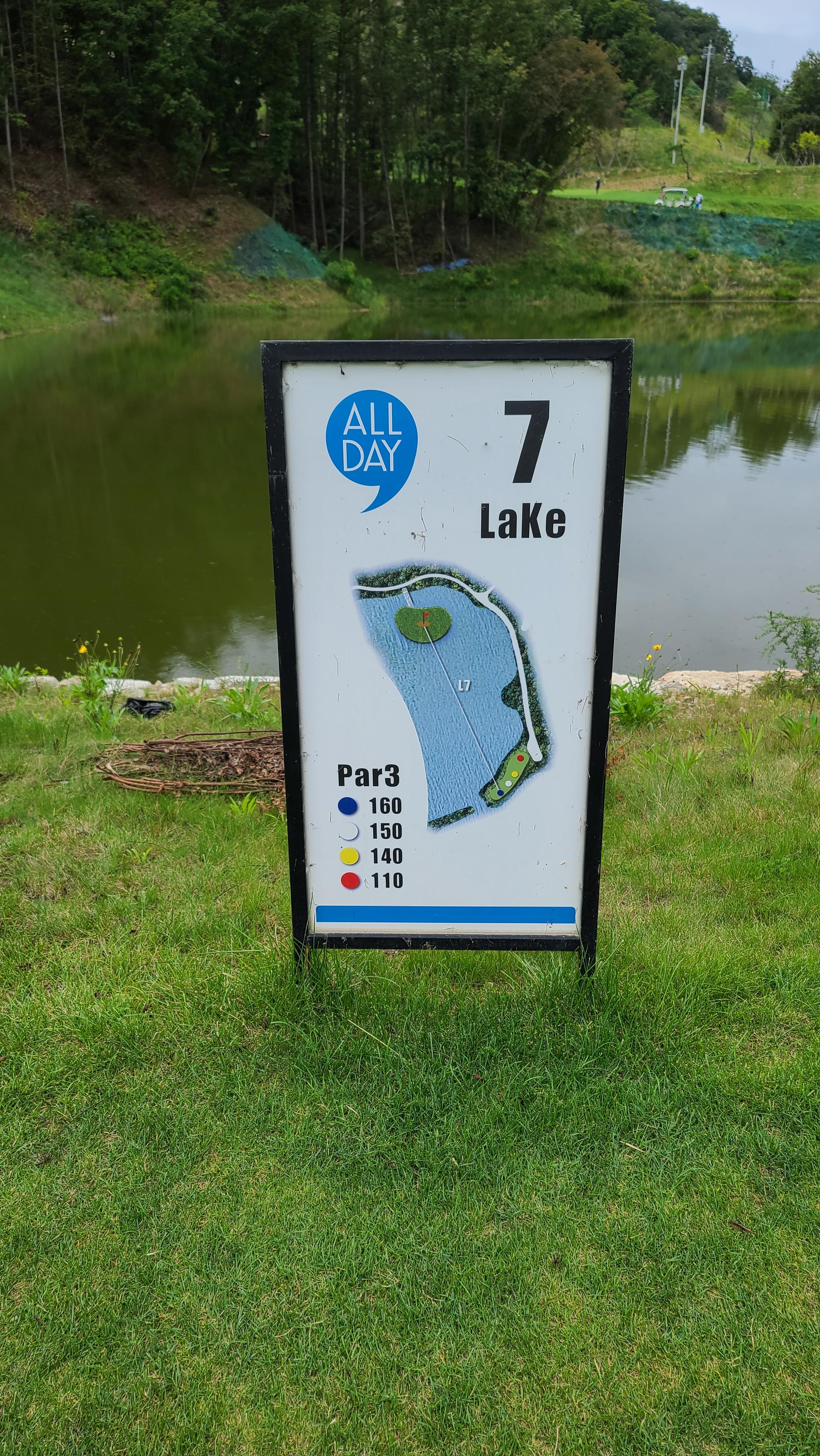 7번 파3홀은 캐디분께서 올데이CC의 시그니처 홀로서 아일랜드홀이라고 합니다. 거리를 보니 150m에 좁은 아일랜드여서 신중히 공략합니다. 잘맞았다고 생각했는데 경사를 타고 물에 빠져 버립니다. 물쪽으로 내리막 경사가 있는데다가 매우 어렵게 앞핀으로 꽂아놨습니다 해저드와 핀까지 거리가 5m가 채 되지 않습니다. PGA투어 프로도 공략이 어려울 정도록 앞핀이기 때문에 로스트볼 수거용 홀이라고 생각하고 비싼공은 쓰지 마시길 바랍니다.